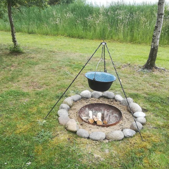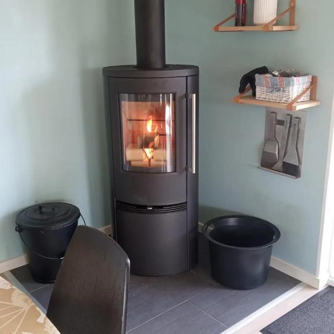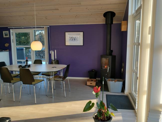 Som et ekstra plus i dette skønne sommerhus med de store vinduer, den fine indretning og den spændende dekorativt brugskunst, er her også en brændeovn, for at skabe den helt rigtige sommerhusstemning.