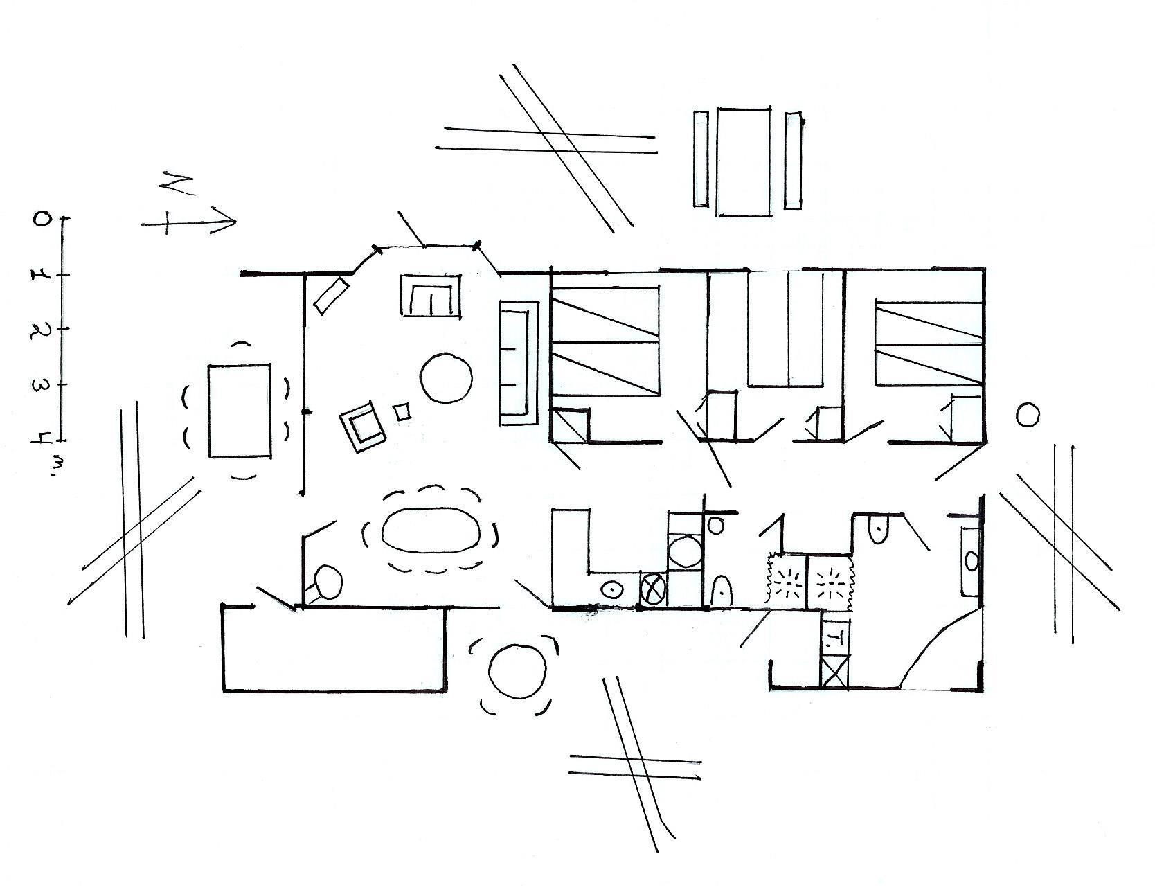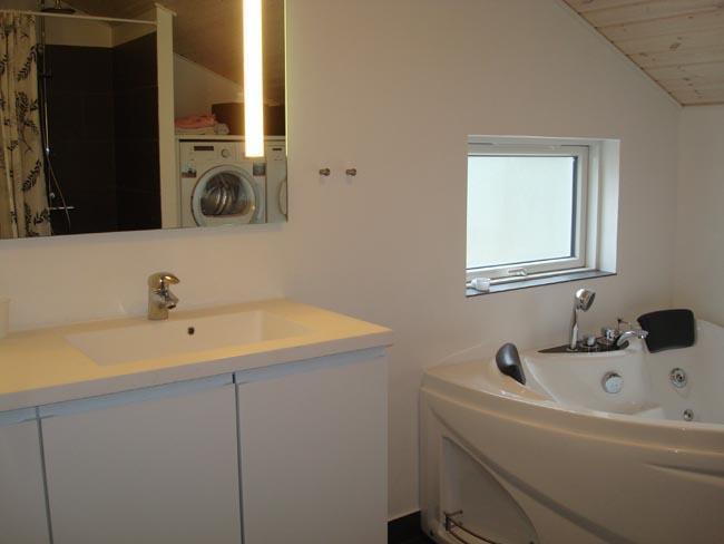 Selve huset er stort og rigtig indbydende at træde ind i. Her mødes man af en entre, hvor loftet går i kip. I denne lyse entre er her to døre på hver side. På højrehånd mødes man af husets to ud af tre værelser, hvor alle har en dobbeltseng. På venstrehånd mødes man af to lækre badeværelser, begge med brusebad, men den ene har den ekstra luksus, at have spabad. Hvilket er helt ideelt at bruge, til at slappe fuldstændig af i, med et glas champagne i hånden og stearinlys i vindueskarmene. Ingen bedre måde at koble af fra hverdagen på.