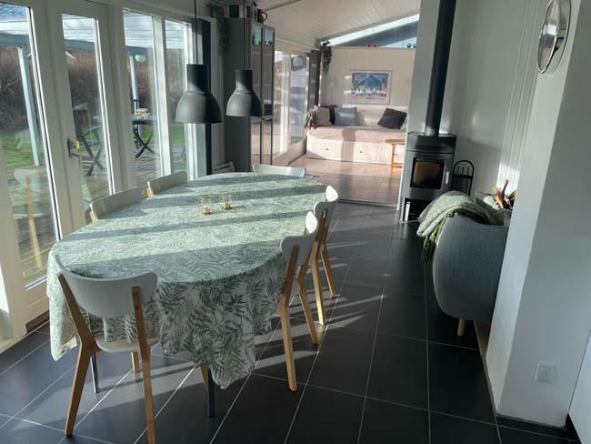 Når man træder ind ad fordøren til dette hus, bliver man mødt af et lyst og lækkert køkkenalrum, som alligevel er delt op i nogle sektioner. Først er køkkenet, som har alle de funktioner der måtte være i et køkken. På den anden side af halvvæggen finder man et sofabord, med to stole og en sofa. Her kan man nyde hinandens nærvær efter en lang dag på stranden eller oppe i skoven. Her er der også et tv, hvilket man faktisk også kan følge med i oppe fra køkkenet af. Ved siden af denne sektion er her et stort spisebord, hvor der er plads til, at hele familien kan samles. I denne afdeling med køkken, spisebord og sofa, er her også en brændeovn, som er med til at skabe den unikke stemning, som man finder i dette hus. For at bryde de hvide moderne linjer, har ejerne valgt at placere et ældre skab og en matchende stol i dette rum, hvilket skaber en perfekt kontrast til det de rene linjer.