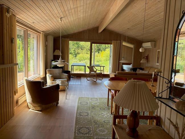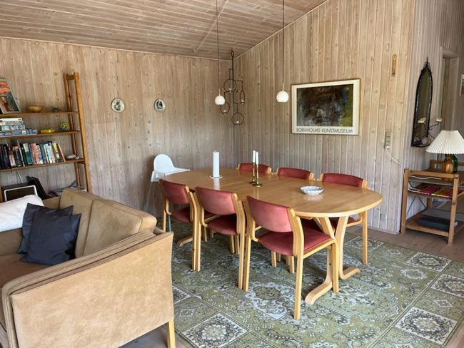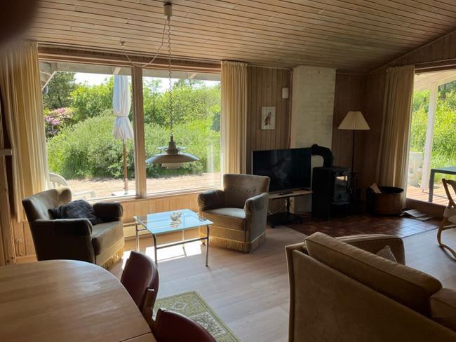 Den tidligere nævnte stue har både en afdeling med spisebord, samt to lækre sofaer, hvorfra man kan nyde naturen ud af de store vinduer, se tv eller nyde varmen og ilden i den smukke og unikke brændeovn.