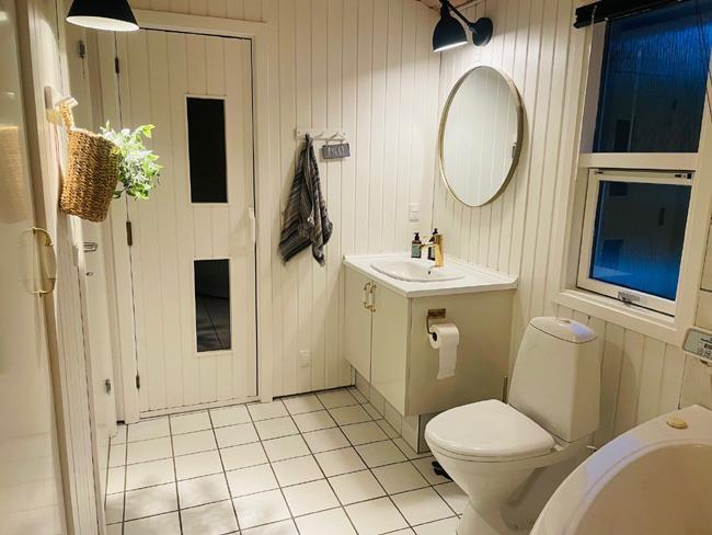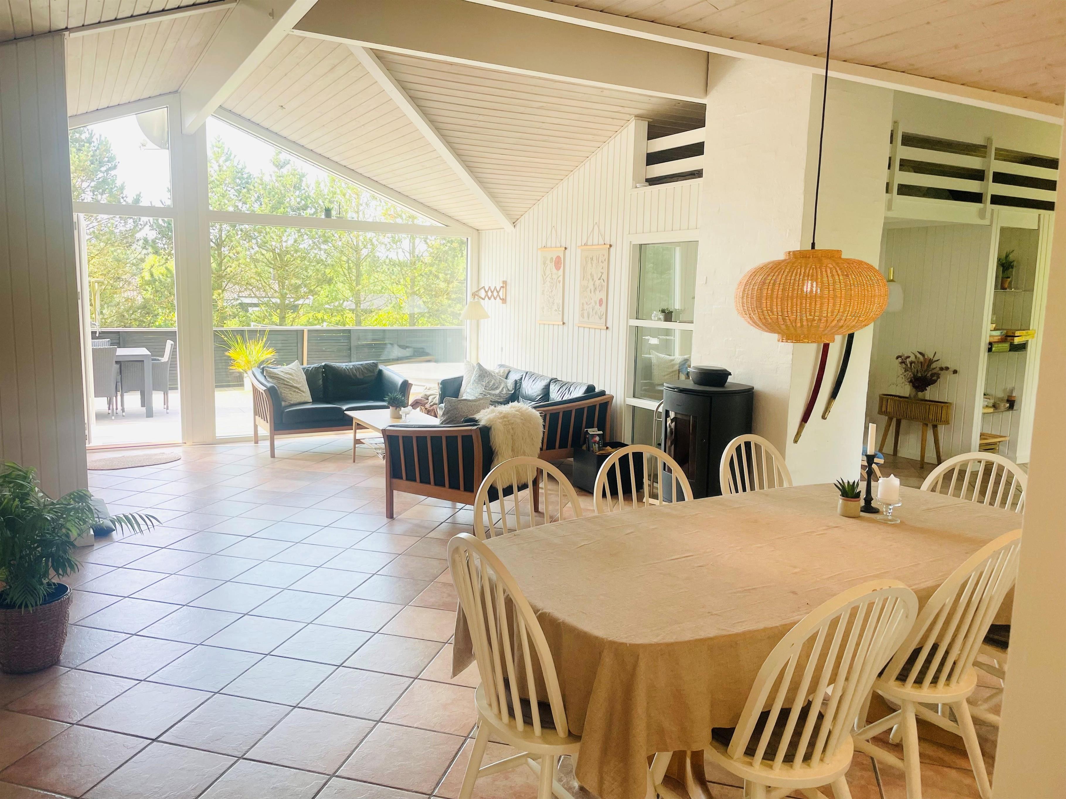 Indenfor er huset lyst og åbent med kip i lofterne, hvilket giver en følelse af rummelighed. Sommerhuset byder på to hemse, hvor de større børn kan have deres egen hyggekrog. Der er også to badeværelser, hvoraf det ene er udstyret med både spabad og sauna.