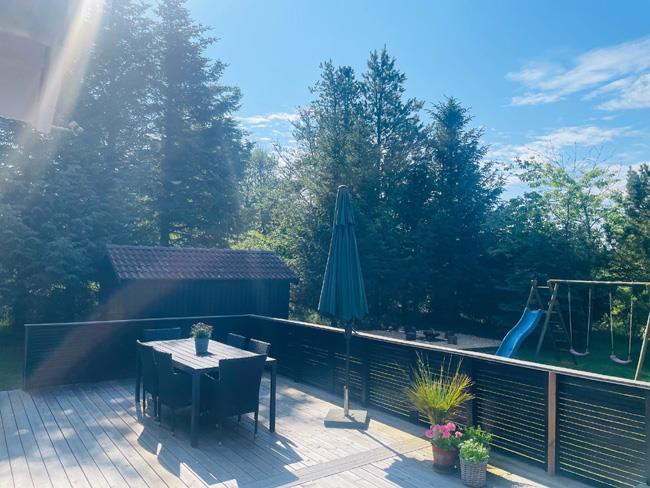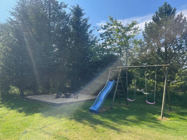 Grunden er stor og åben, ideel til udendørs aktiviteter som boldspil og kongespil på græsset. Til børnene er der et legestativ med både gynger og rutsjebane. Derudover er der både carport og et brændeskur. Huset har to store terrasser samt en mindre fliseterrasse, alle med direkte adgang til huset. Der findes også et hyggeligt bålsted på grunden, hvor man kan samles omkring flammerne – husk blot selv at medbringe brænde.
