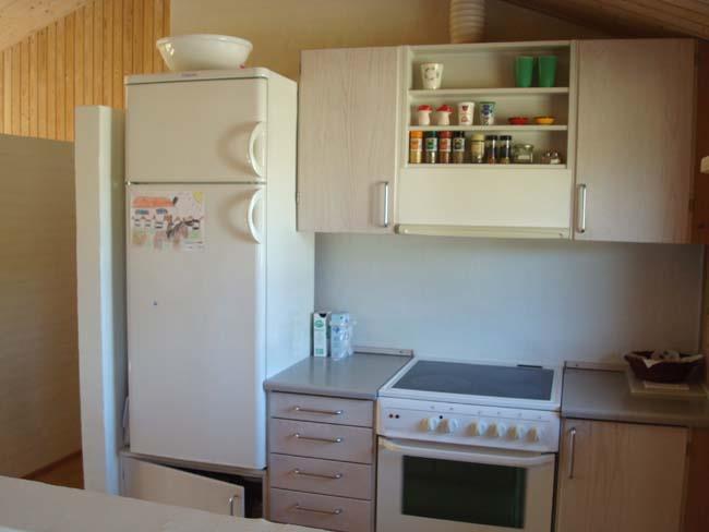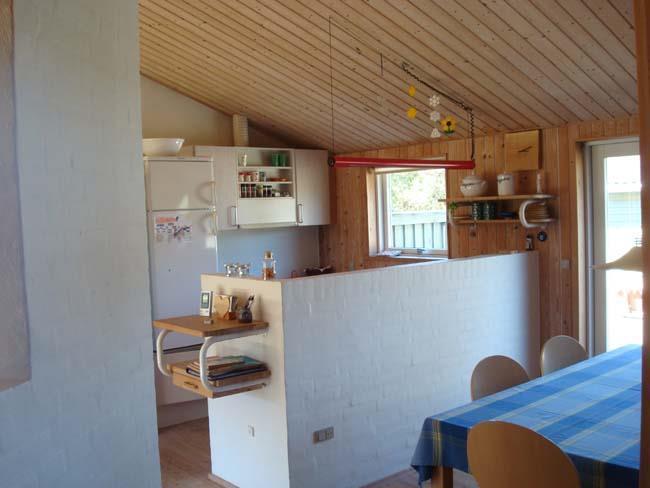 Når man træder ind i dette hus, mødes man af et rum som går op i kip. Denne entré hænger sammen med resten af det store og lyse køkken alrum. Her går man gennem den åbne gang indtil et hjertevarmt rum med plads til hele familien. Her finder man et lyst fint køkken, med halvvæg omkring sig. På den anden side af denne halvvæg er det store spisebord, hvor her både er en lang bænk og stole til. Centrummet i dette rum er en unik og smuk brændeovn, som sagtens vil kunne varme hele huset op. Resten af dette rum består af bløde møbler i to grupper. Den ene sofa er ved siden af brændeovnen, hvor man kan sidde og nyde varmen med en god bog eller se en film i fjernsynet. Har man lyst til familiehygge, kan man tage et af de mange brætspil som er på hylden over sofaen og tage det hen til sofabordet, som er omgivet af to lænestole og to bløde lædersofaer.