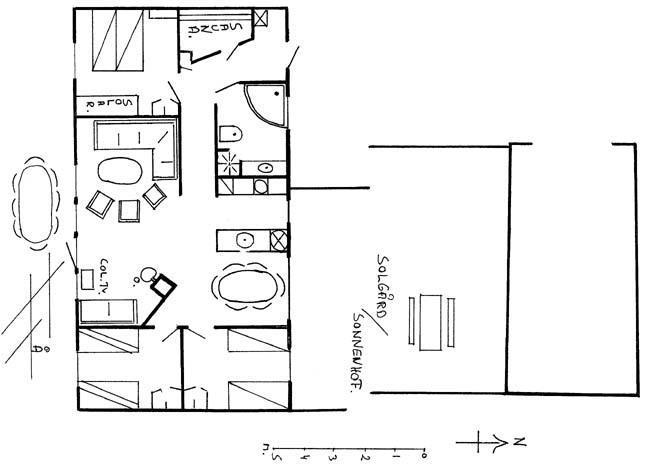 Huset har et badeværelse, hvor der desuden er spabad, til når man skal forkæle sig selv og nyde at man er på ferie. Endvidere har huset tre soveværelser, hvor den ene er med to køjesenge, og de andre to har en dobbeltseng hver.