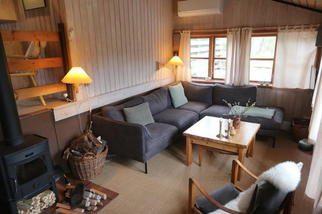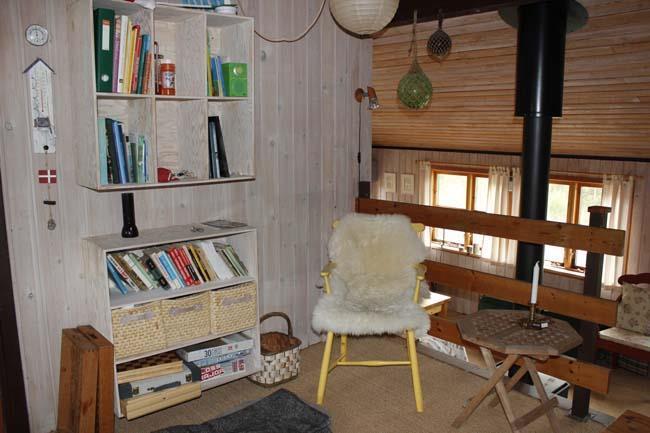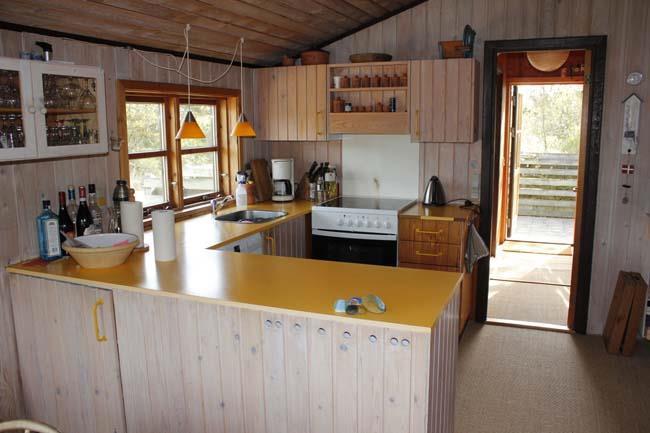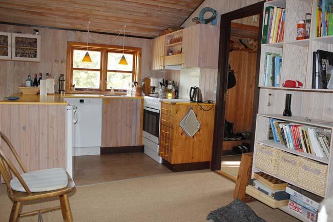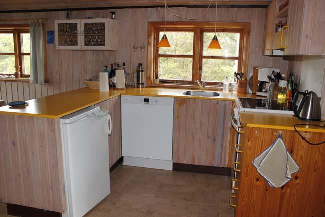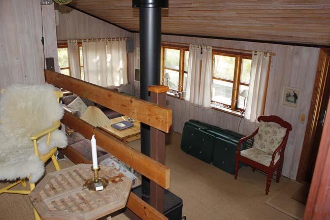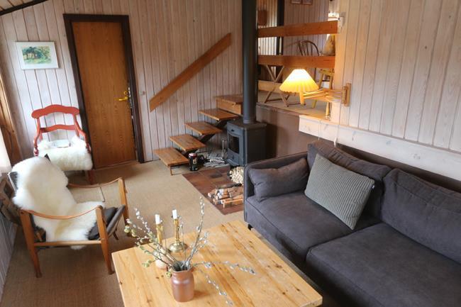 Huset har en unik indretning med sin varme sjæl og sit niveau forskel. Huset har et fint samtalekøkken, hvor der er plads til at familien kan hygge sig med fællesmadlavningen. Her finder man også det søde spisebord, med de rigtig flotte gammeldags stole. Så hyggeligt og flot. Dette rum har en smuk udsigt udover området. Dette rum går i kip og har en sjov ribbe, hvor de stærke kan øve nogle bull-ups. For at komme til stuen skal man gå ned ad en trappe. Hernede er den hyggeligste stue, som vil sætte rammerne for mange hyggelig timer med familien med kort og brætspil. Som en ekstra hyggelig faktor i denne stue, er her en brændeovn, som hele familien kan nyde varmen fra. Huset har generelt en masse hyggekroge, hvor man kan sidde og læse en god bog.
