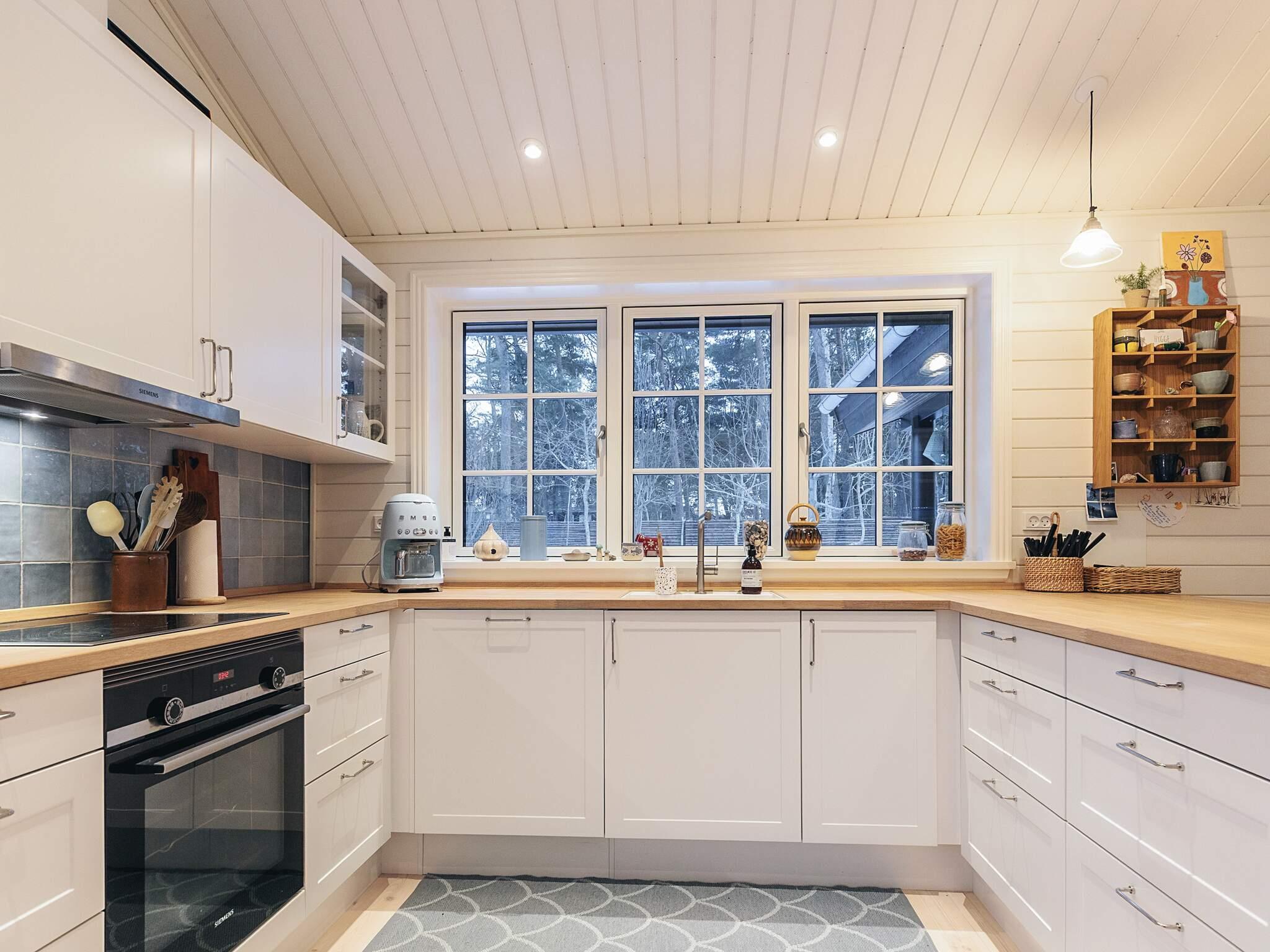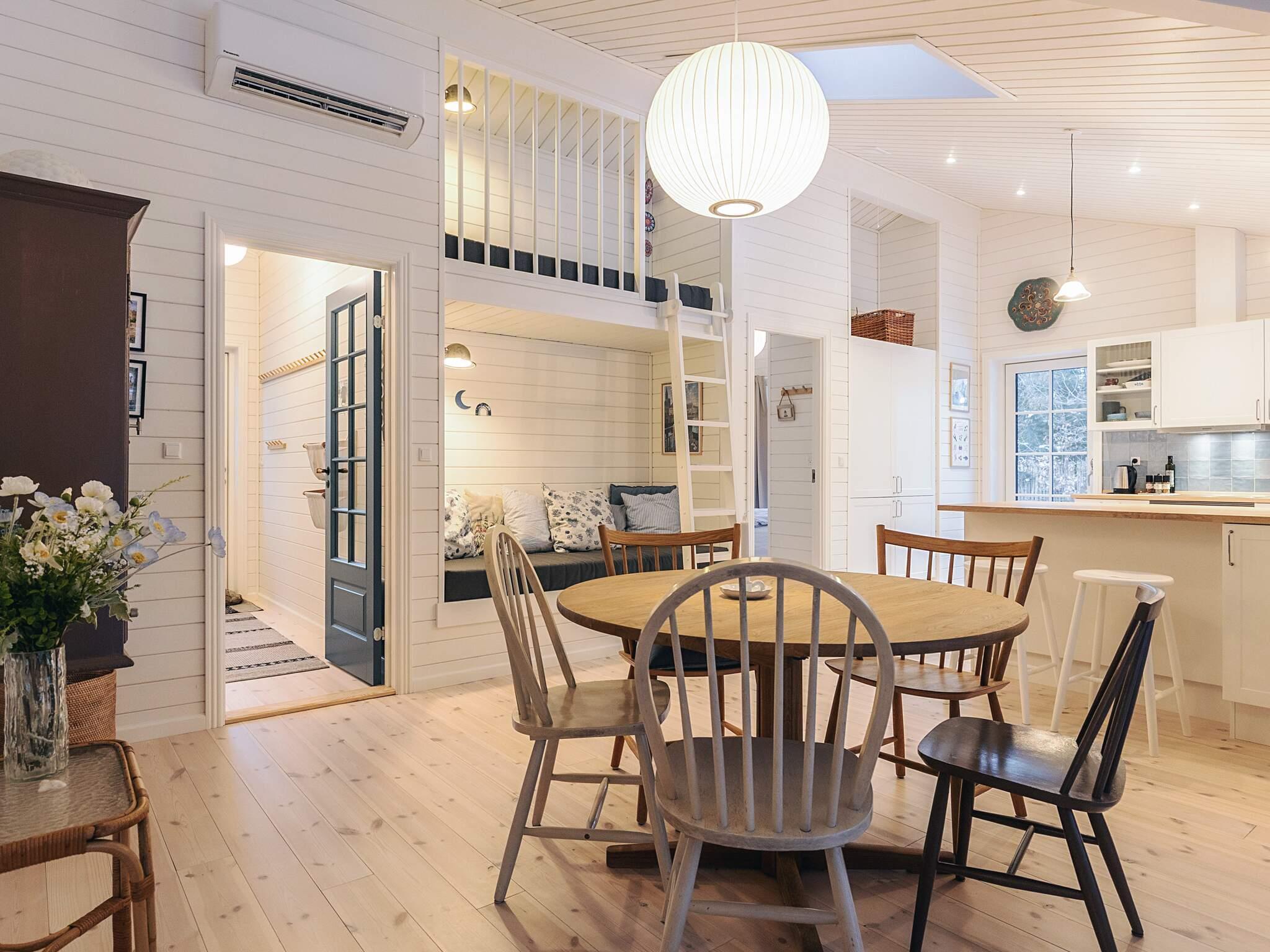 Dette charmerende feriehus tilbyder masser af plads til familier eller grupper med tre komfortable soveværelser, herunder et med en dobbeltseng, et med tre enkeltsenge og et andet med en dobbeltseng. Derudover er der en alkove med to ekstra senge, som er ideel til større grupper eller børn. Det hyggelige familierum har en brændeovn, perfekt til afslapning efter en dag med eventyr. Huset er udstyret med et velindrettet køkken med bl.a. elkomfur, køle-fryseskab, mikroovn, kaffemaskine og opvaskemaskine, så det er nemt at tilberede måltider.