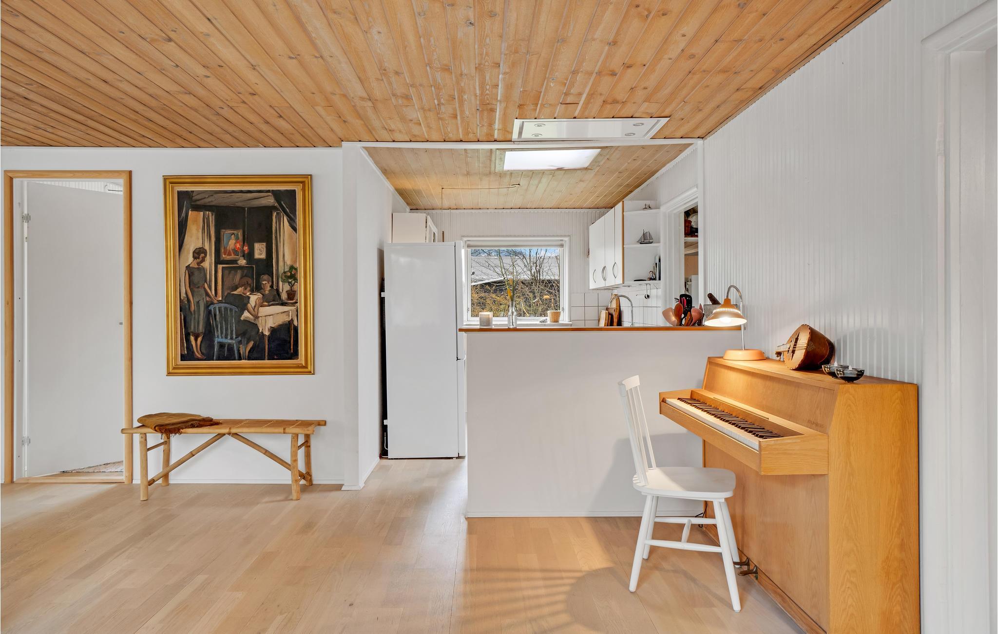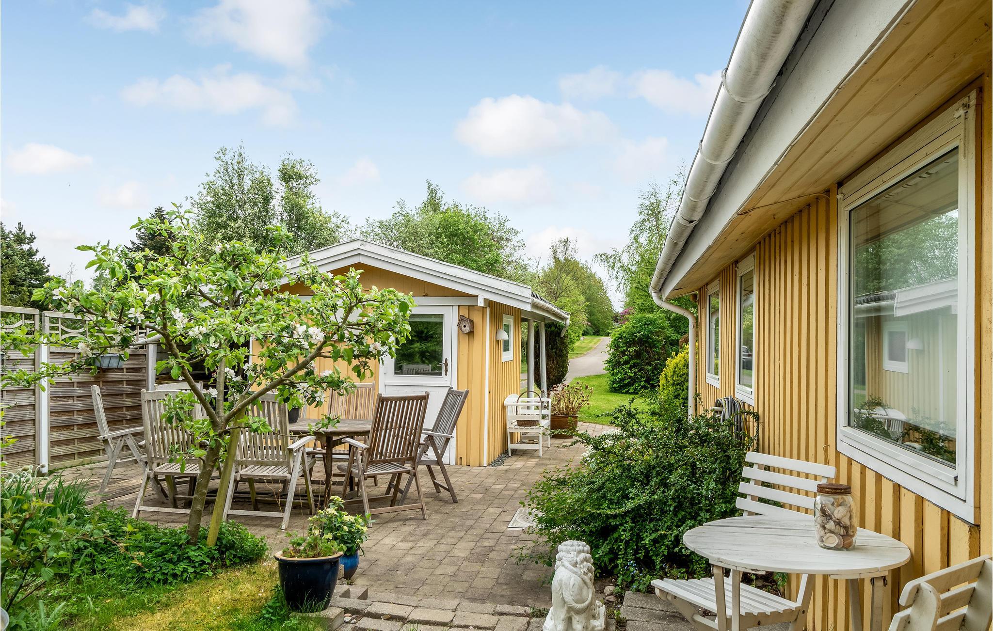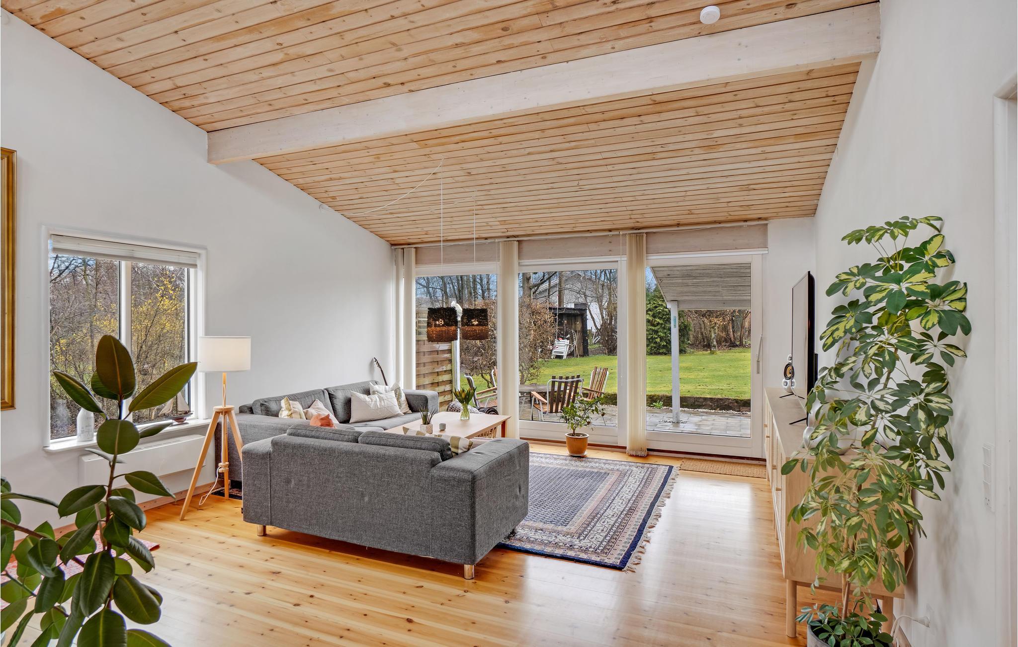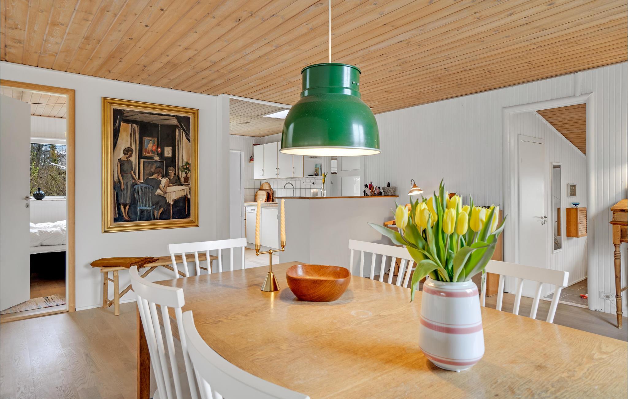 Man mærker hurtigt, hvordan feriestemningen breder sig, når man træder ind på denne skønne grund, hvor alt ånder fred og ro. Her ligger dette charmerende, lysegule hus, som præsenterer sig hyggeligt og gennemført med lækre indretningsløsninger og et behageligt lysindfald fra flere vinkler. I stuen kan alle hygge sig med hver deres aktiviteter, uanset om man helst vil sidde med en bog, spille brætspil eller give et nummer på klaveret. I vinterhalvåret kan I tænde op i brændeovnen, og fra forårssæsonen er det skønt at sætte sig ud med en kop kaffe på den overdækkede terrasse eller ved bålstedet, hvor der er siddepladser til alle.