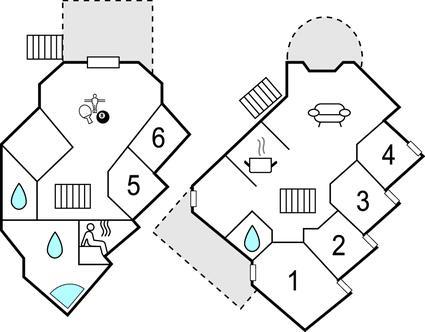 I stuen er der en vinkeltrappe til underetagen. Her finder I et dejligt opholdsrum, hvor der er mulighed for at dyste med familien i spil og billard. Der er to gode badeværelser, hvoraf det ene er med spa, og sauna. Fra saunaen i underetagen kan I løbe direkte ud i havet. Rundt om feriehuset er der flere mulighederfor at sidde og nyde solen eller finde læ for vinden.