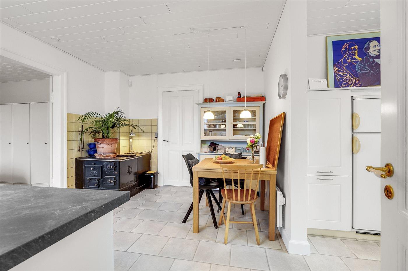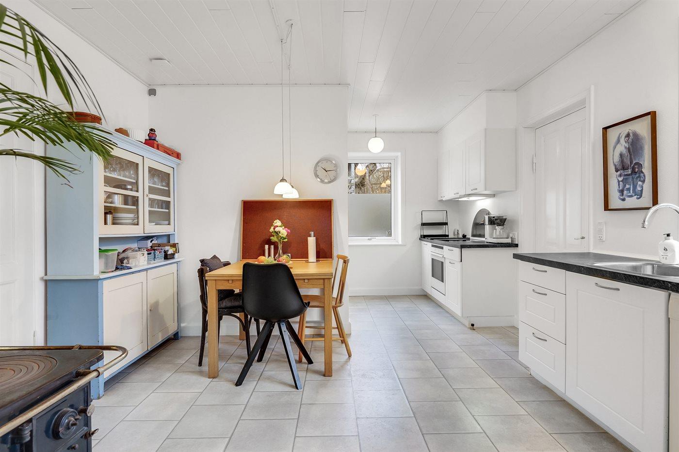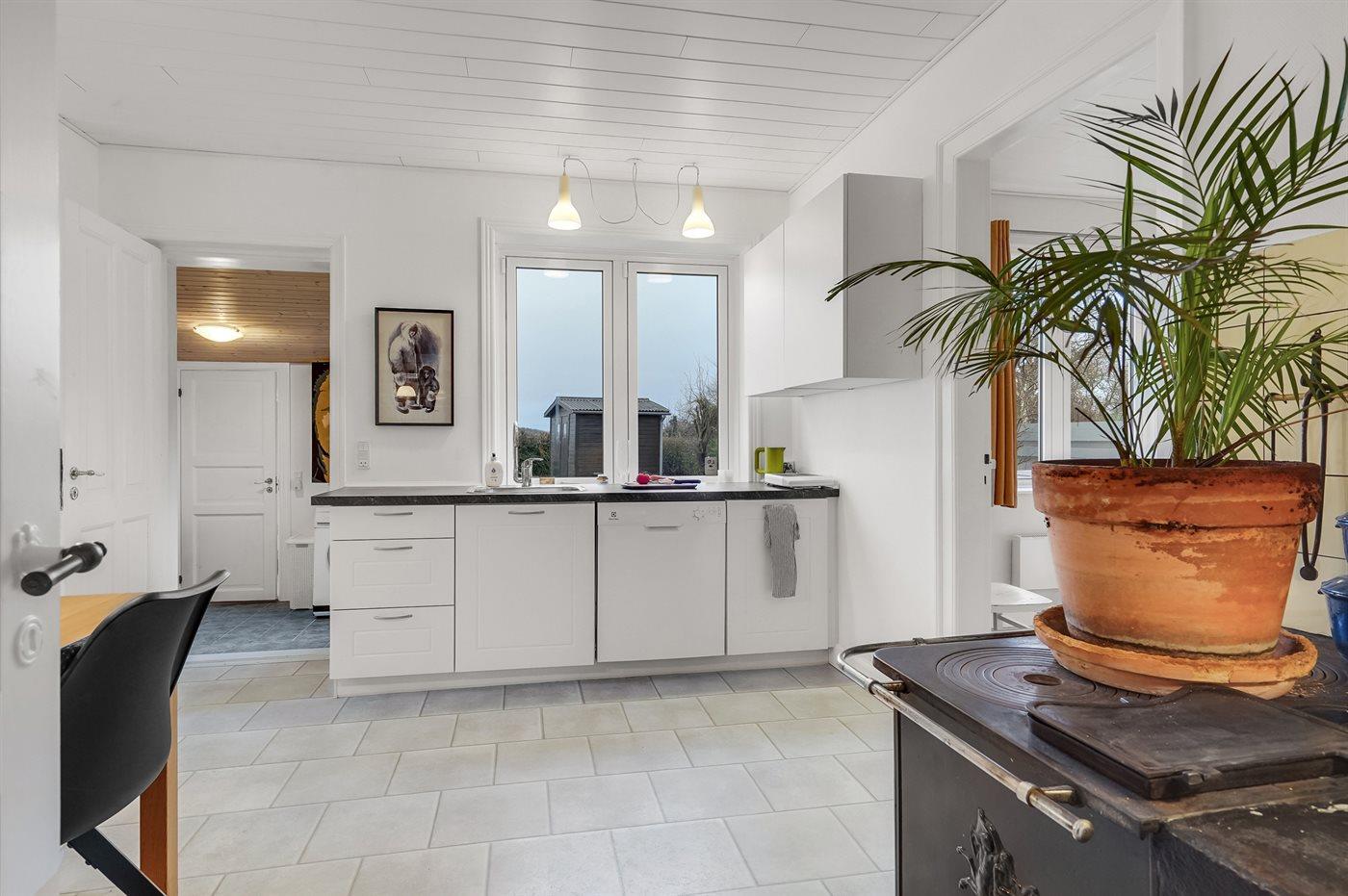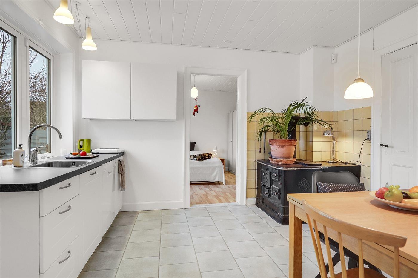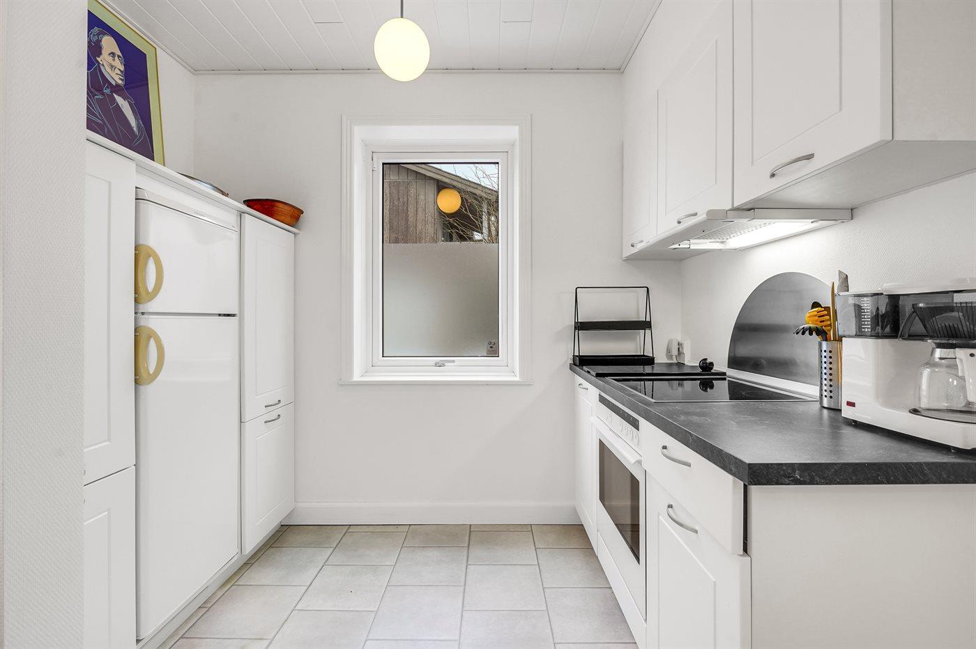 Køkkenet er udstyret med 1 køleskab. Der er 4 keramiske kogeplader, varmluftovn samt opvaskemaskine.