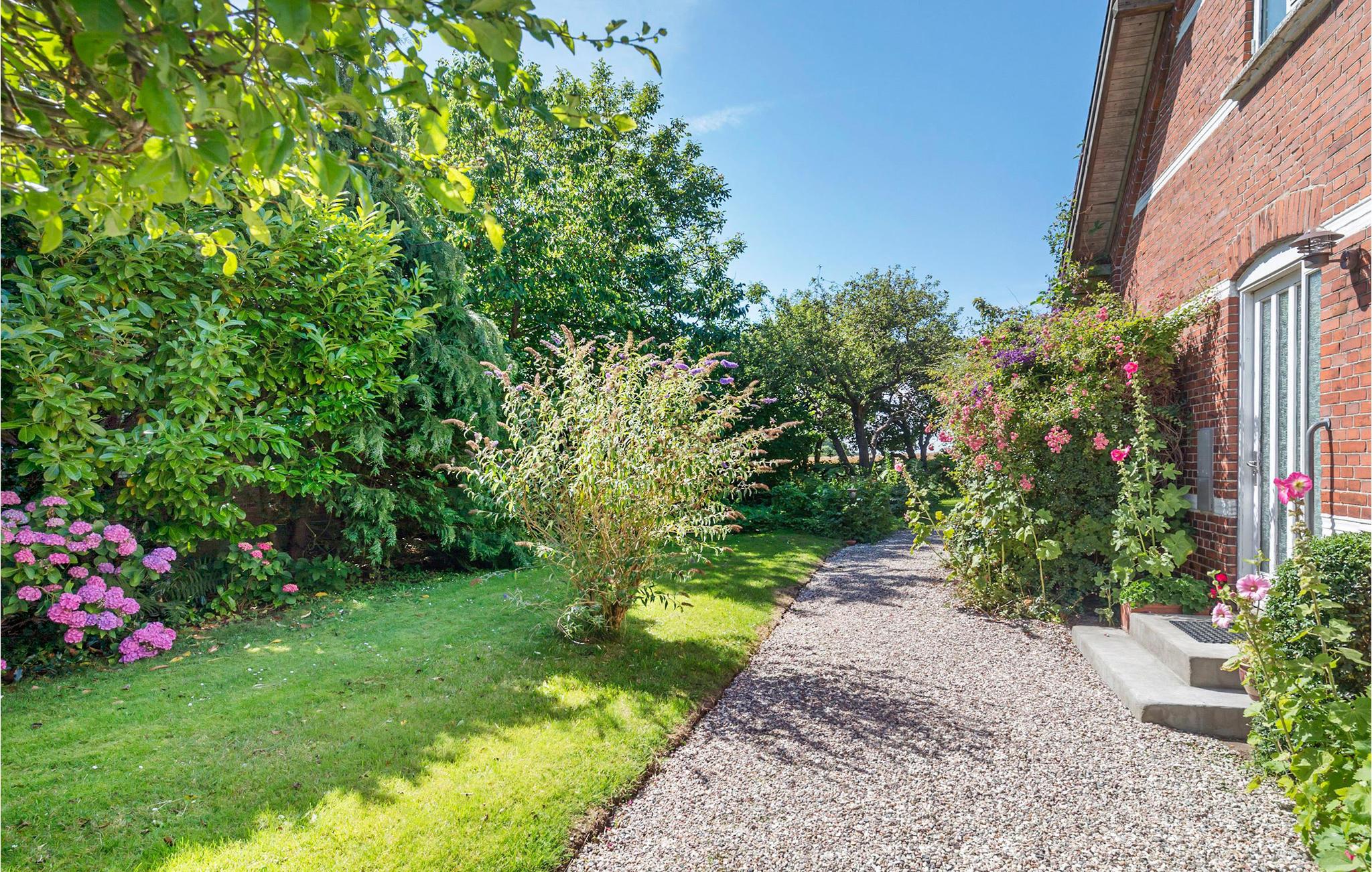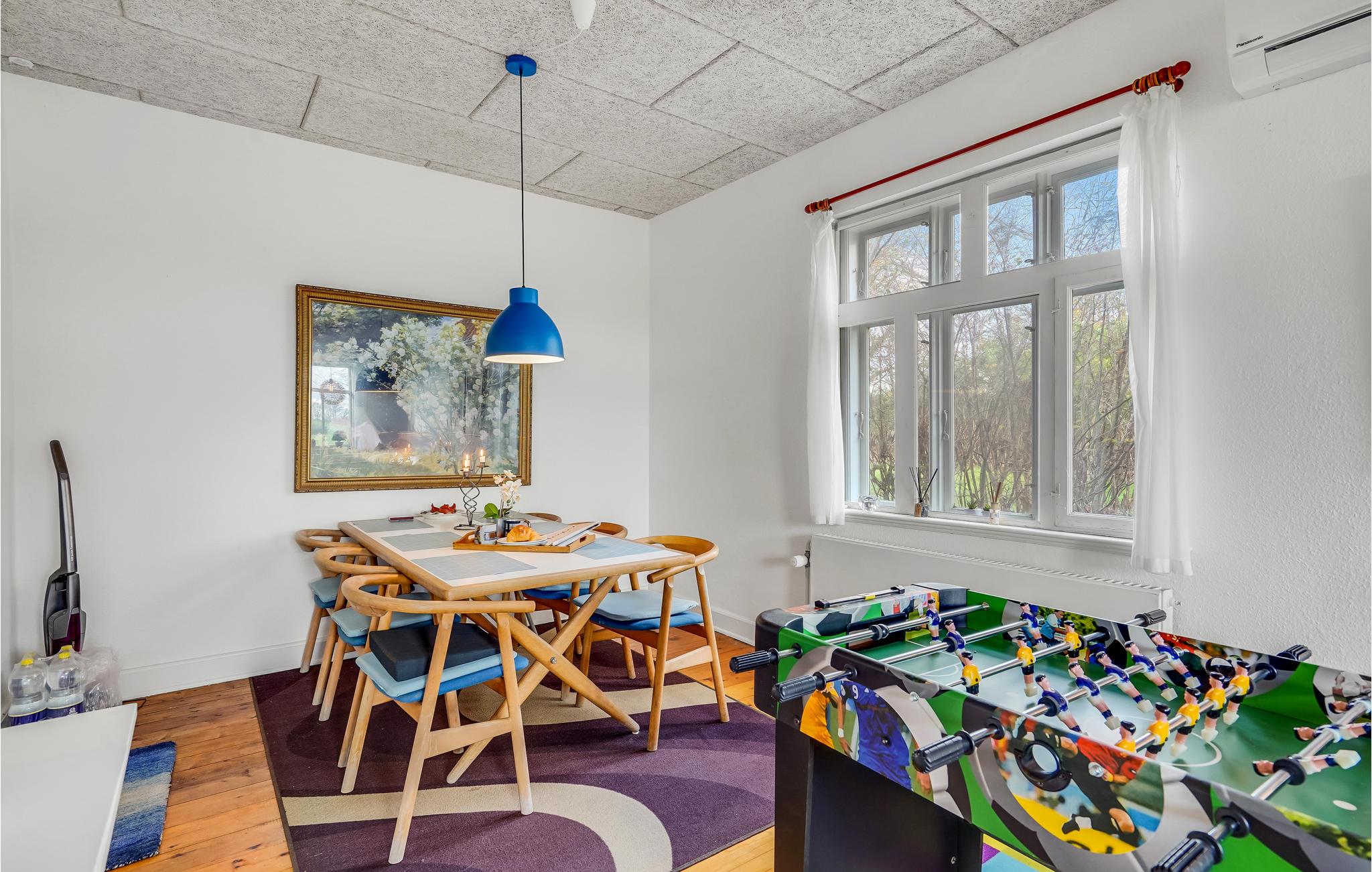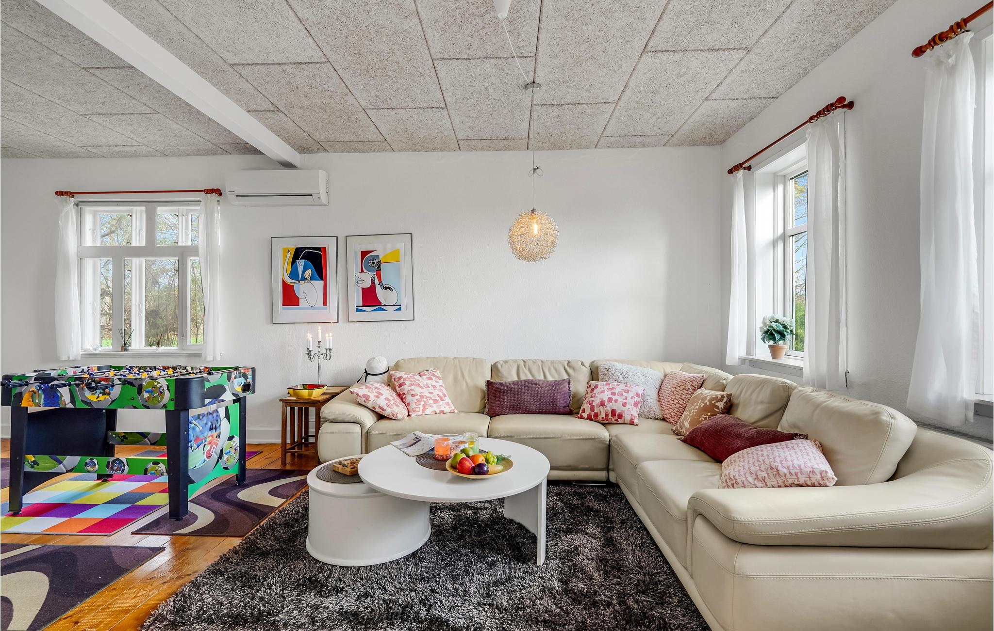 Det lyse interiør strækker sig over to etager og giver en hjemlig og autentisk atmosfære. Tilbring hyggelige timer med familie eller venner i stuen og hyg jer med en omgang bordfodbold fra tid til anden. Se en god film om aftenen eller hyg jer med en brætspilsaften for hele familien. Huset har en idyllisk, velholdt have med bede, gamle frugttræer og stille hjørner. Tilbring afslappende timer i havemøblerne under parasollen om sommeren, mens børnene boltrer sig på det grønne område - her kan livet virkelig nydes. Har I brug for det, kan terrassen indhegnes.