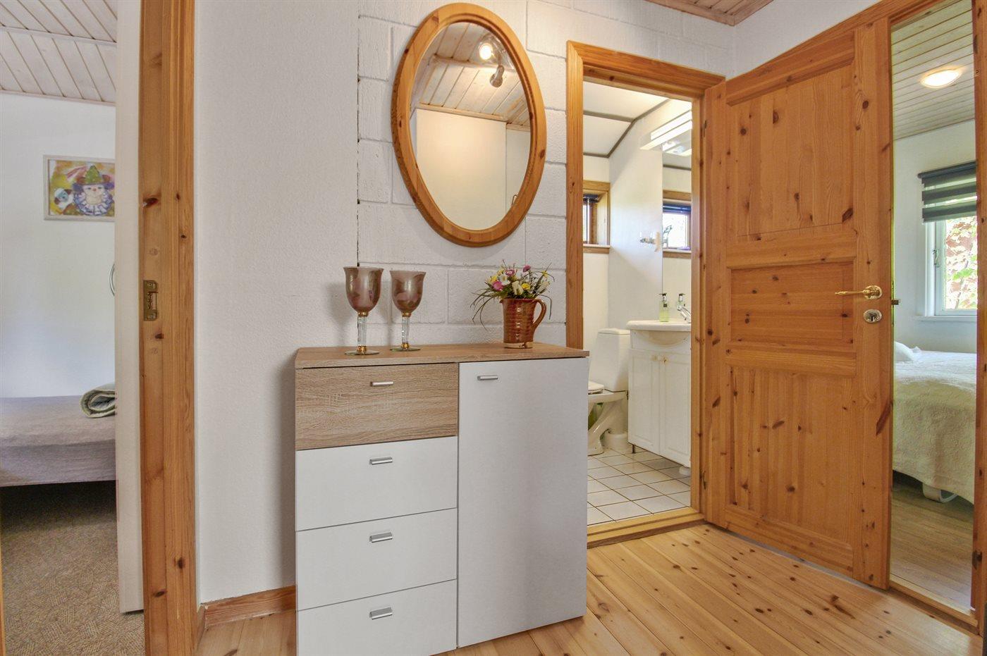 Sovepladserne fordeler sig på 2 værelser; 1 med dobbeltseng og 1 med 2 enkeltsenge. Badeværelse med gulvvarme og bruseniche. Til de mindste feriegæster findes der høj barnestol. Carport på grunden.
