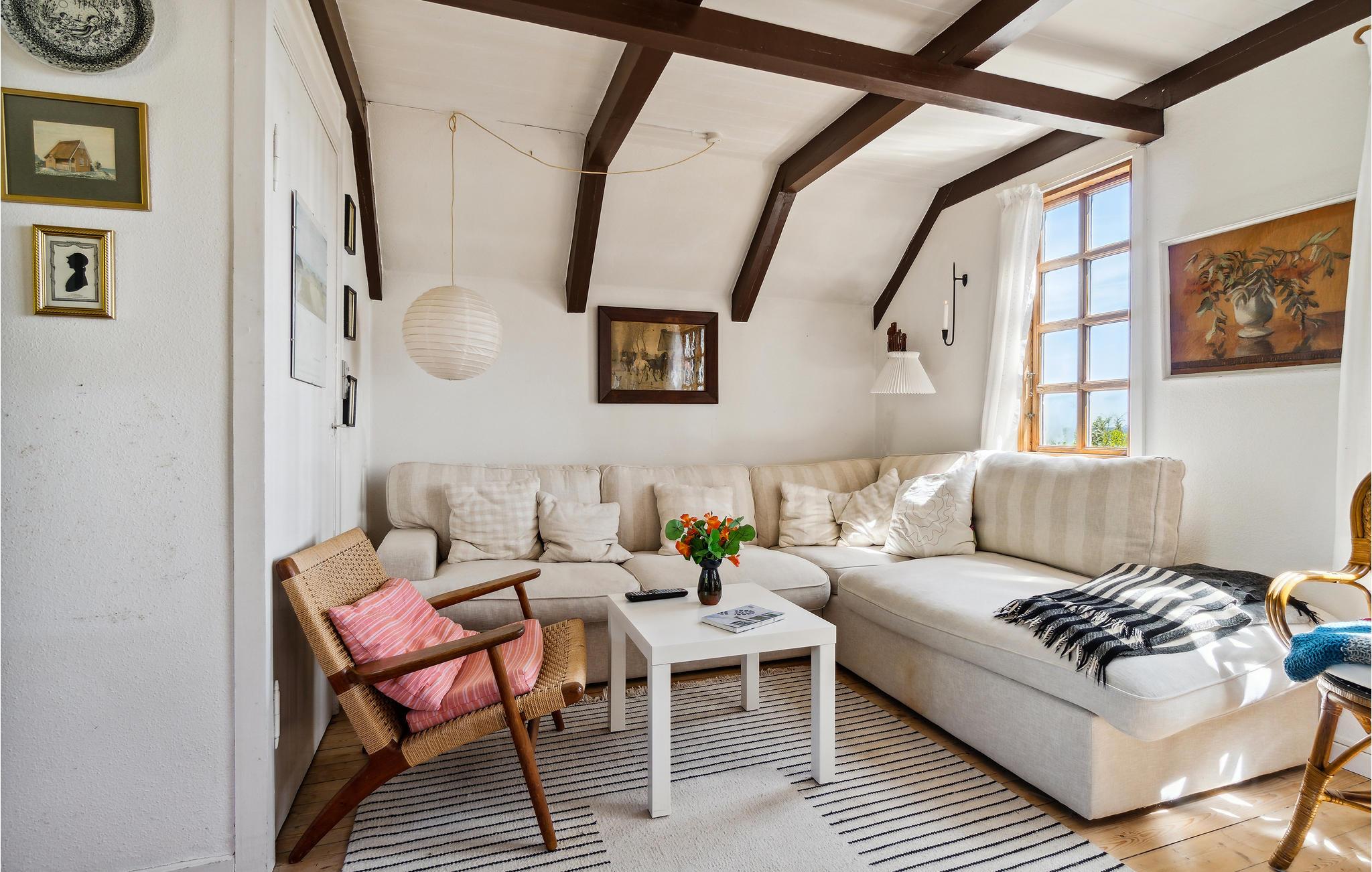 Charmerende stråtækt træhus ved vandet i Snogebæk med panoramaudsigt og autentisk stemning.