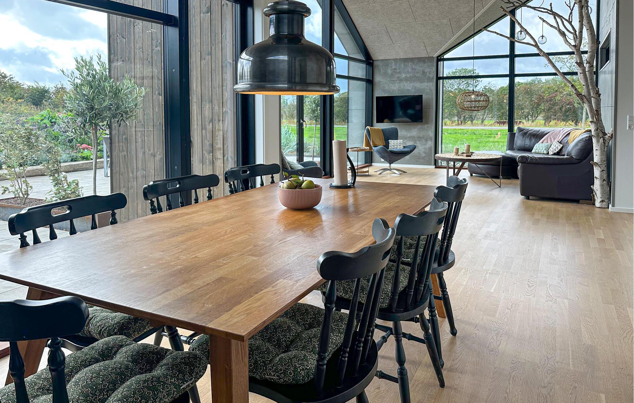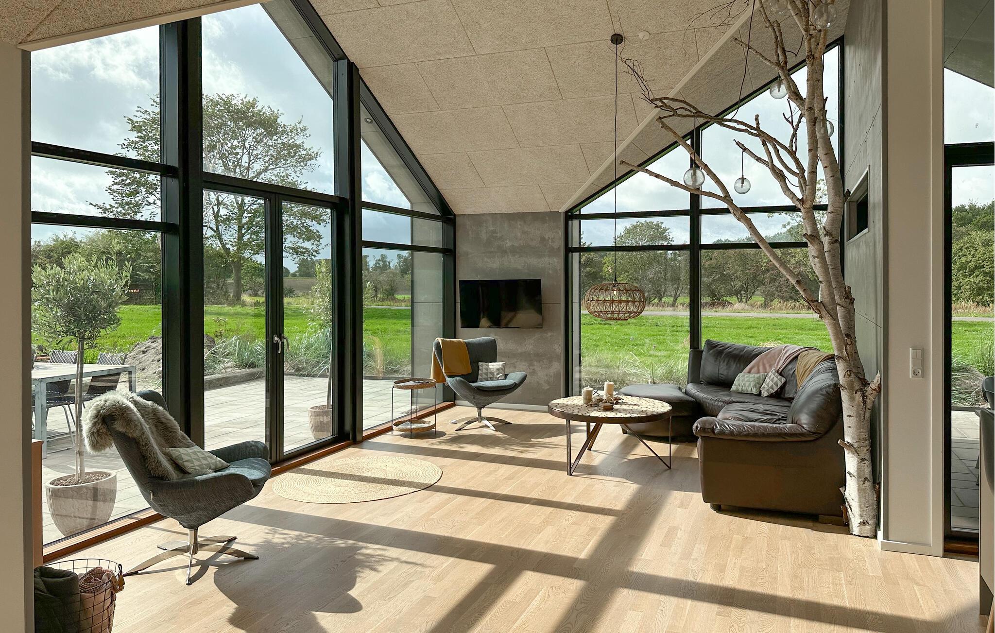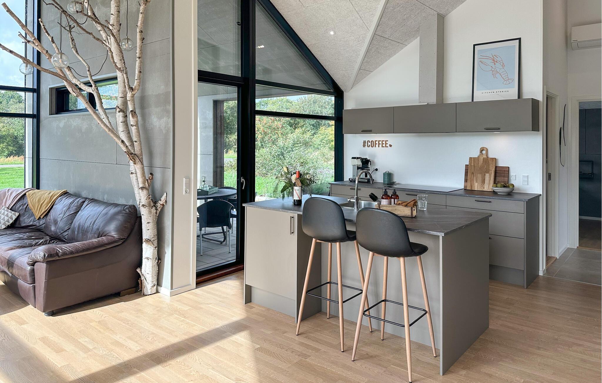 Dette arkitektonisk attraktive feriehus forkæler jer med masser af naturskønt lys takket være sine store vinduer og lover hyggelige dage i sin stilfulde opholdsstue. Glæd jer til at lave lækre måltider i det åbne køkken og spise sammen ved det behageligt oplyste spisebord. Den rummelige stue har en behagelig sofa, hvor I kan nyde gode samtaler med et glas vin.