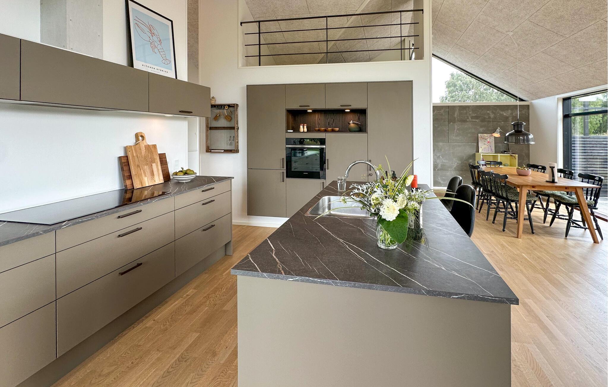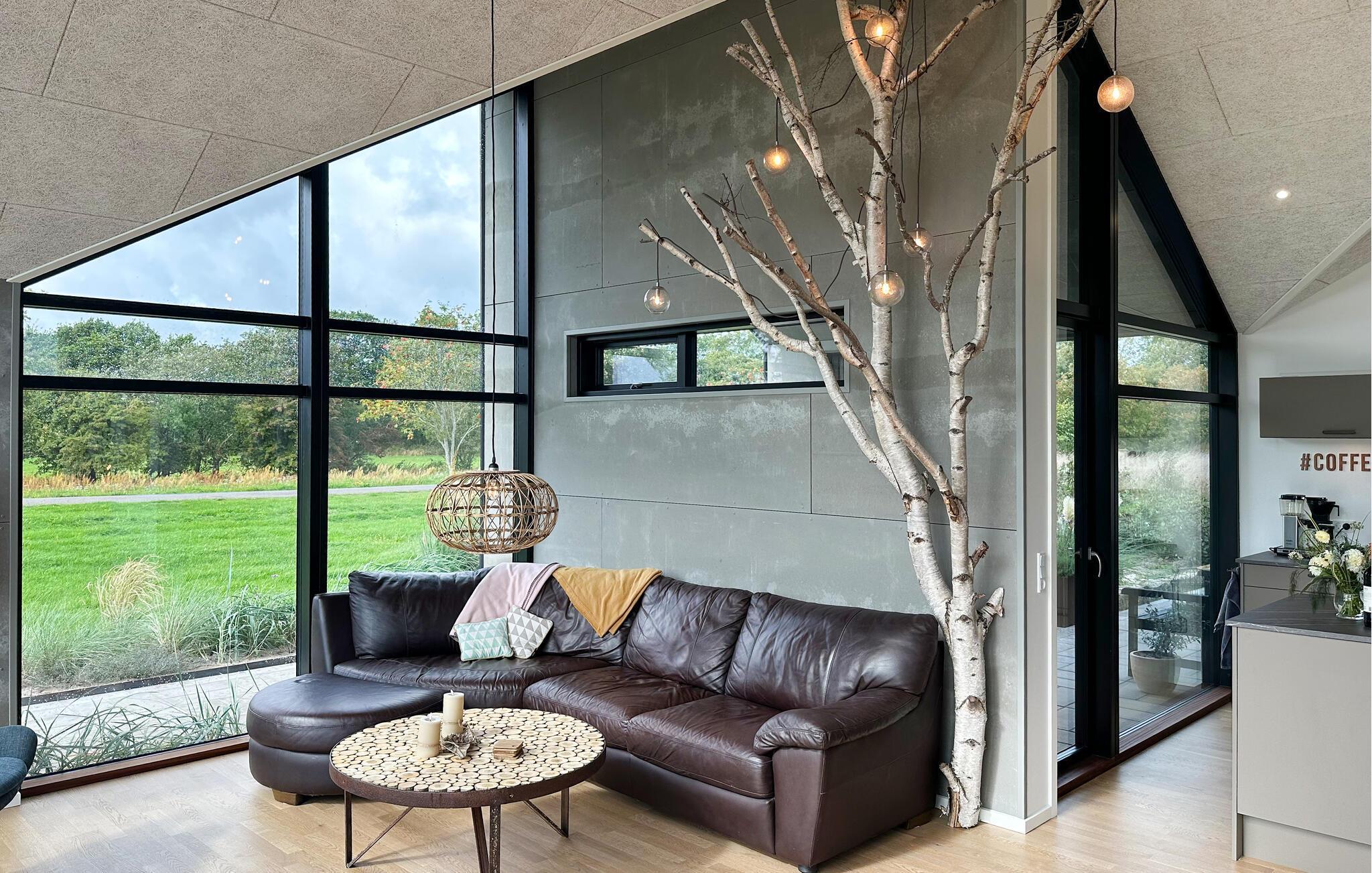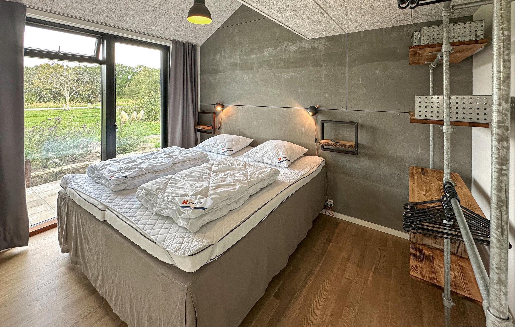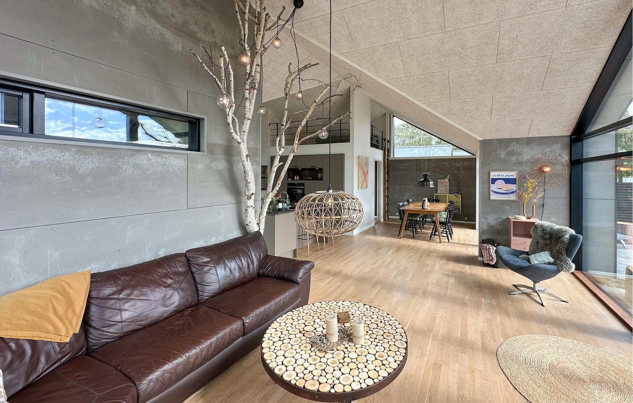 Dette arkitektonisk attraktive feriehus forkæler jer med masser af naturskønt lys takket være sine store vinduer og lover hyggelige dage i sin stilfulde opholdsstue. Glæd jer til at lave lækre måltider i det åbne køkken og spise sammen ved det behageligt oplyste spisebord. Den rummelige stue har en behagelig sofa, hvor I kan nyde gode samtaler med et glas vin.