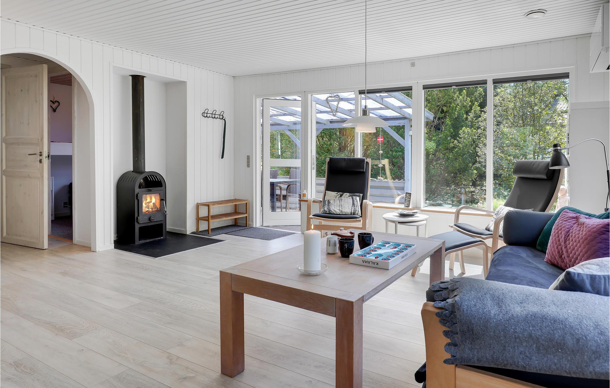 Hyggeligt og lyst sommerhus i Snogebæk med terrasse, brændeovn og tæt på strand og havn.