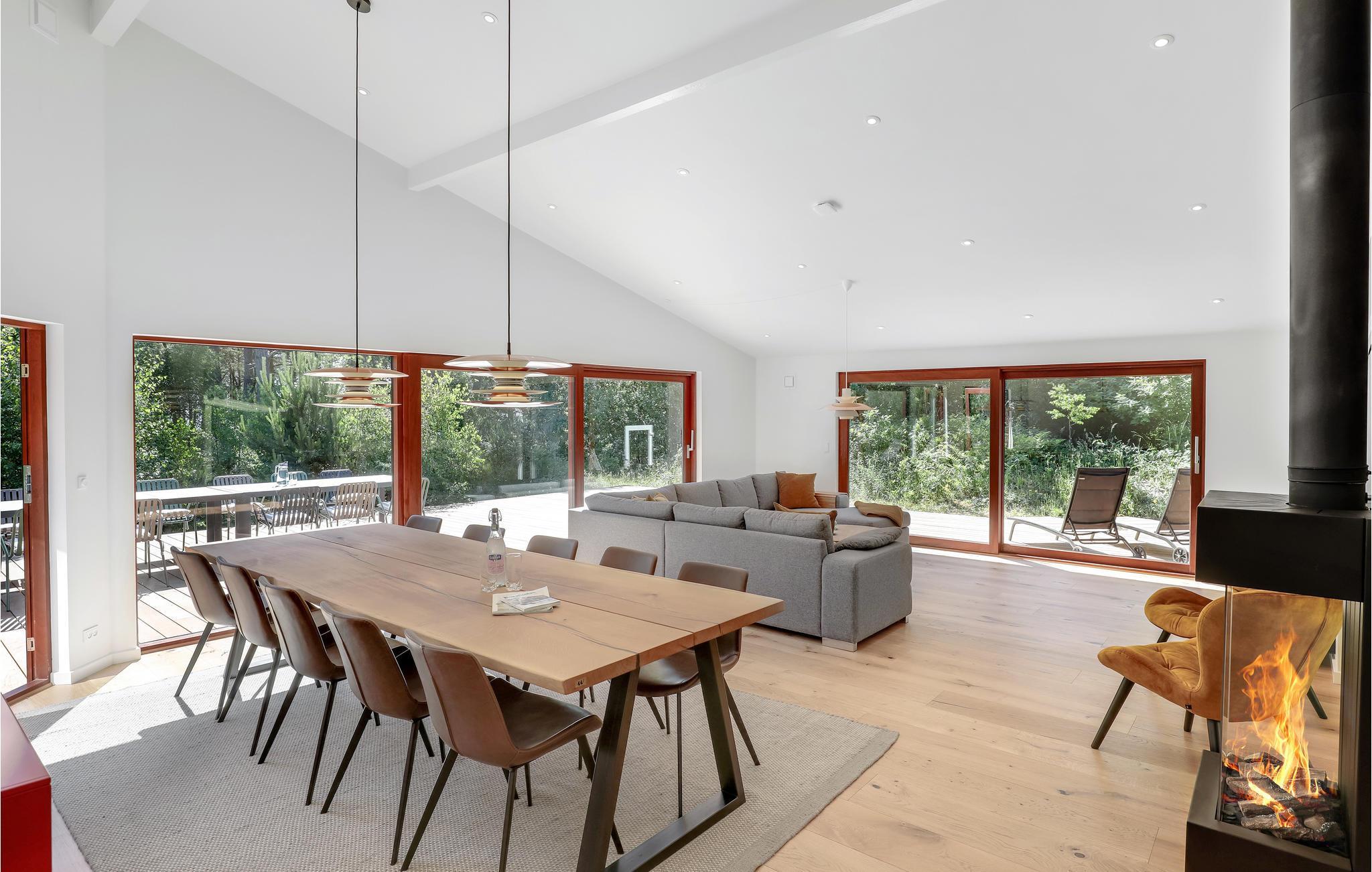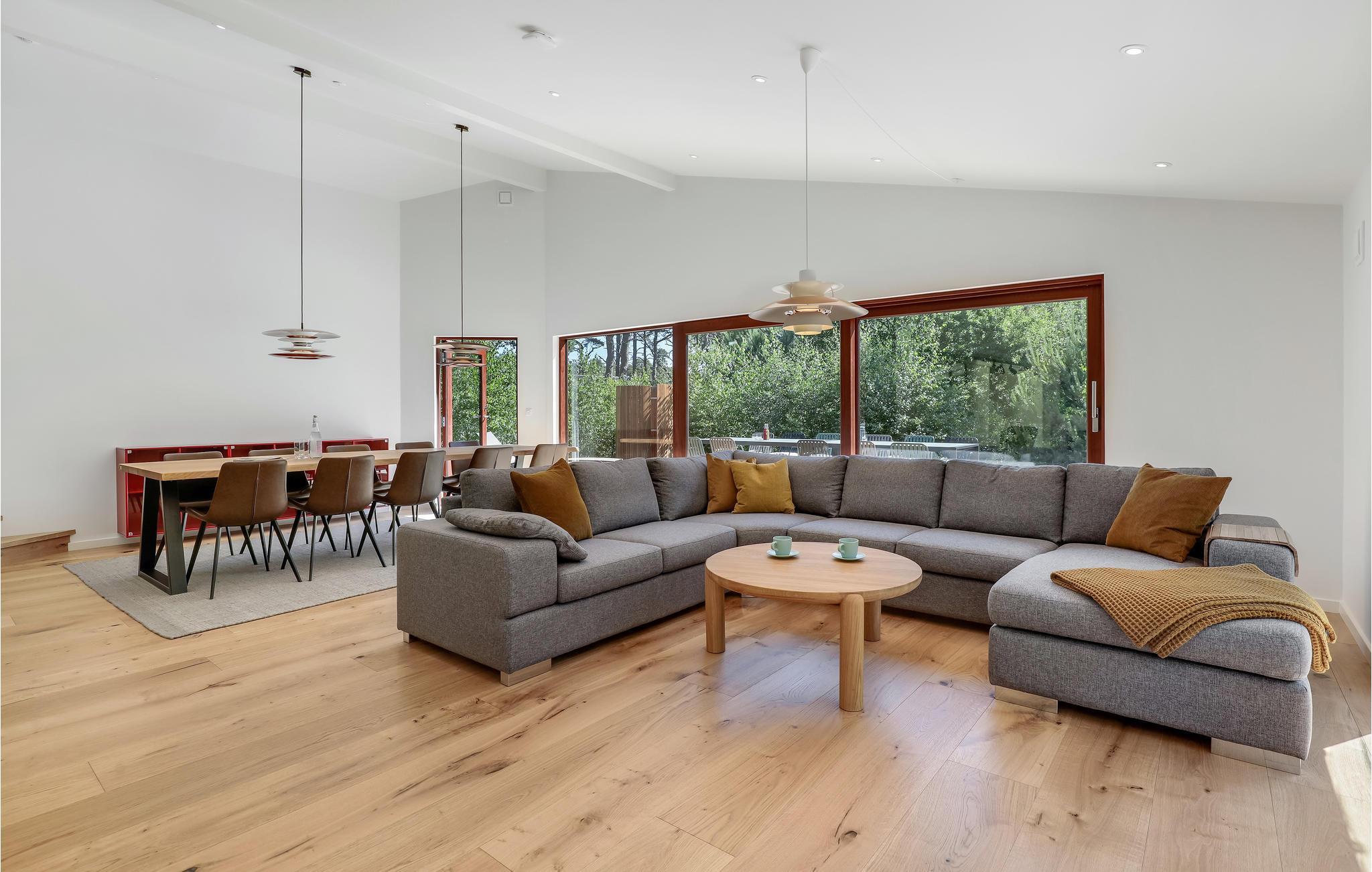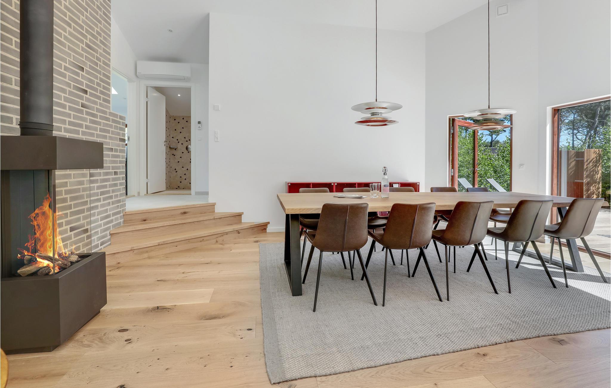 Ferieboligen har gulvvarme overalt og et ventilationssystem, hvilket sørger for et behageligt indeklima. Her får I nogle skønne dage, uanset om sæsonen er til indendørshygge eller sol i haven. I opholdsrummet kan I tænde op i el-pejsen på kølige dage eller give jer i kast med madlavningen, mens børnene plasker i swimmingpoolen, som I har udsyn til fra køkkenet. Der er fem gode soveværelser, så huset er godt indrettet til 11 personer.