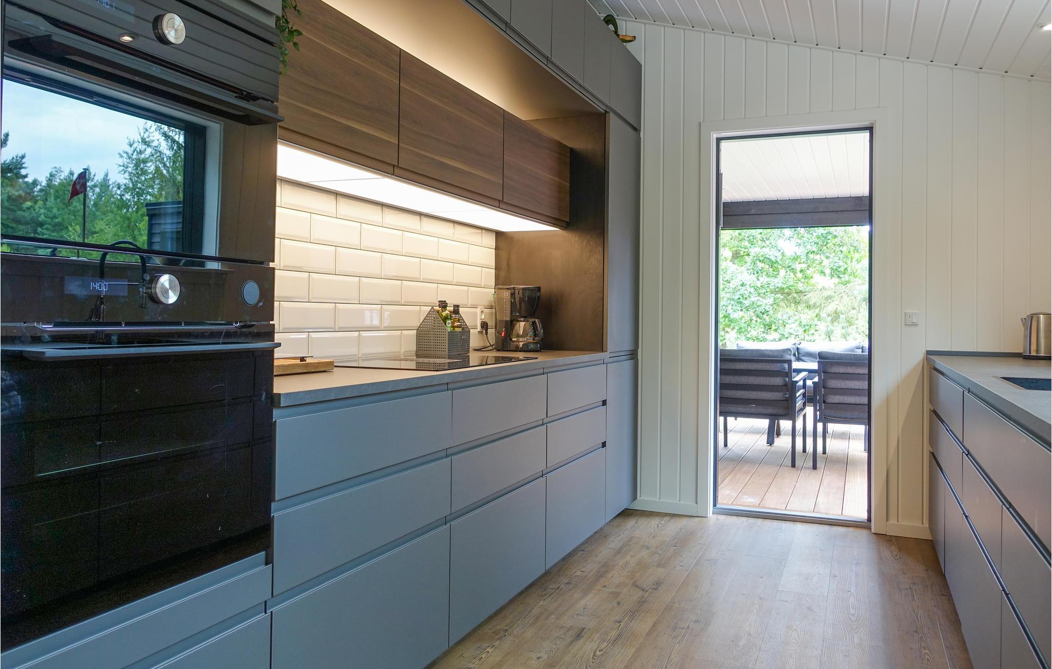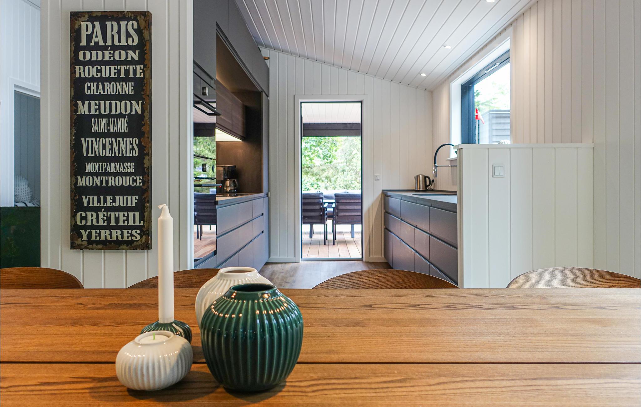 Hvis I virkelig vil forsøde jeres ferie, kan I godt begynde at glæde jer til dette luksushus. Her venter moderne interiør og en gennemført, flot stil med lækre materialer både ude og inde. I opholdsrummet kan I tilberede jeres ferieretter, lige som I ønsker dem, for I kommer ikke til at mangle udstyr. Med to ovne kan I også nemt invitere vennerne over til en stor middag, eller måske er det her, I skal holde jul i år? I stuen har I god plads omkring spisebordet, og når I skal slappe af i sofaen efter en lang gåtur ved havet. På kølige dage kan I tænde op i brændeovnen og skabe ekstra hygge.