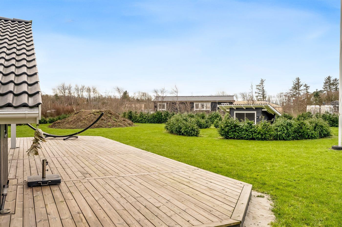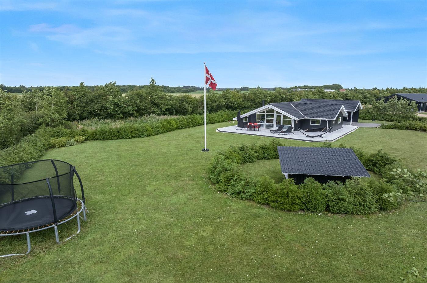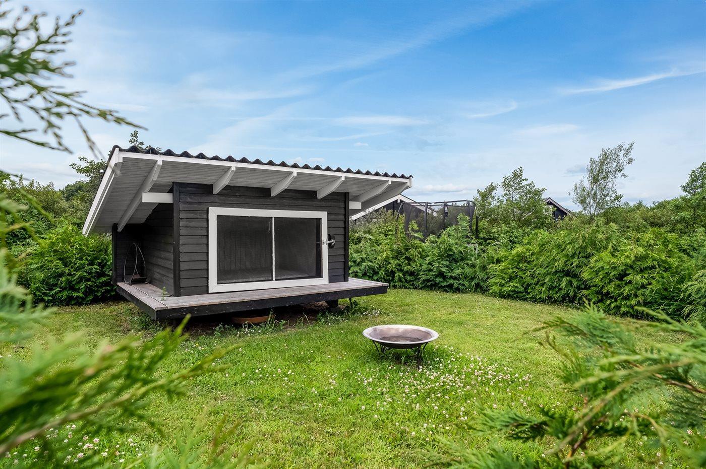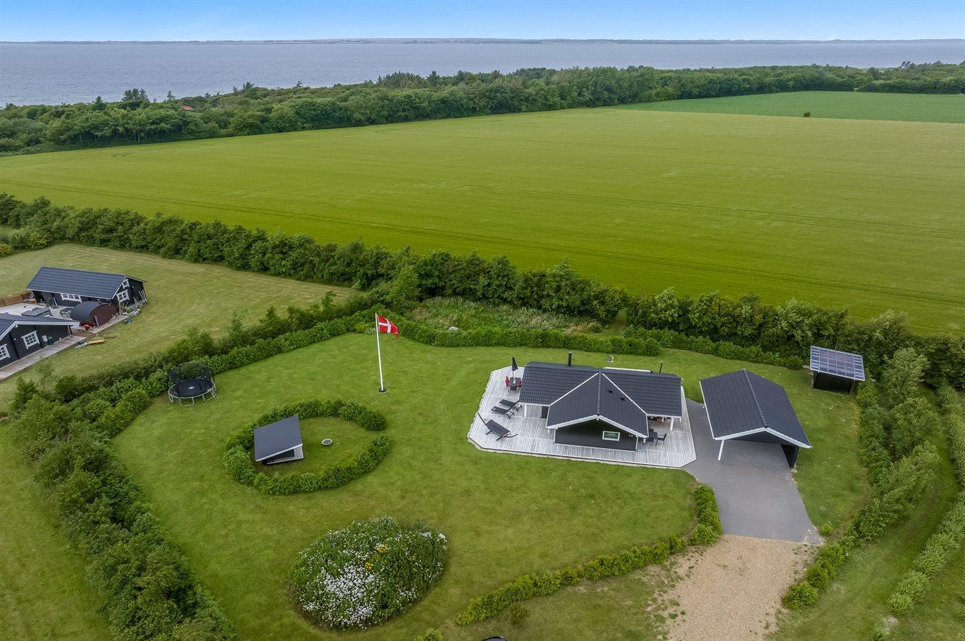 Ferieboligen er beliggende på en 2606 m² stor havegrund. Der er 500 m til fjorden. Nærmeste forretning er beliggende i en afstand af 3800 m. Til ferieboligen hører åbent terrasseareal. Desuden er der overdækket terrasse. Der er redskabsrum. Trampolin. Bålsted. Grill til rådighed. Der er garage til rådighed. Parkering ved ferieboligen.