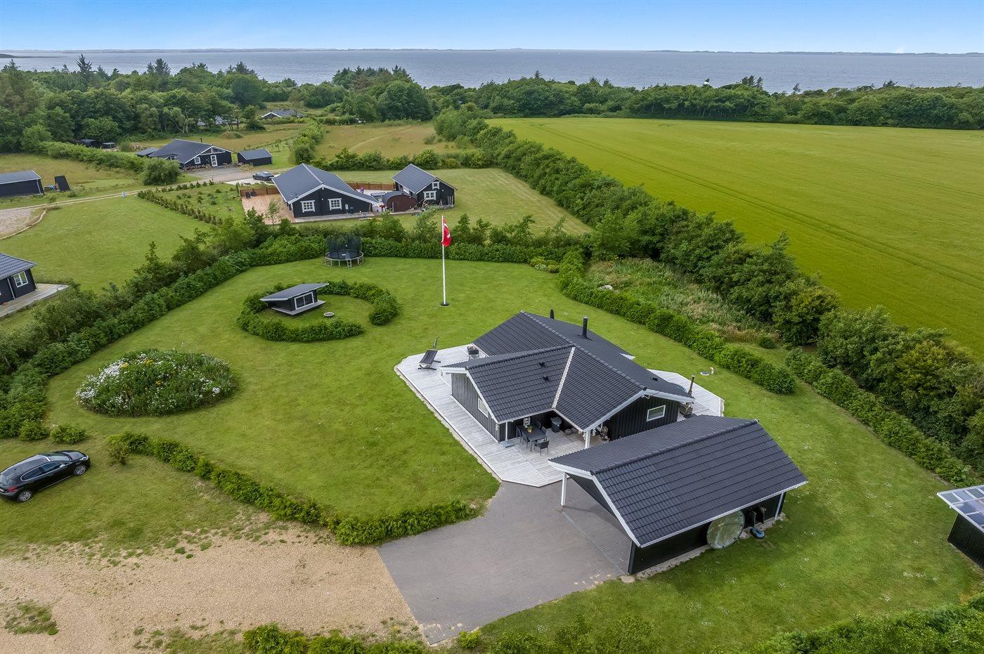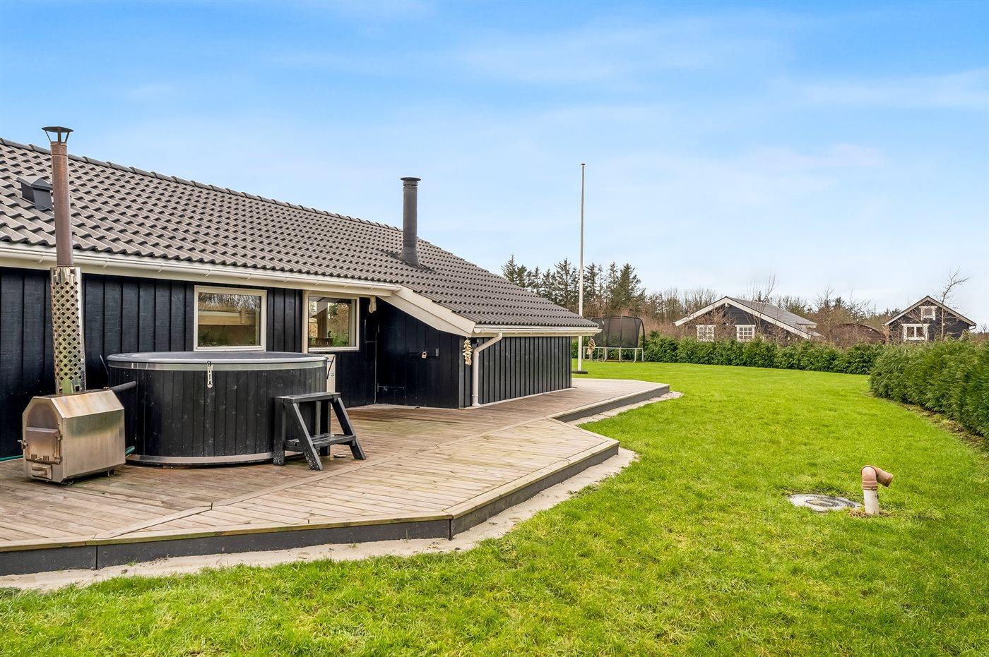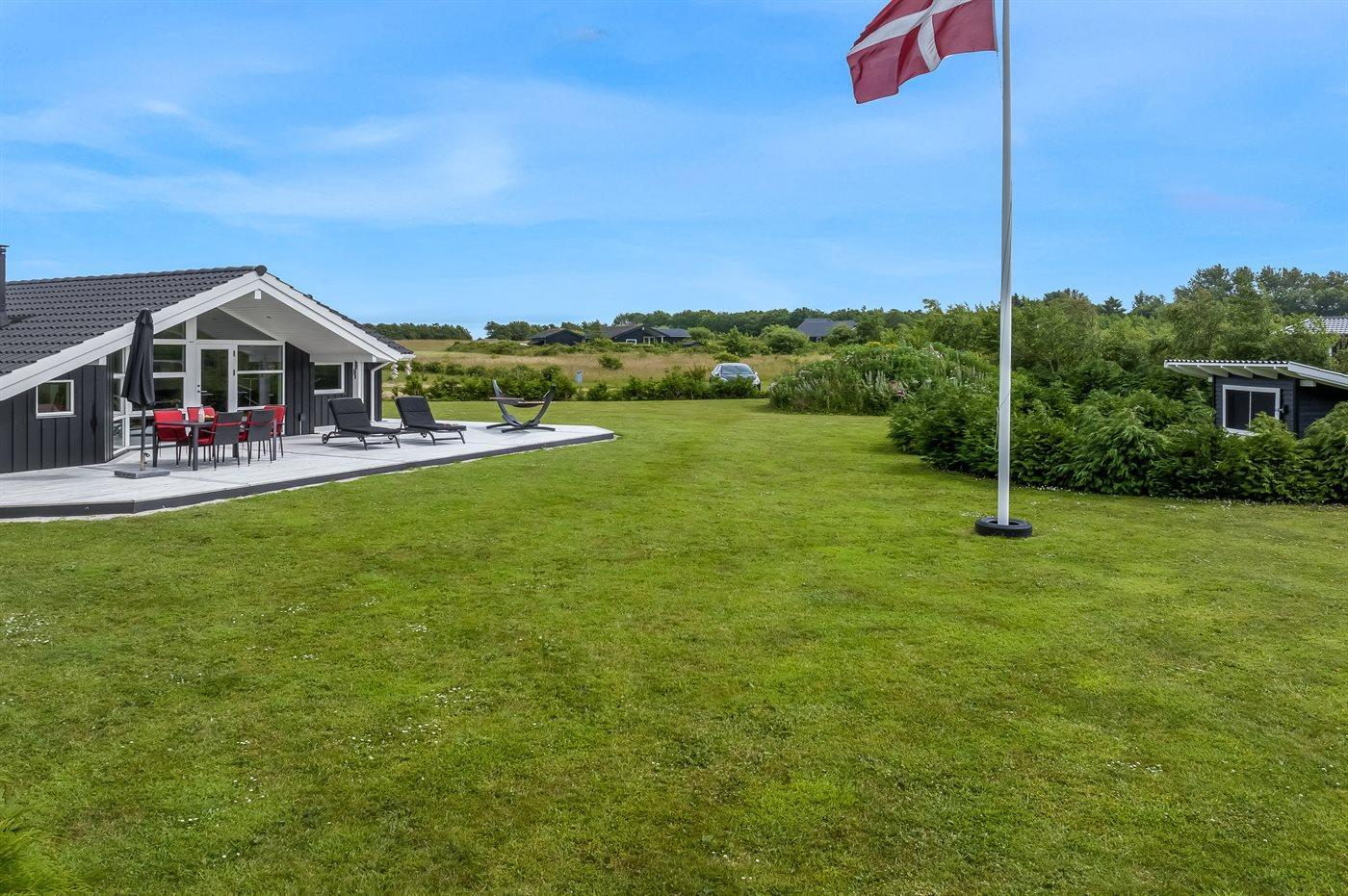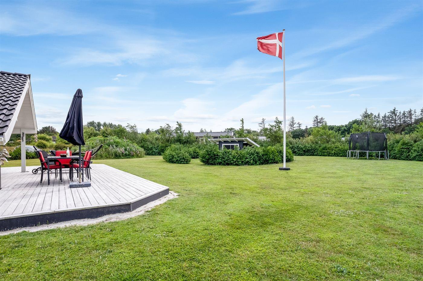 Ferieboligen er beliggende på en 2606 m² stor havegrund. Der er 500 m til fjorden. Nærmeste forretning er beliggende i en afstand af 3800 m. Til ferieboligen hører åbent terrasseareal. Desuden er der overdækket terrasse. Der er redskabsrum. Trampolin. Bålsted. Grill til rådighed. Der er garage til rådighed. Parkering ved ferieboligen.