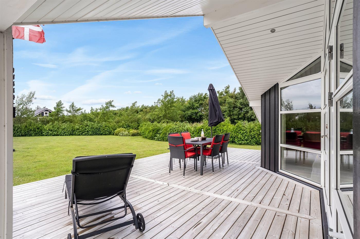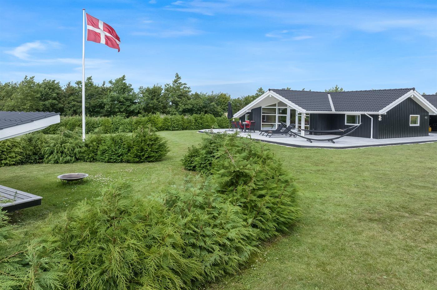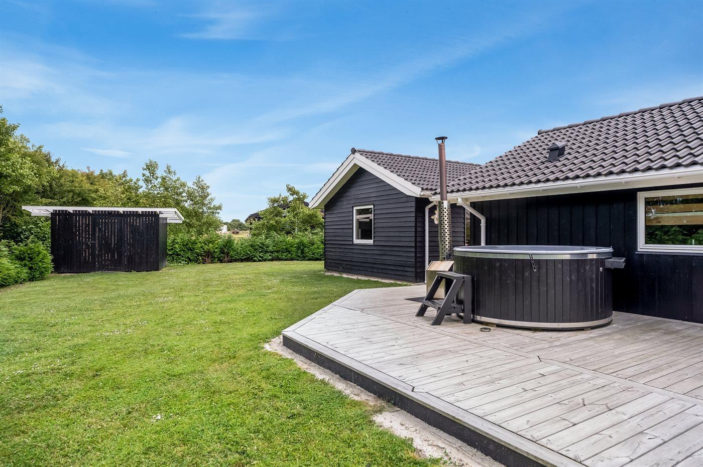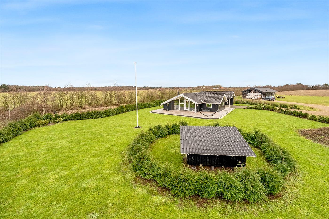 Ferieboligen er beliggende på en 2606 m² stor havegrund. Der er 500 m til fjorden. Nærmeste forretning er beliggende i en afstand af 3800 m. Til ferieboligen hører åbent terrasseareal. Desuden er der overdækket terrasse. Der er redskabsrum. Trampolin. Bålsted. Grill til rådighed. Der er garage til rådighed. Parkering ved ferieboligen.