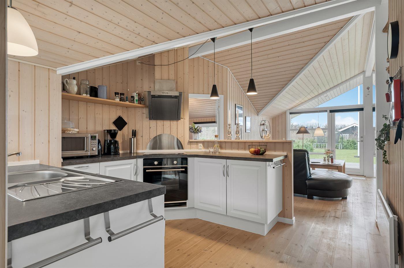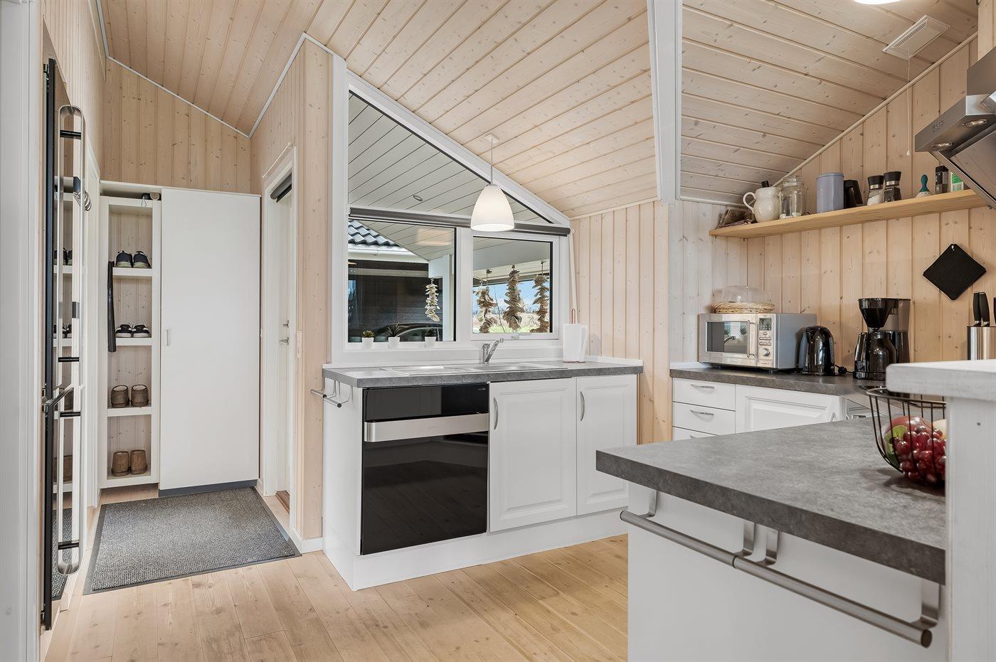 Køkkenet er udstyret med 1 køleskab. Der er 4 keramiske kogeplader, varmluftovn, mikrobølgeovn samt opvaskemaskine.
