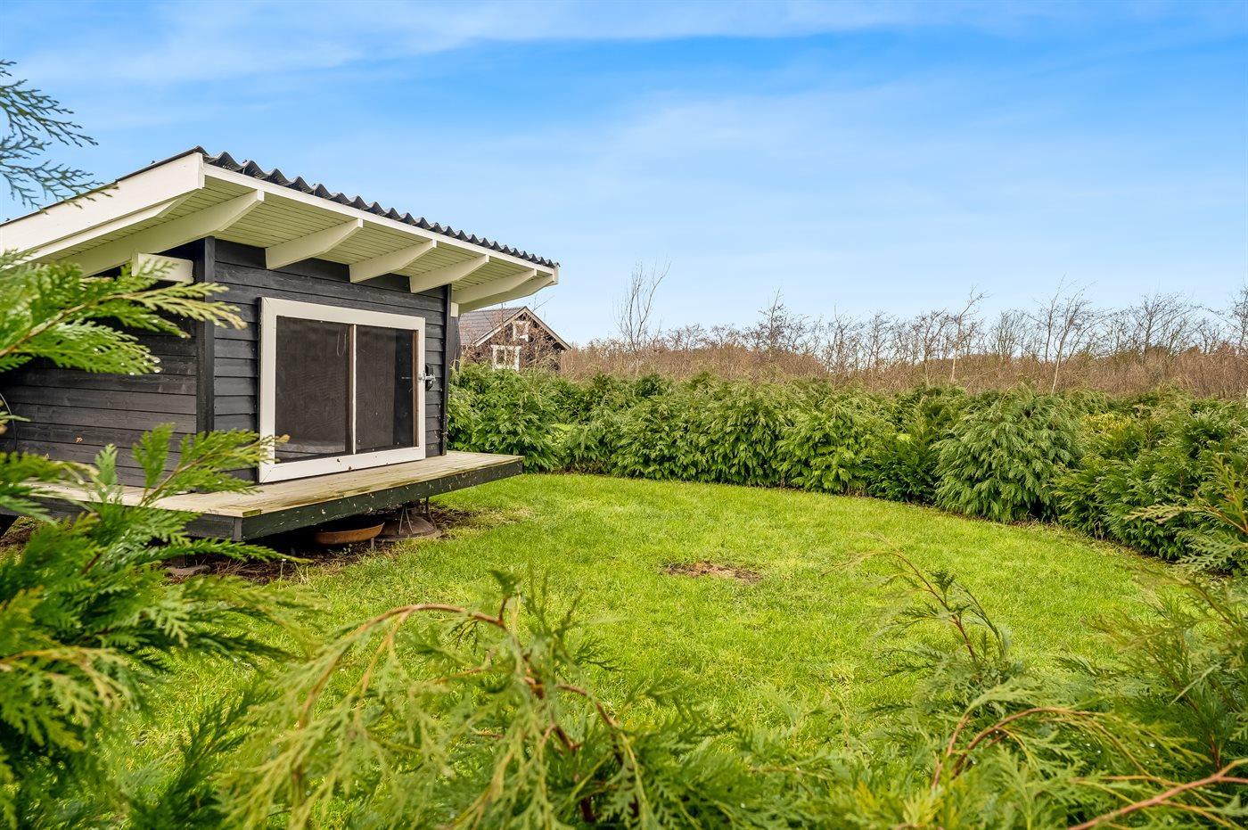 Hyggeligt sommerhus ved fjorden med vildmarkskar, stor have og tæt på familievenlig strand i Spøttrup.