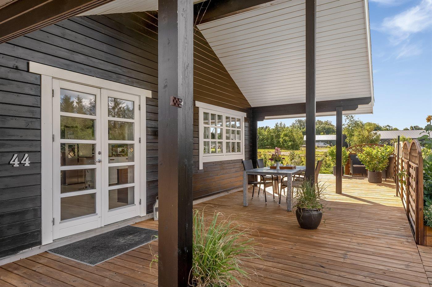 Ferieboligen er beliggende på en 2936 m² stor naturgrund. Der er 500 m til fjorden. Nærmeste forretning er beliggende i en afstand af 2000 m. Til ferieboligen hører åbent terrasseareal. Desuden er der overdækket terrasse. Fodboldmål. Udendørs sauna. Parkering ved ferieboligen.