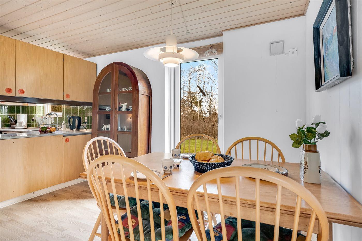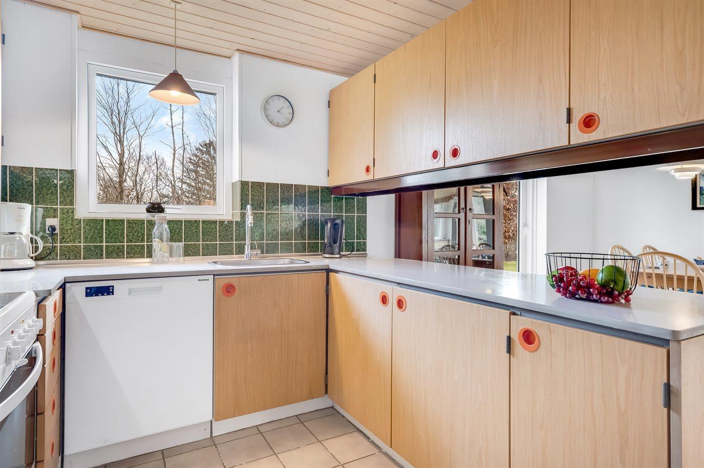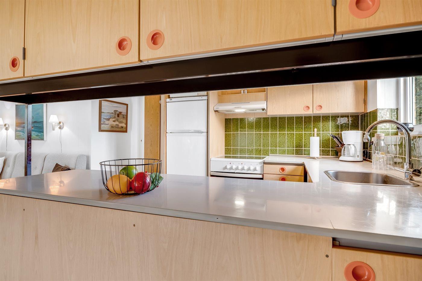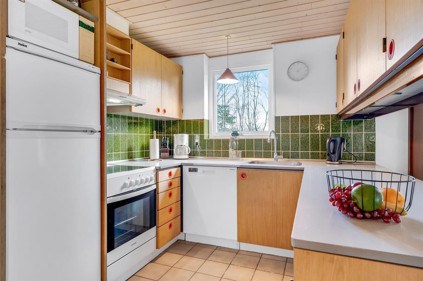 Køkkenet er udstyret med 1 køleskab. Der er 4 elkogeplader, varmluftovn, mikrobølgeovn samt opvaskemaskine.