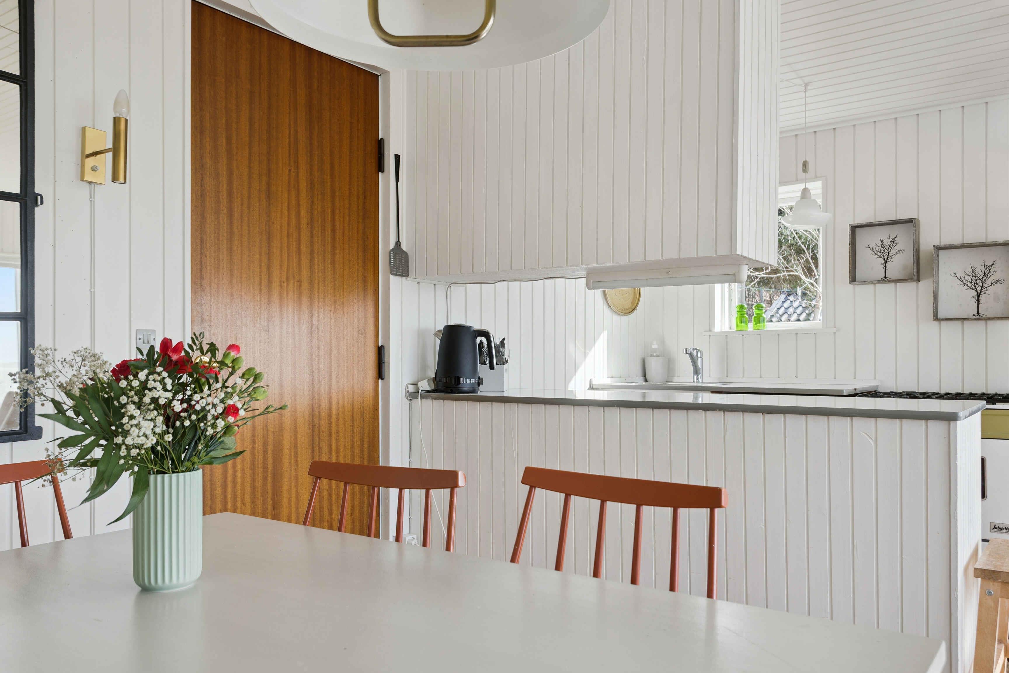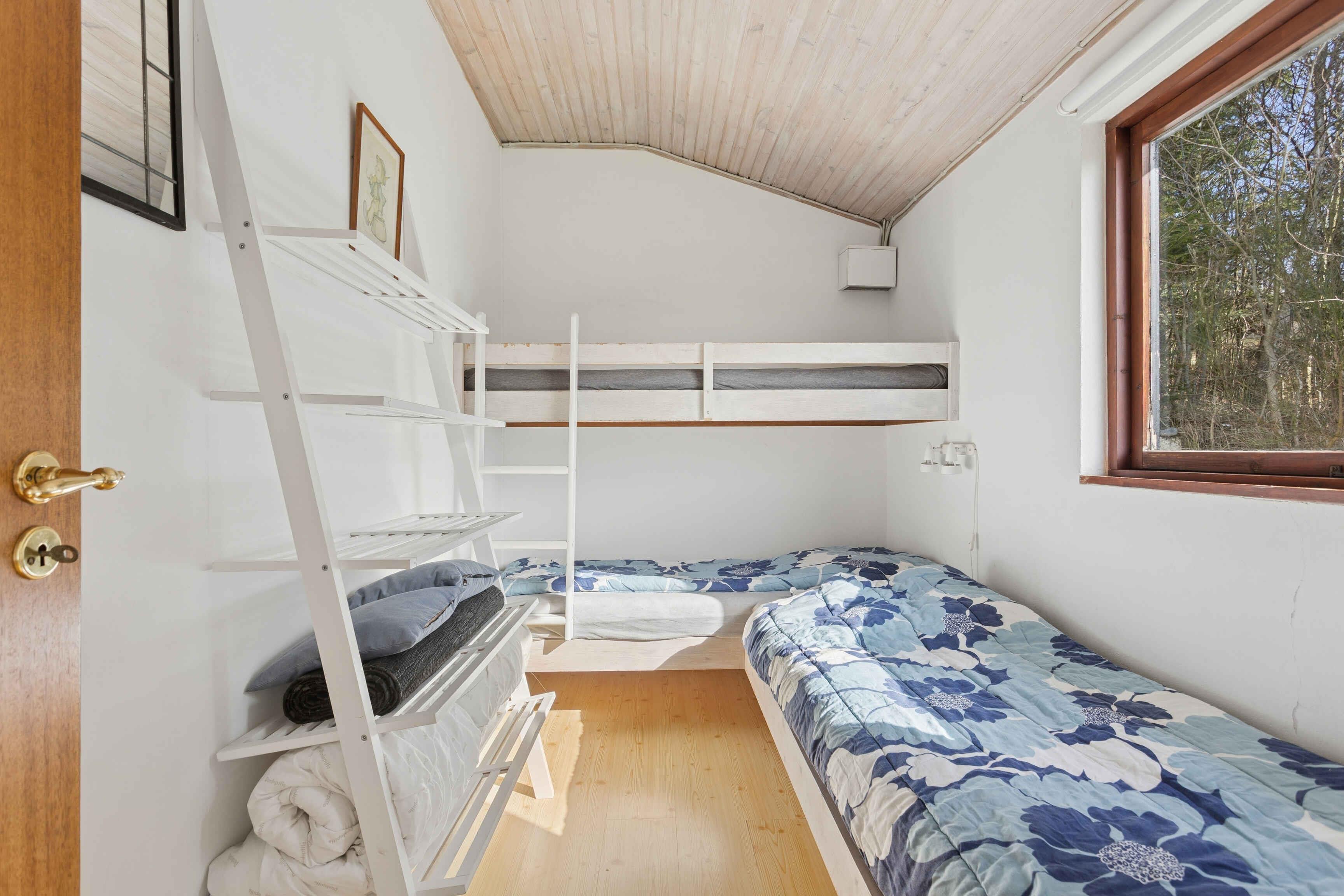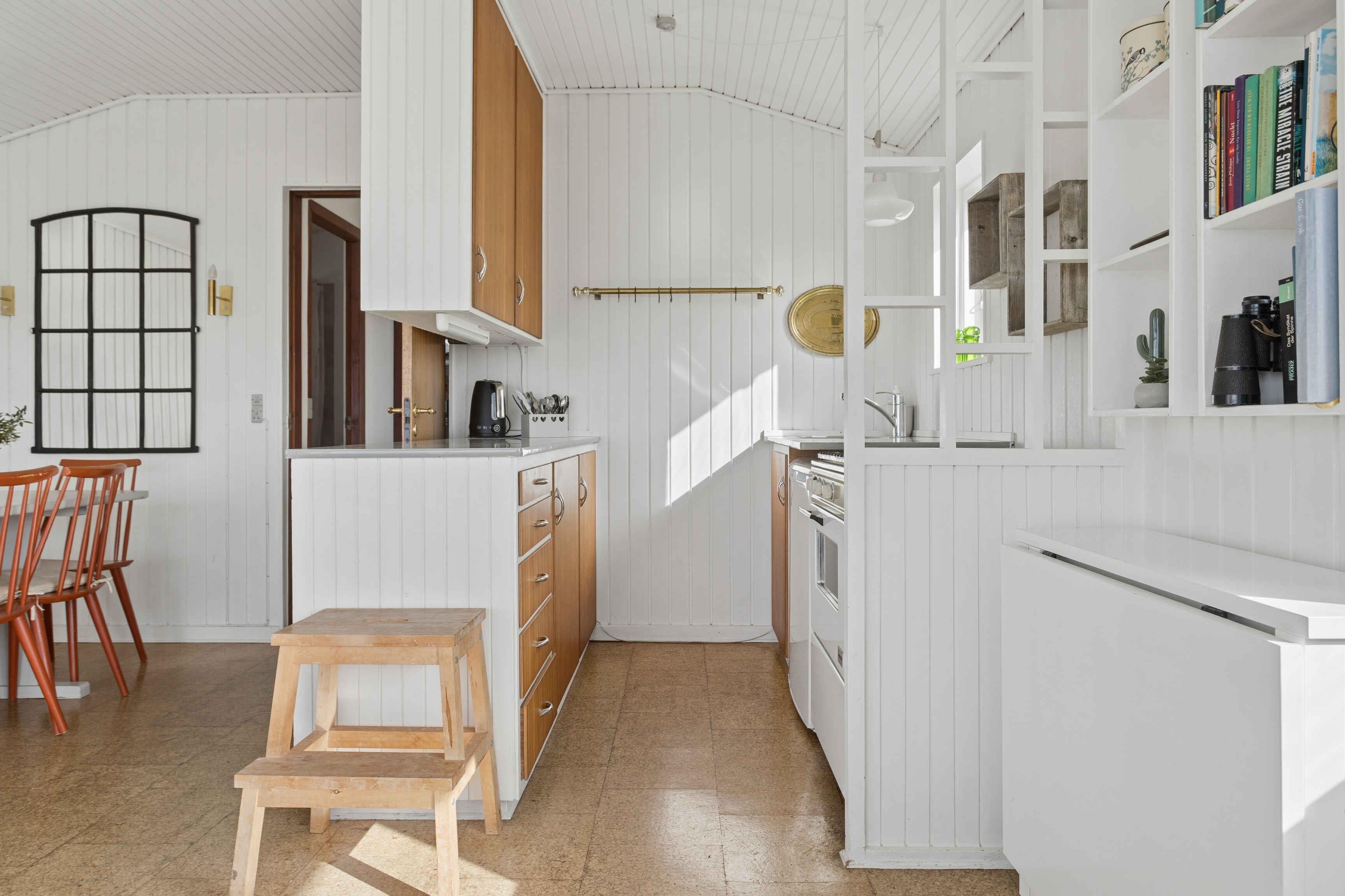 Hævet over forgrunden med panoramaudsigt over Limfjorden ligger dette hyggelige sommerhus på 55 m² omgivet af grønne arealer. Den rolige beliggenhed og udsigten til vandet skaber en afslappet ramme for ferien, hvor man hurtigt falder til ro. Huset er nænsomt renoveret med nyt badeværelse i 2020 og fremstår indbydende. Der er to soveværelser samt en daybed i stuen, i alt seks sovepladser. Fra stuen kan man vågne til udsigten over fjorden og følge dagens skiften. Udelivet er en naturlig del af opholdet. To små terrasser giver mulighed for måltider i solen, og den lille plæne indbyder til leg og afslapning. Bag huset ligger et mindre skovområde, som især børn finder spændende at udforske. Området omkring sommerhuset er ideelt til ferie ved Limfjorden. Der er kun 90 meter til vandet og en børnevenlig badestrand med badebro, stor legeplads og slæbested til båd. Her kan hele familien tilbringe lange dage ved fjorden. Limfjordslandet byder på ro, natur og gode oplevelser i nærområdet. Kysten indbyder til gåture, badning og kajak, mens det flade landskab er velegnet til cykelture. Spøttrup og omegn rummer lokale seværdigheder, små havne og hyggelige udflugtsmål. På grunden kan man være heldig at se både harer, rådyr og grævling. Kombinationen af natur, udsigt og rolige rammer gør opholdet til en pause fra hverdagen og et oplagt valg for familien med børn.
