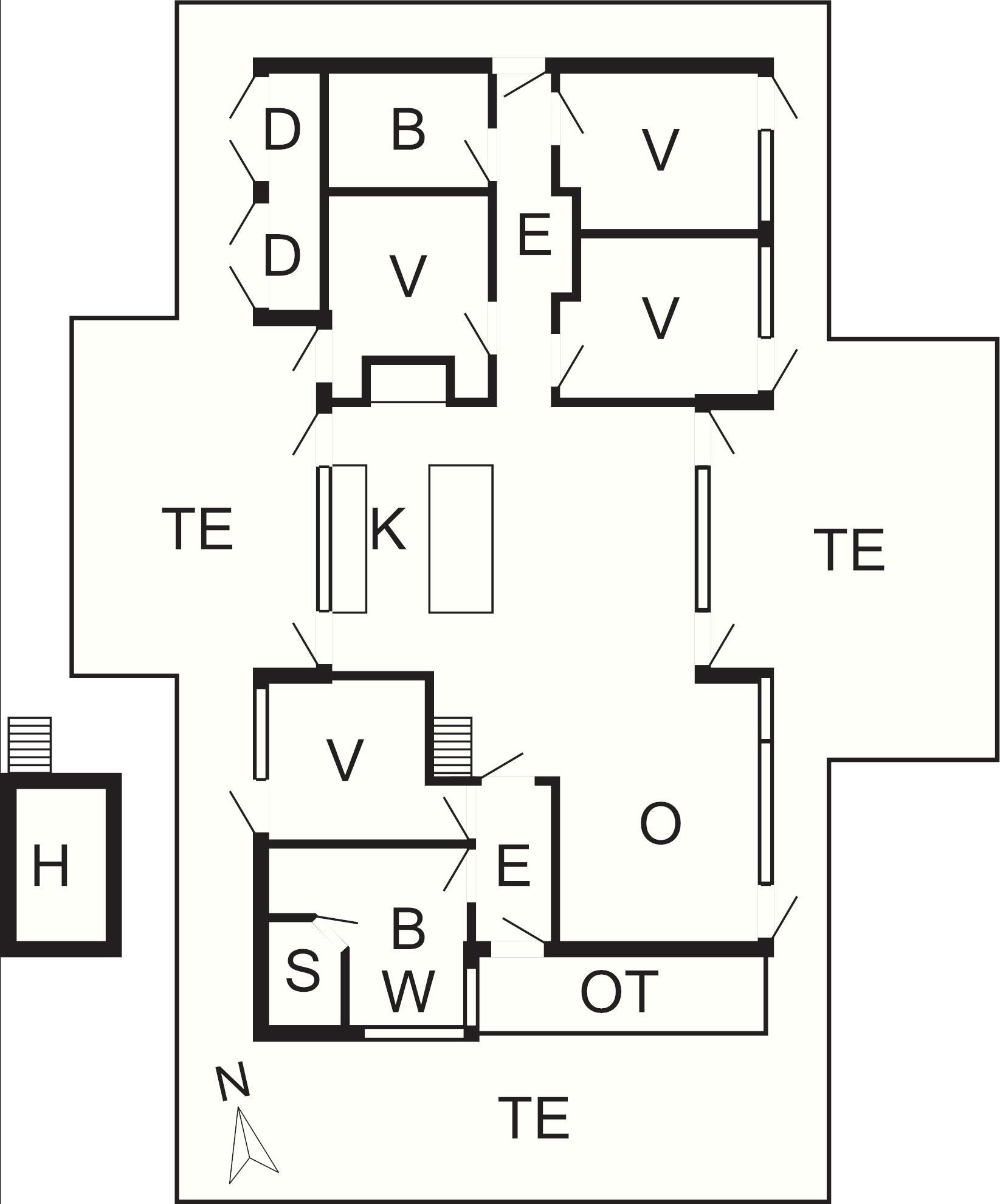 Entréen fører til badeværelse med spabad og sauna samt soveværelse. Herfra kommer du også ind i det rummelige køkken og opholdsstue i åbent plan, designet til familiesammenkomster. Værelset byder på åbent loft til højderyg, ovenlysvinduer, generøst køkken med kogeø samt udgang til både øst- og vestvendte terrasser. En stor hems (oplægninger) giver ekstra plads, mens der løber gulvvarme i hele huset for helårskomfort. Ejendommen indeholder fire velindrettede soveværelser og to badeværelser, det ene med vaskemaskine og tørretumbler. Underholdningsmulighederne omfatter en PlayStation 2 med forskellige spil. En moderne luft-til-luft varmepumpe med kølefunktion sikrer et behageligt indeklima.