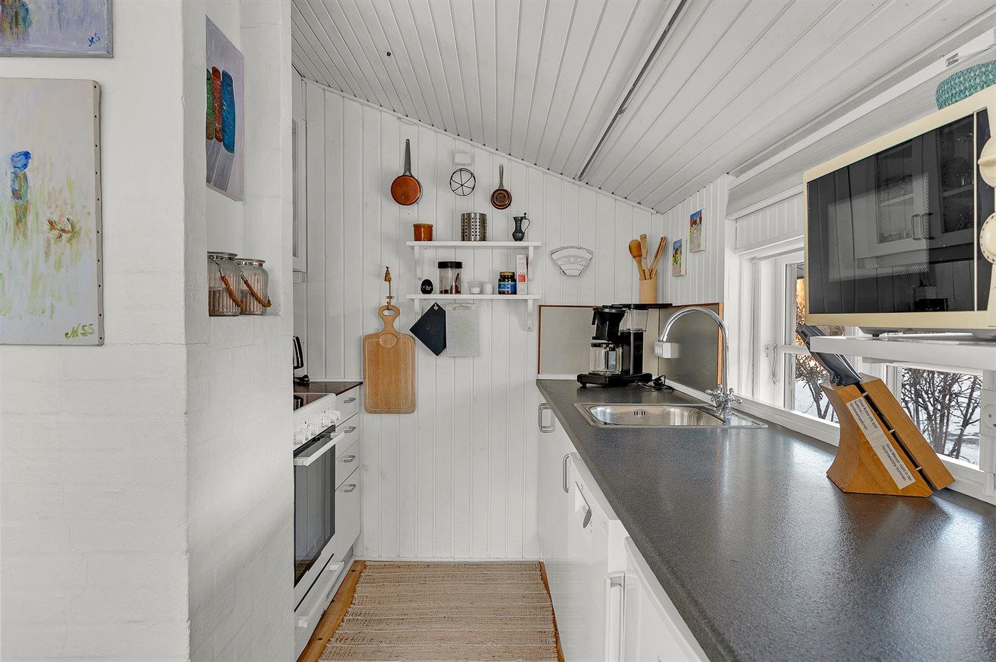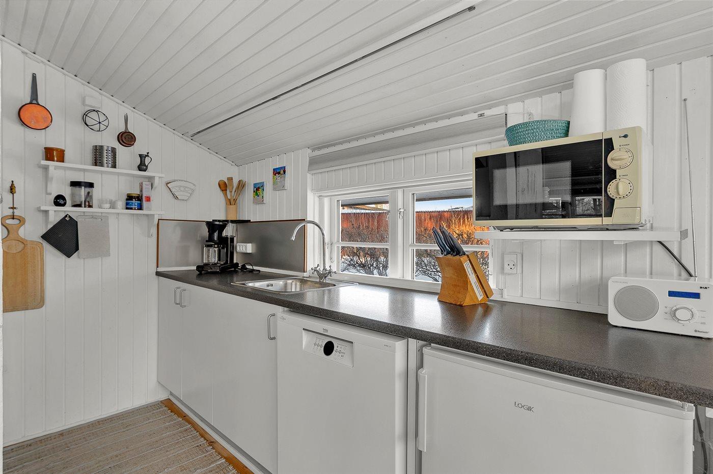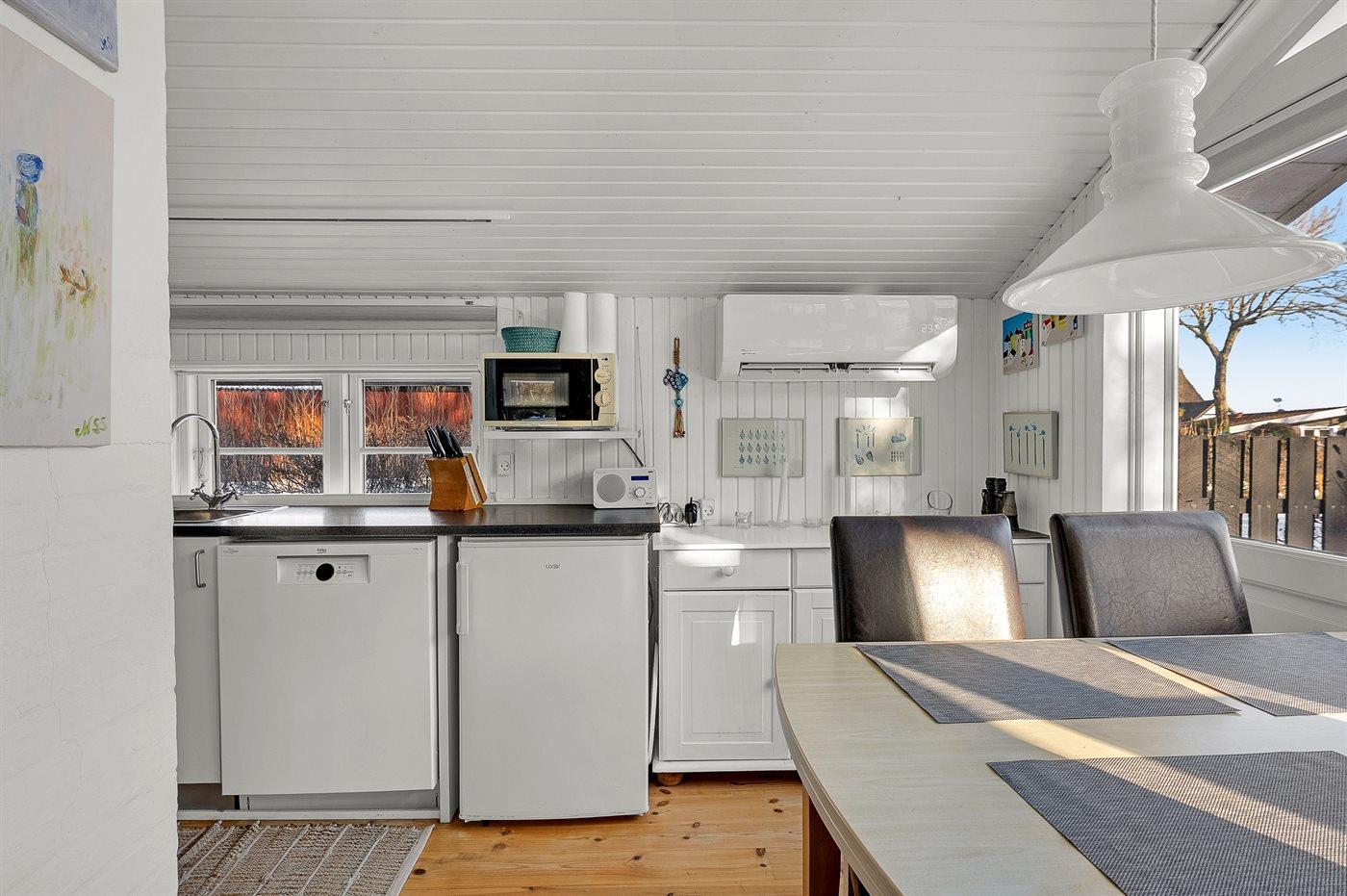 Køkkenet er udstyret med 1 køleskab. Der er 4 keramiske kogeplader, varmluftovn, mikrobølgeovn samt opvaskemaskine.