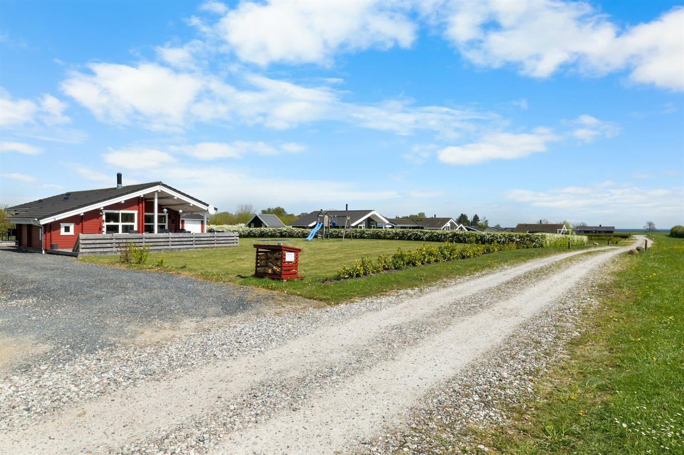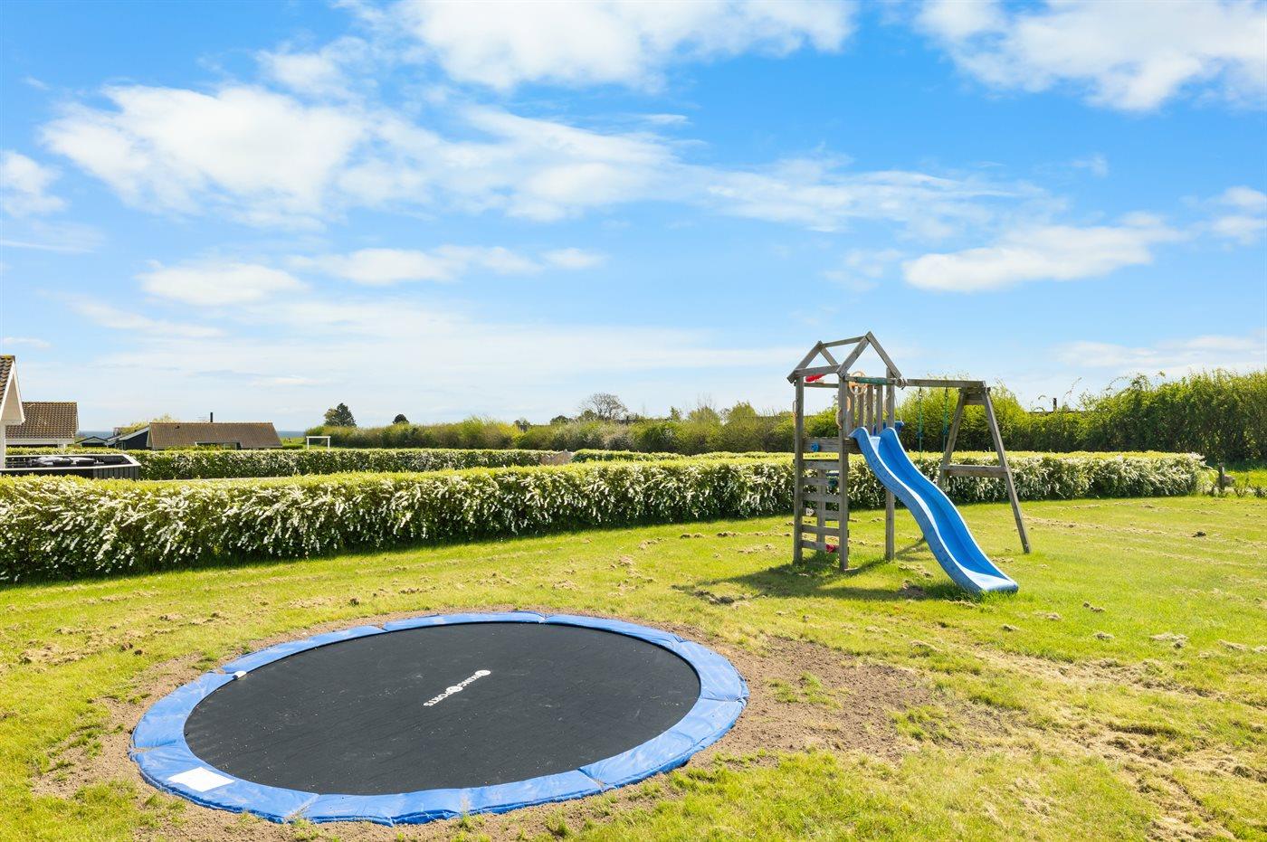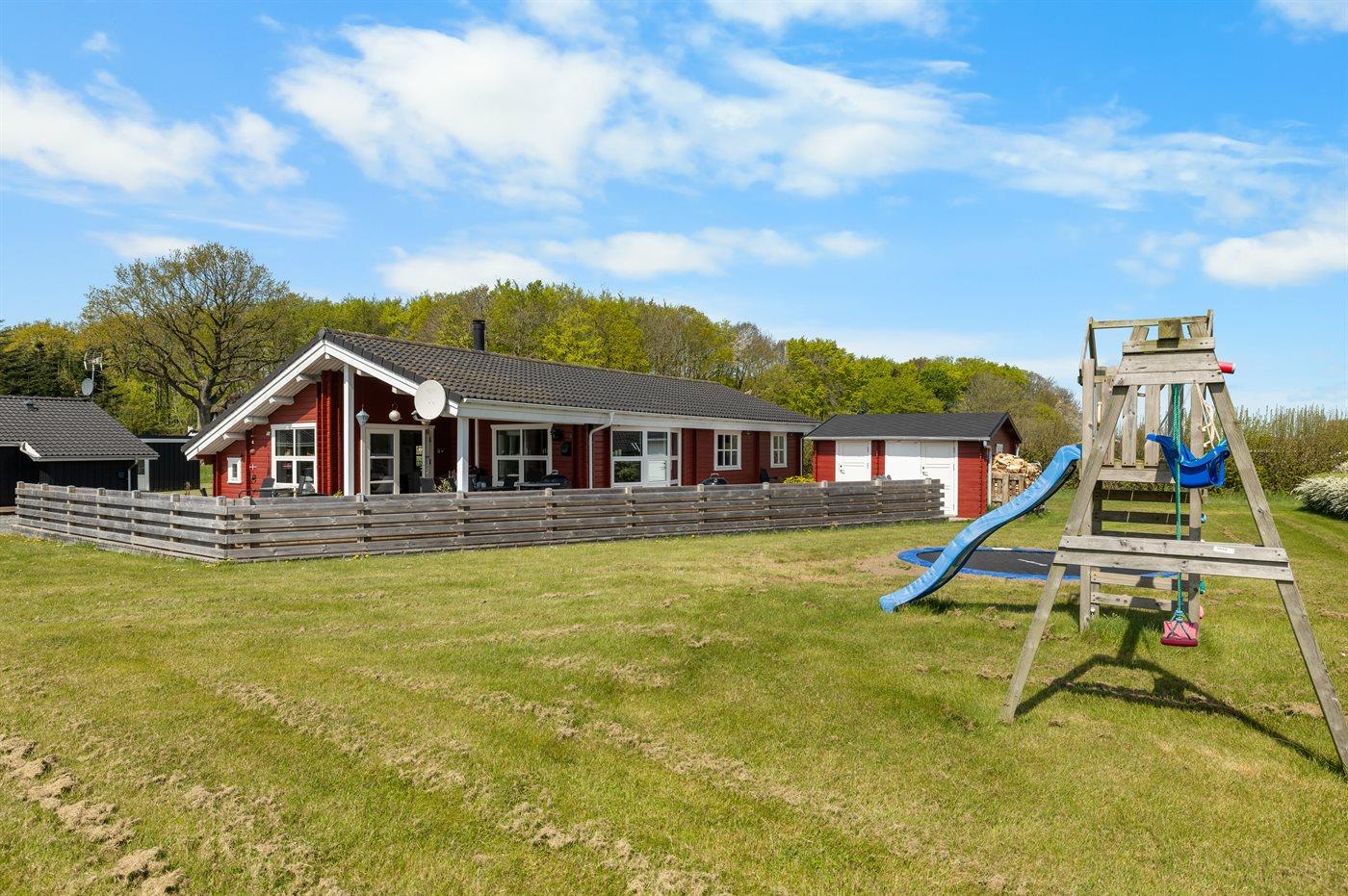 Ferieboligen er beliggende på en 1180 m² stor havegrund. Der er 600 m til havet. Nærmeste forretning er beliggende i en afstand af 850 m. Der er en golfbane i en afstand af 15000 m. Til ferieboligen hører 85 m² terrasseareal. Desuden er der 20 m² overdækket terrasse. Der er redskabsrum. Gynge. Sandkasse. Trampolin. Legetårn. Rutchebane. Grill til rådighed. Der er installeret stik til opladning af elbil. Parkering ved ferieboligen.