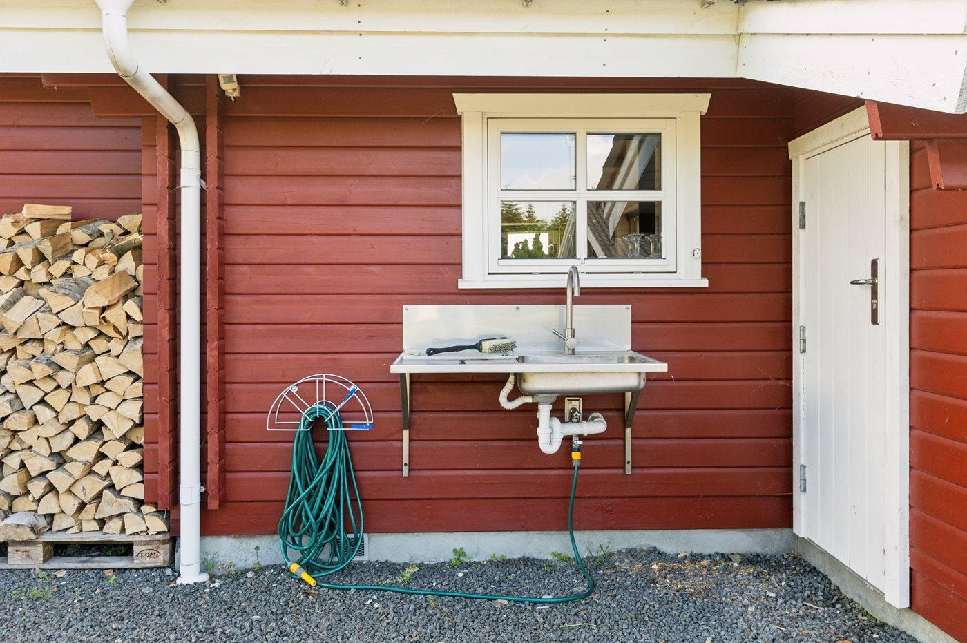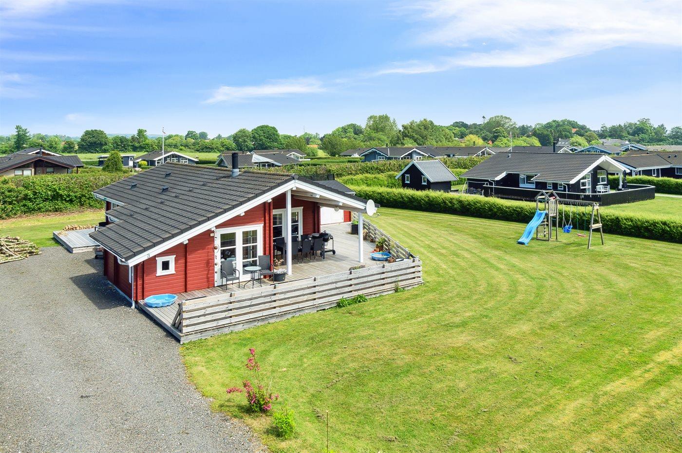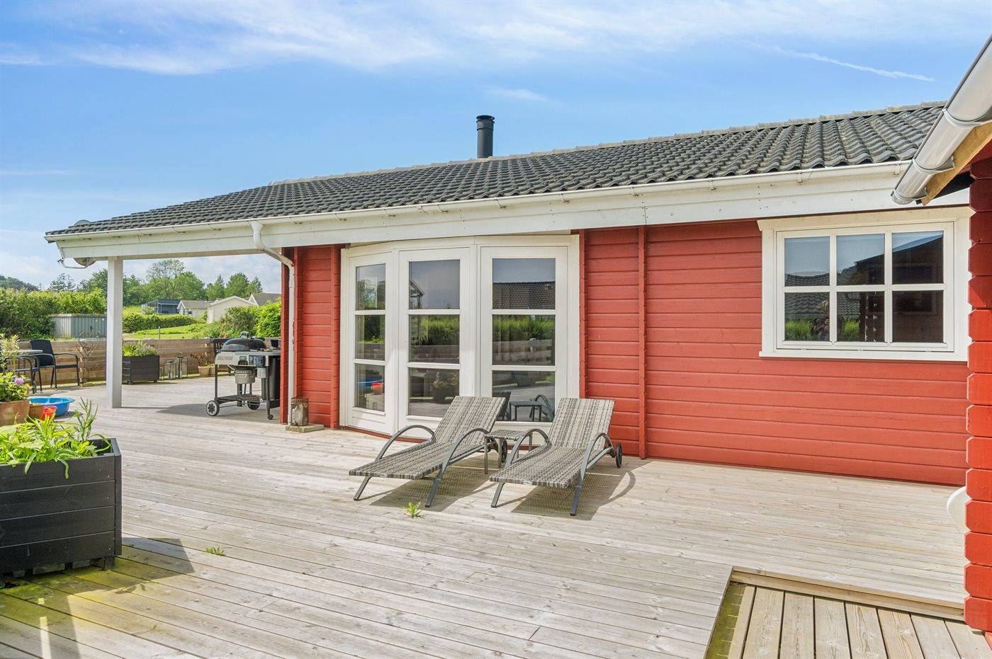 Ferieboligen er beliggende på en 1180 m² stor havegrund. Der er 600 m til havet. Nærmeste forretning er beliggende i en afstand af 850 m. Der er en golfbane i en afstand af 15000 m. Til ferieboligen hører 85 m² terrasseareal. Desuden er der 20 m² overdækket terrasse. Der er redskabsrum. Gynge. Sandkasse. Trampolin. Legetårn. Rutchebane. Grill til rådighed. Der er installeret stik til opladning af elbil. Parkering ved ferieboligen.