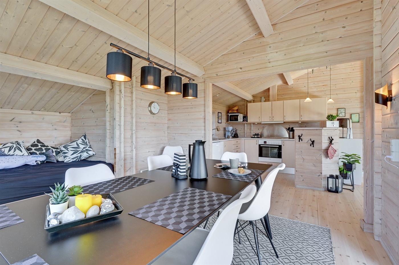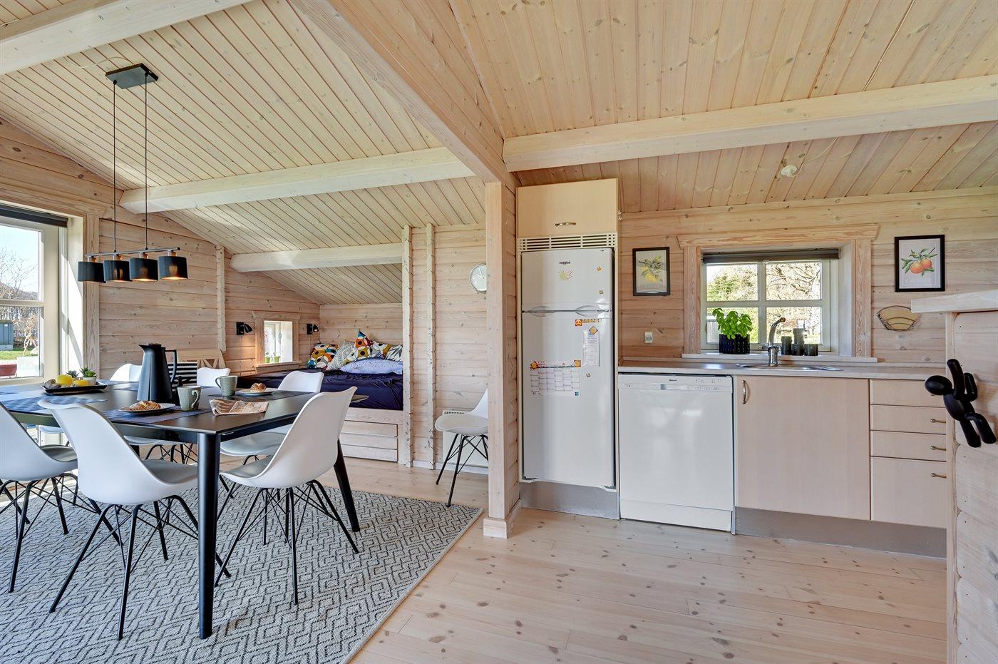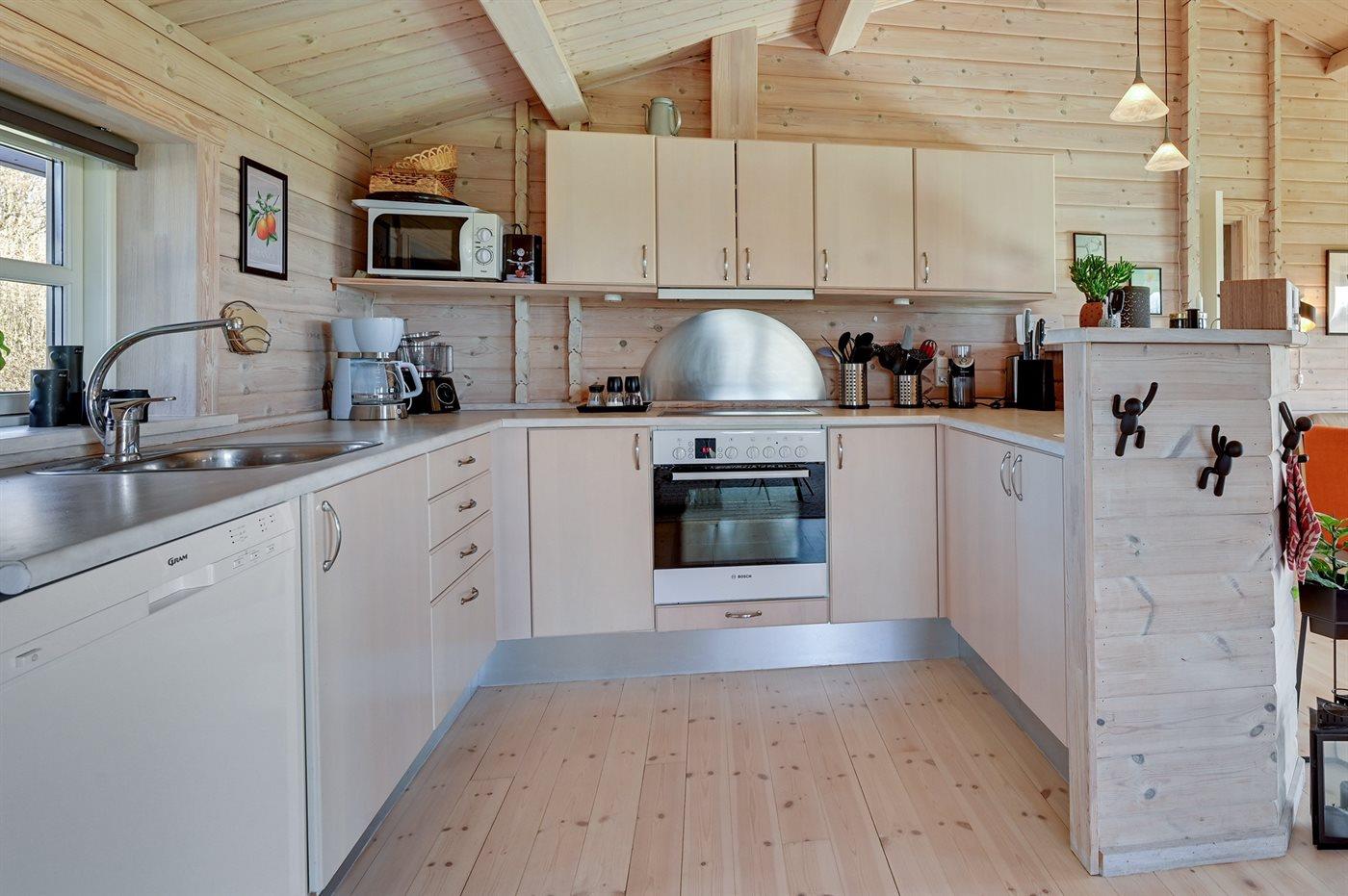 Køkkenet er udstyret med 1 køleskab. Der er 4 keramiske kogeplader, varmluftovn, mikrobølgeovn samt opvaskemaskine.