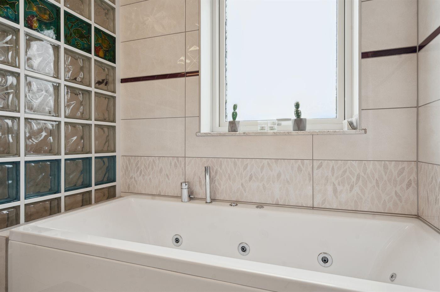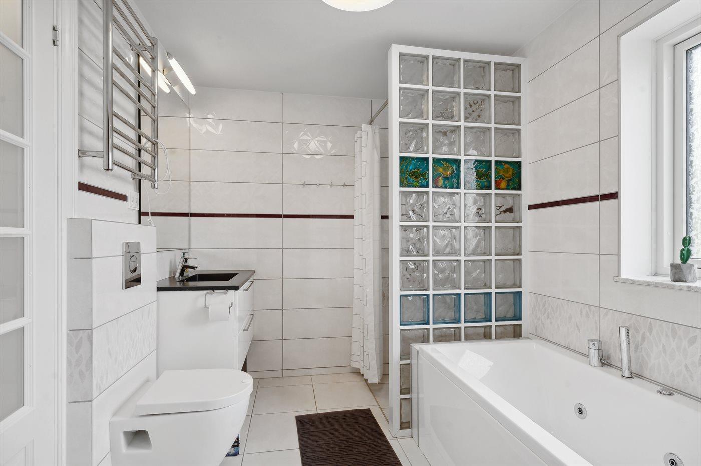 Der er 2 badeværelser med bruseniche og 3 toiletter, heraf 1 gæstetoilet. Der er gulvvarme på 2 badeværelser. I saunaen er der mulighed for afslapning.