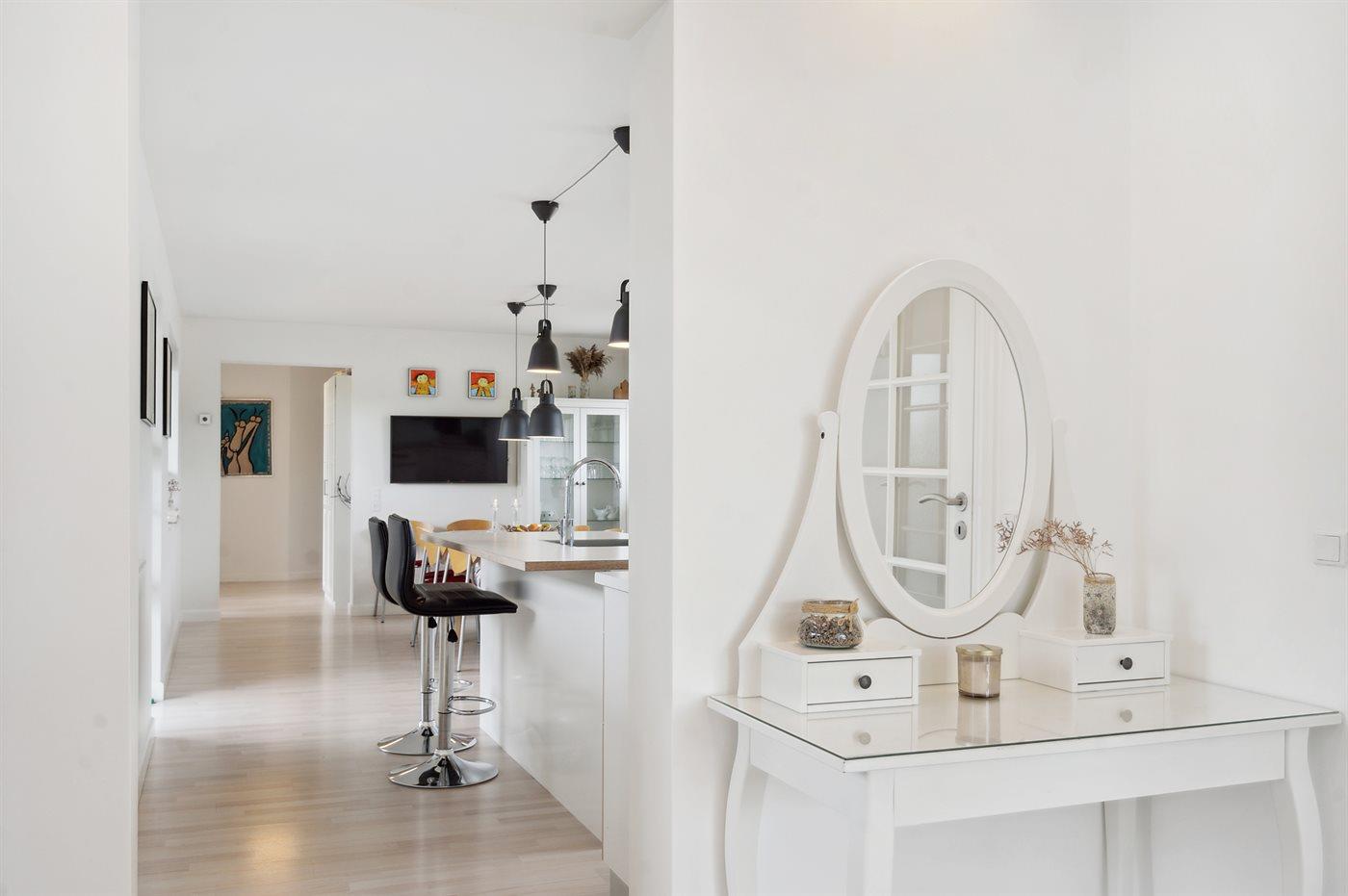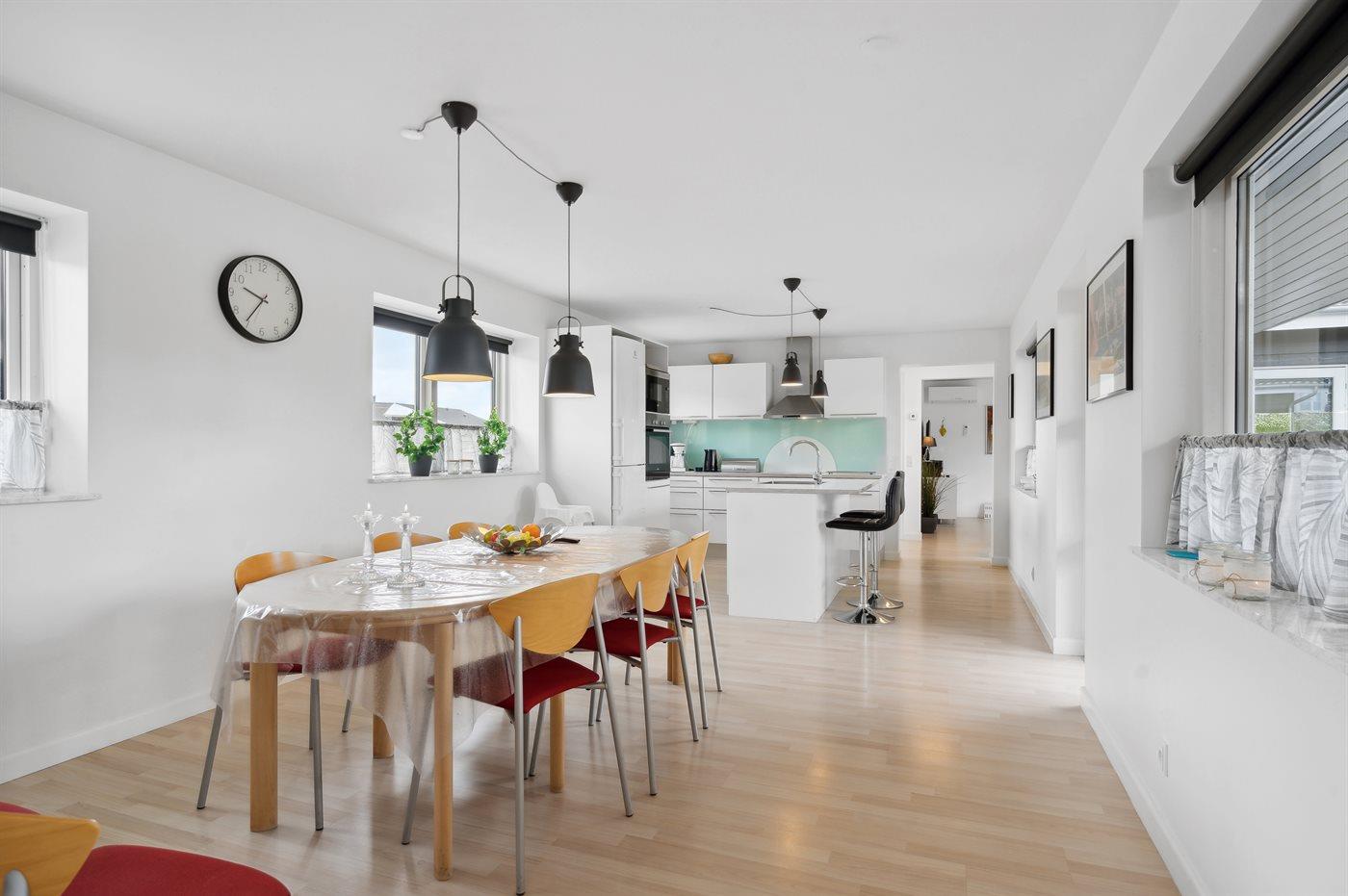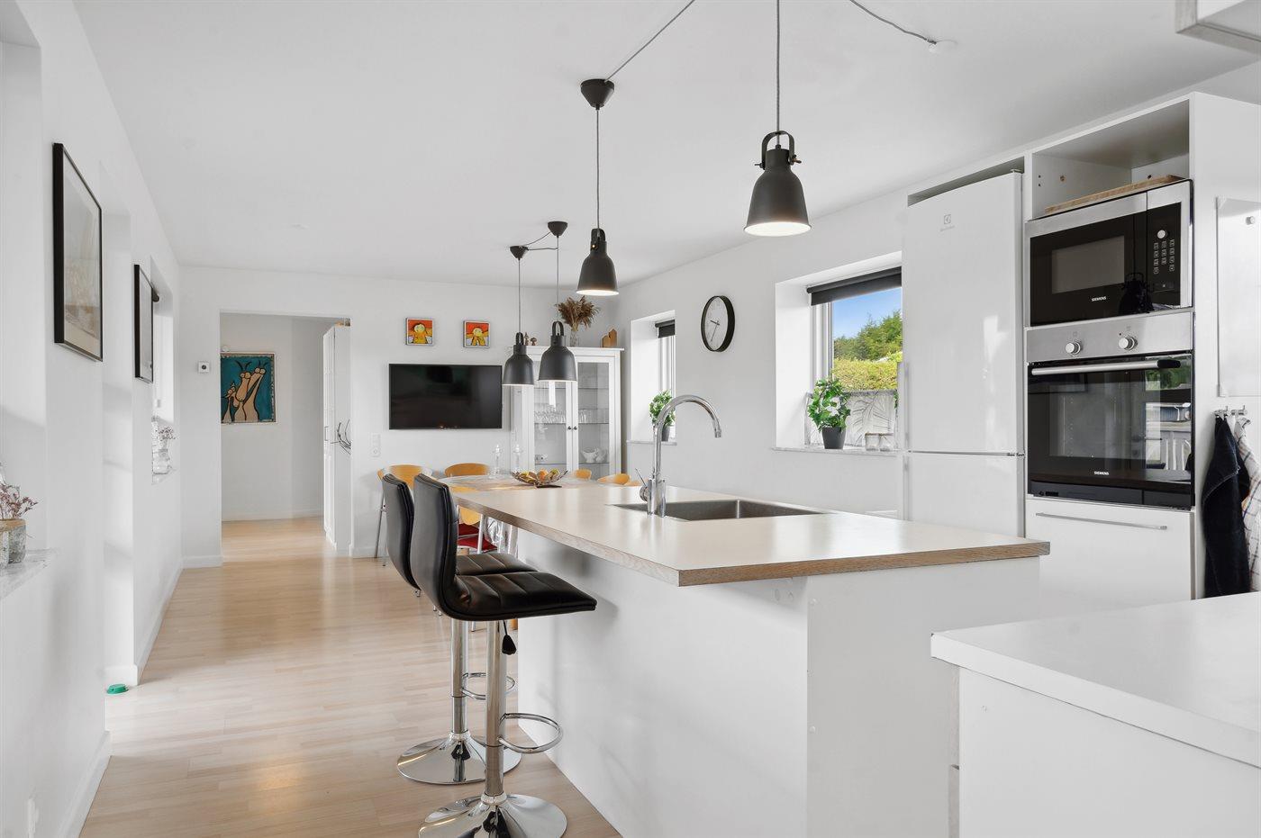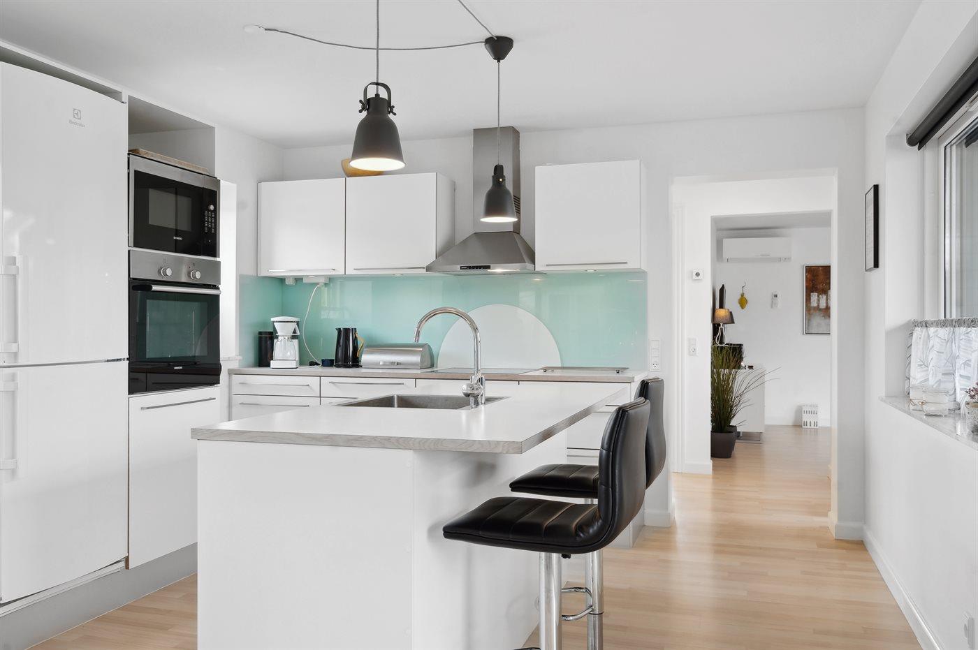 Køkkenet er udstyret med 1 køleskab. Der er 4 keramiske kogeplader, varmluftovn, mikrobølgeovn samt opvaskemaskine Der er gulvvarme i køkkenet.