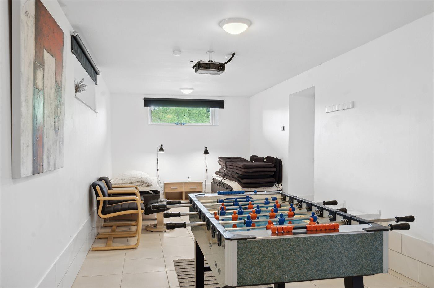 Dejligt, stort hus med en skøn beliggenhed. Fra det store sydvendte terrasseareal er der udsigt ud over den omkringliggende natur. Huset ligger på en stor grund, hvor der bl.a. er opsat legetårn med gynger m.m. I kælderen, som har egen indgang, findes det ene soveværelse med eget toilet. Her er også opsat bordfodbold. Der er 10 sovepladser i huset, men huset må kun bebos af max. 8 voksne, da sovesofaen i stuen er ment som et alternativ.