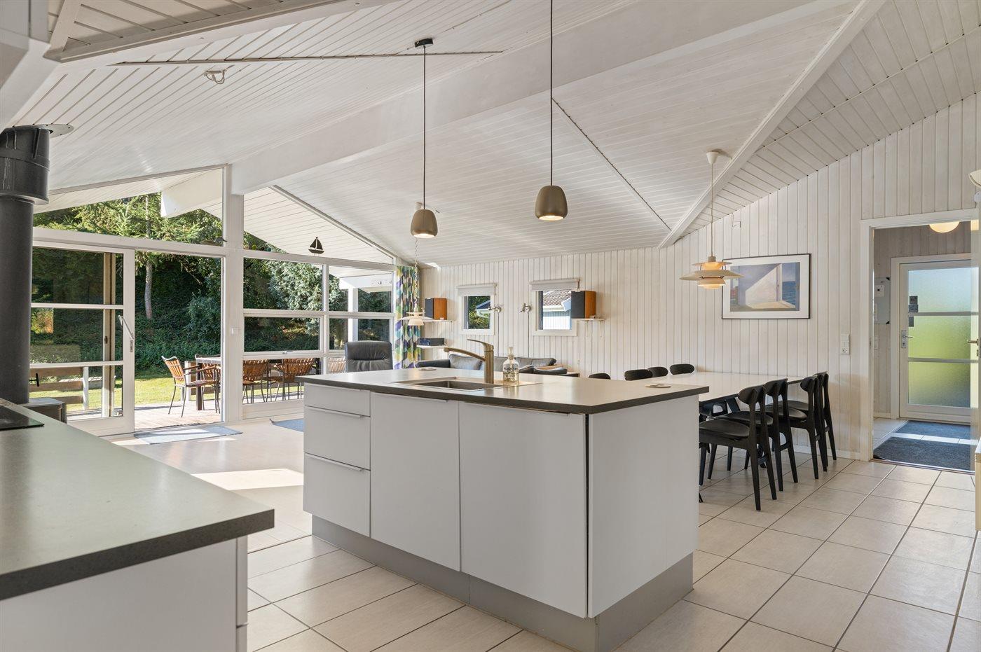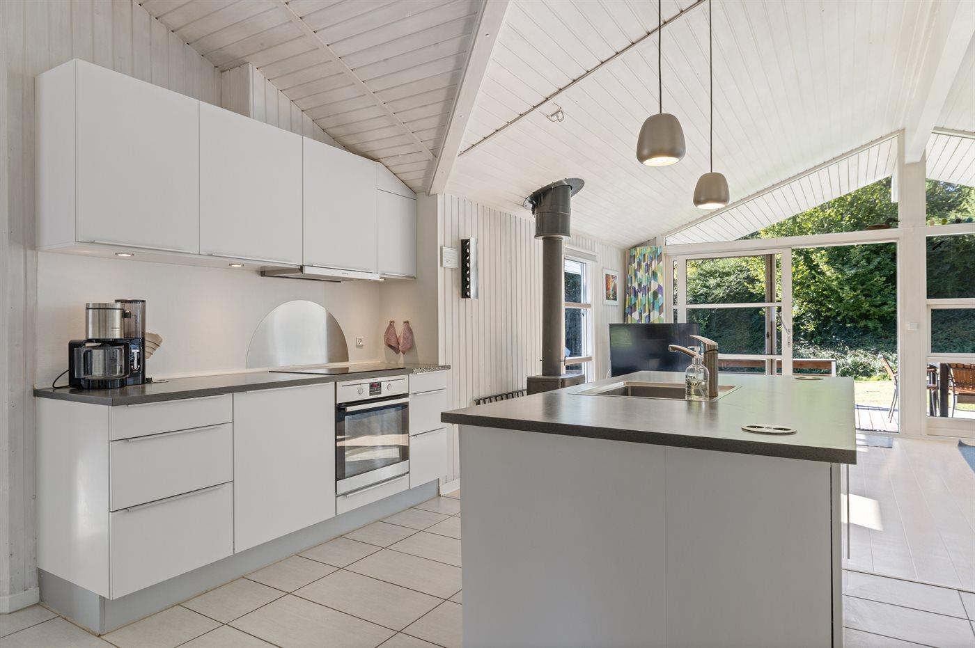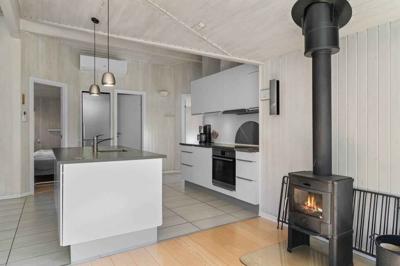 Køkkenet er udstyret med 1 køleskab. Der er 4 induktionskogeplader, varmluftovn, mikrobølgeovn samt opvaskemaskine.