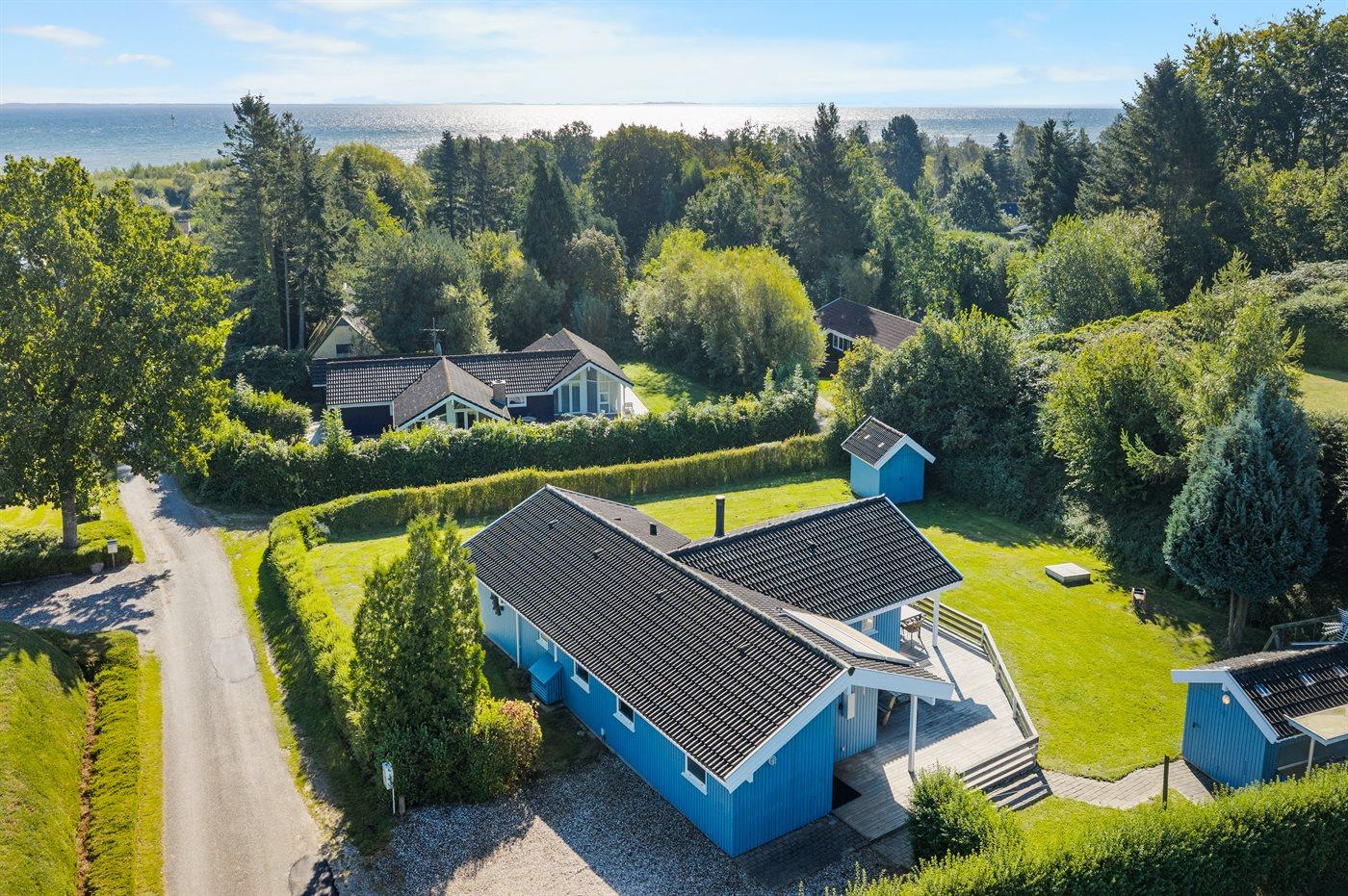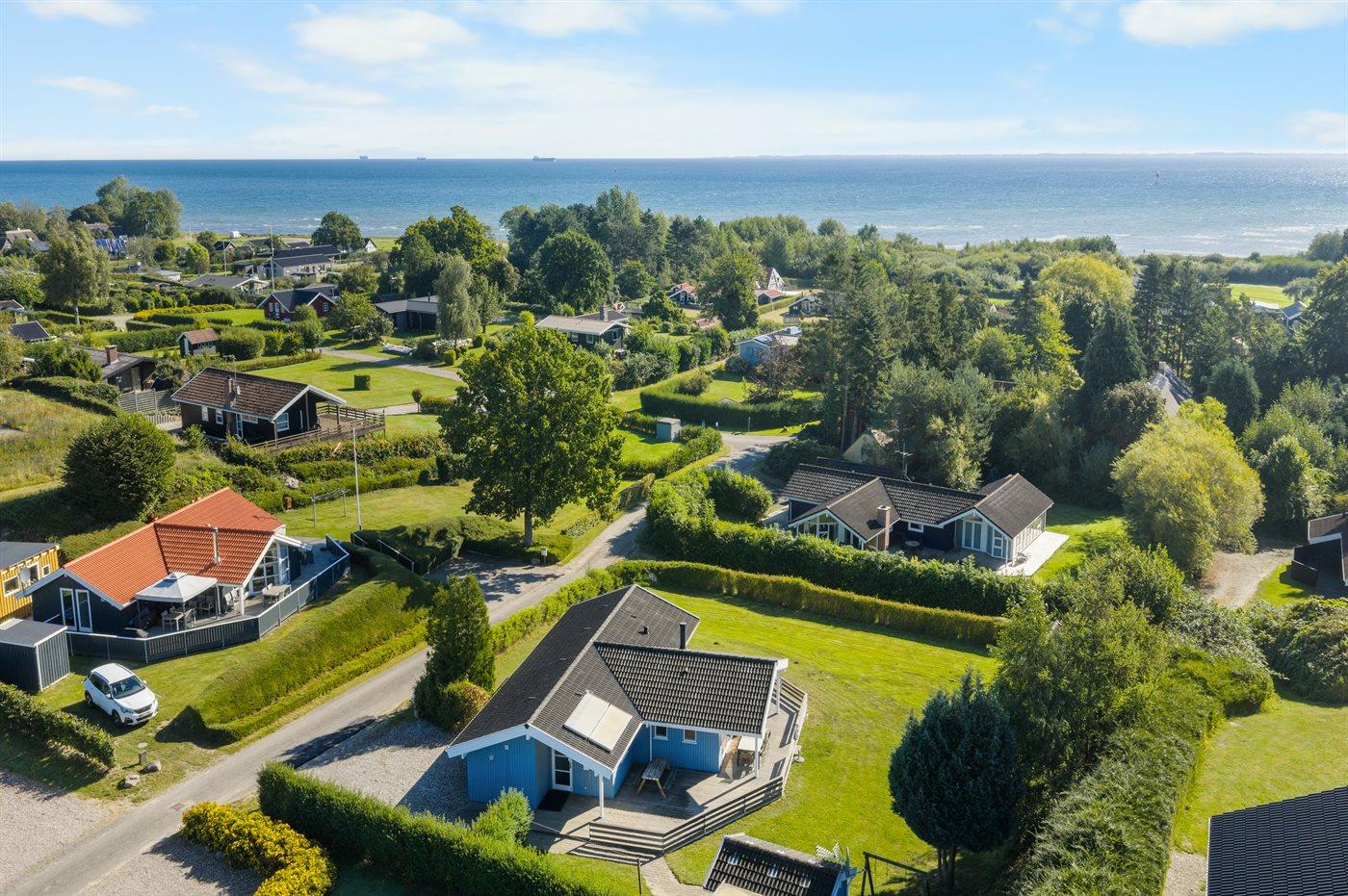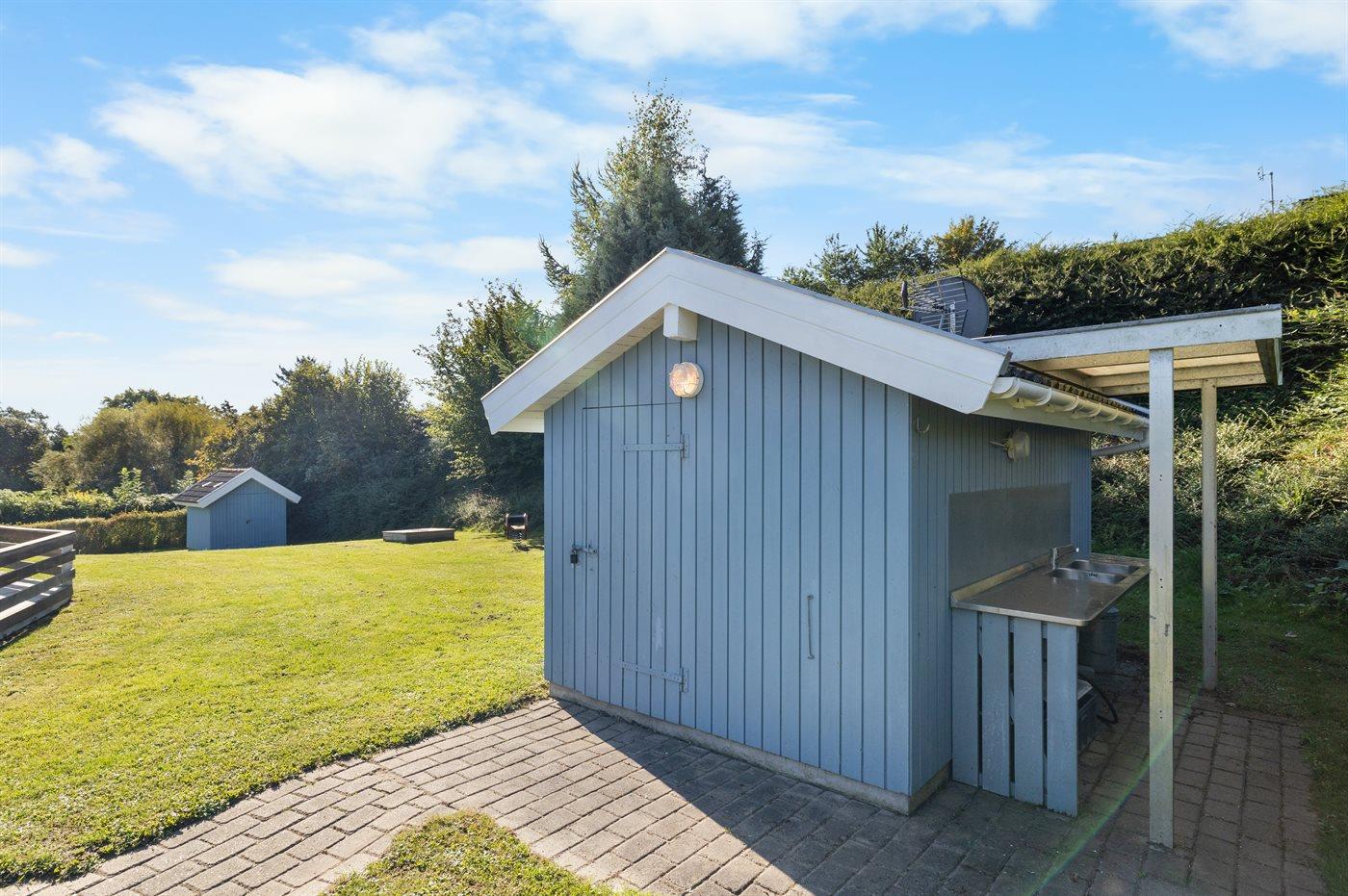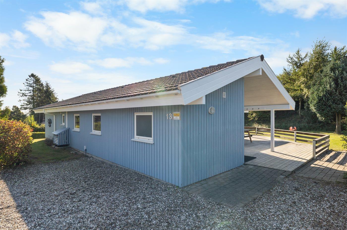 Ferieboligen er beliggende på en 1227 m² stor havegrund. Der er 350 m til havet. Nærmeste forretning er beliggende i en afstand af 1100 m. Til ferieboligen hører åbent terrasseareal. Desuden er der overdækket terrasse. Der er redskabsrum. Gynge. Sandkasse. Fodboldmål. Grill til rådighed. Udendørs bord. Parkering ved ferieboligen.