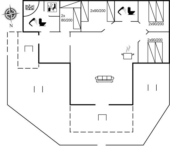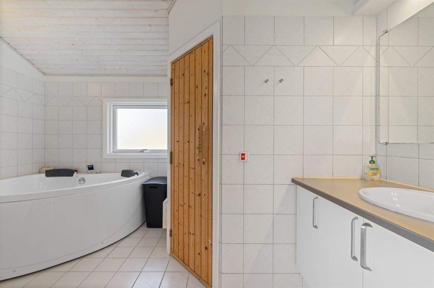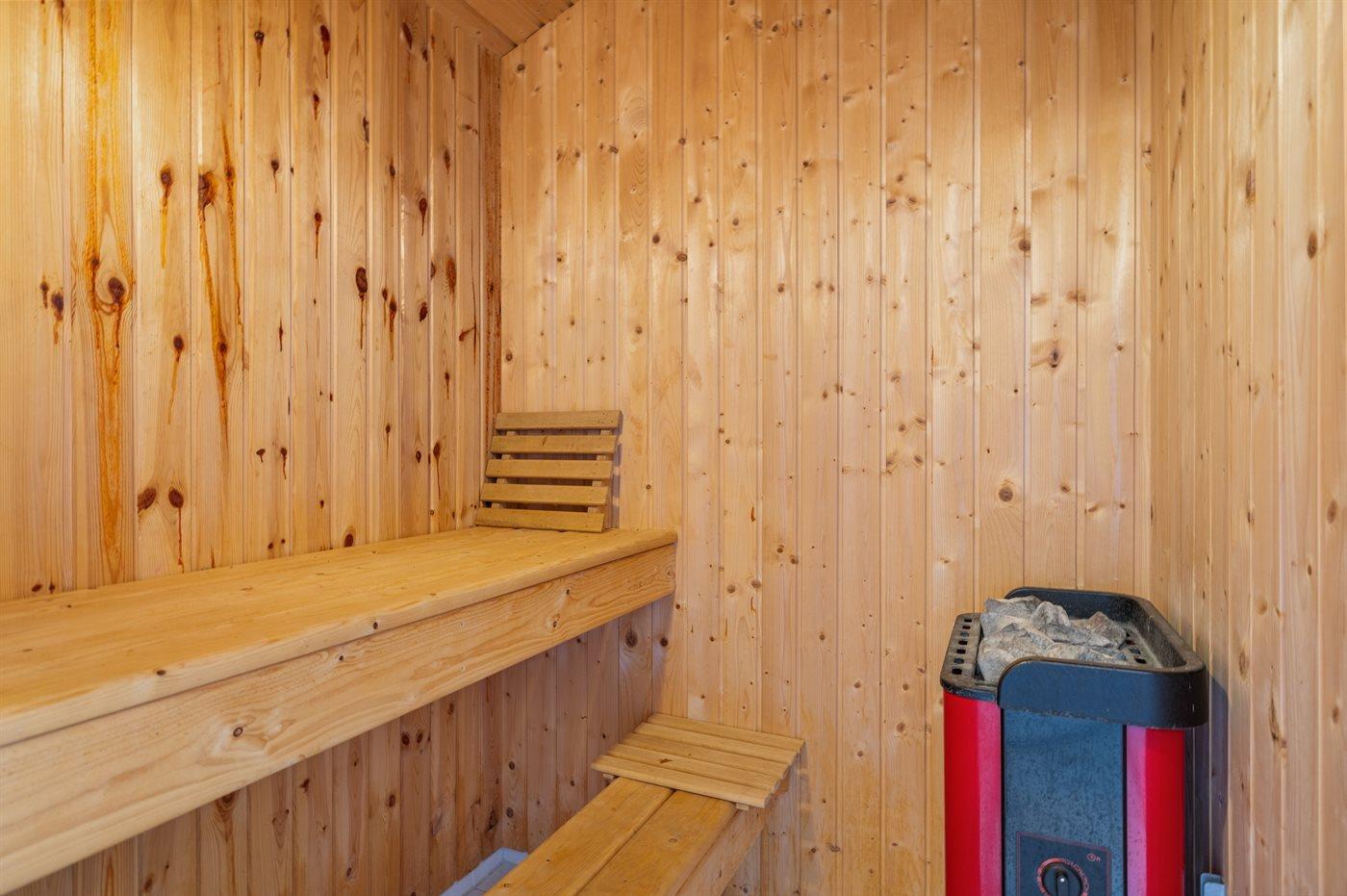 Der er 2 badeværelser med bruseniche og 2 toiletter. Der er gulvvarme på 2 badeværelser. I saunaen er der mulighed for afslapning.