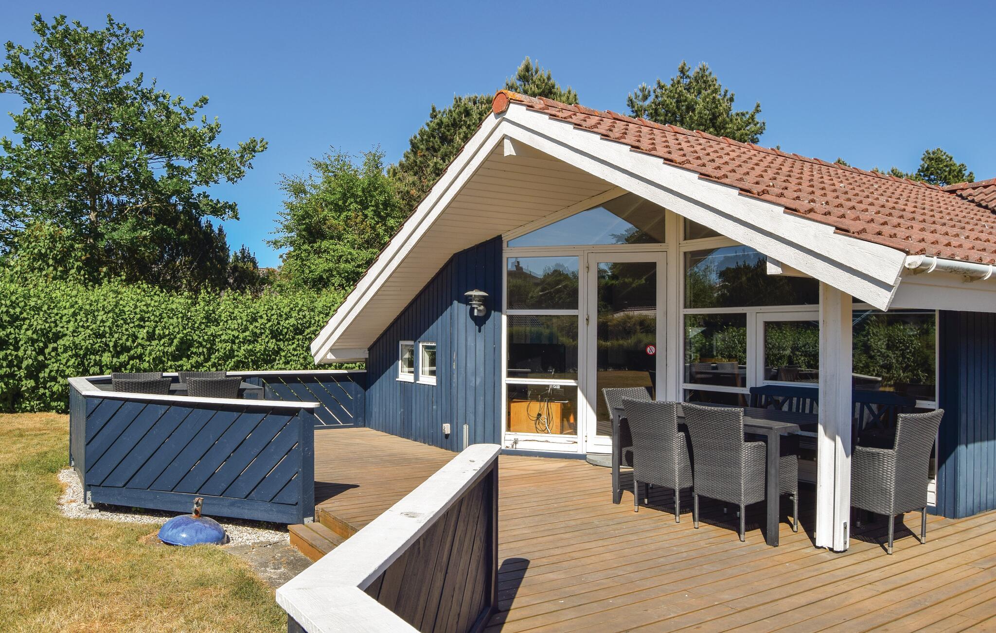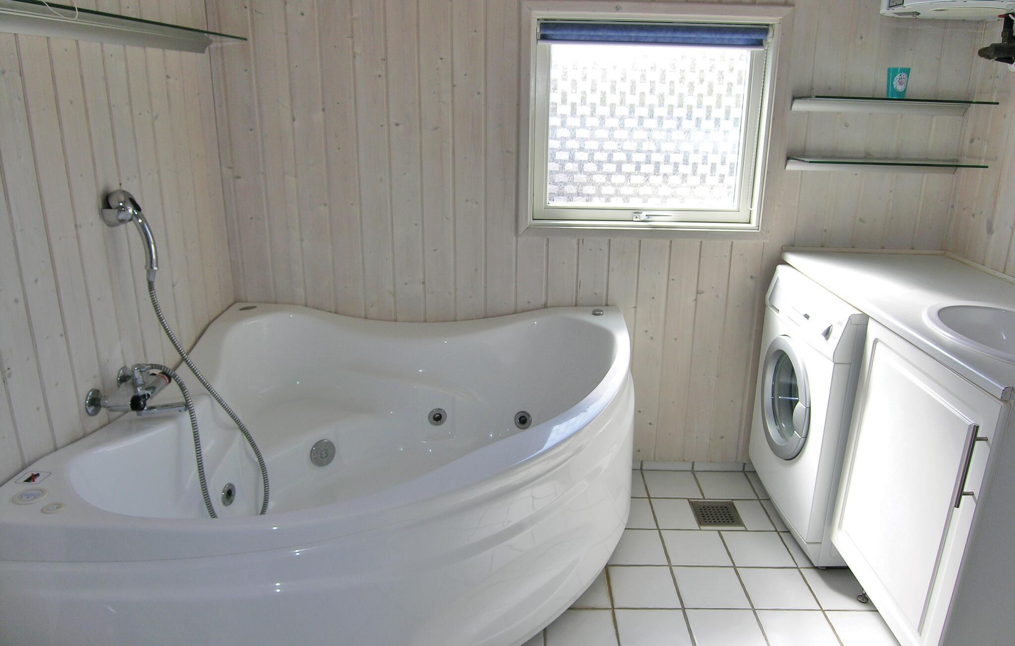 Dette dejlige træferiehus ligger i et feriehusområde i Spodsbjerg i 2 række fra familievenlig strand. Huset er udstyret med mange moderne faciliteter. I Badeværelset er der spabad til to personer og direkte adgang til saunaen. Af husets 10 sovemuligheder er de to i alkoven med mulighed for, at se tv i direkte forbindelse med opholds- og spisestue.