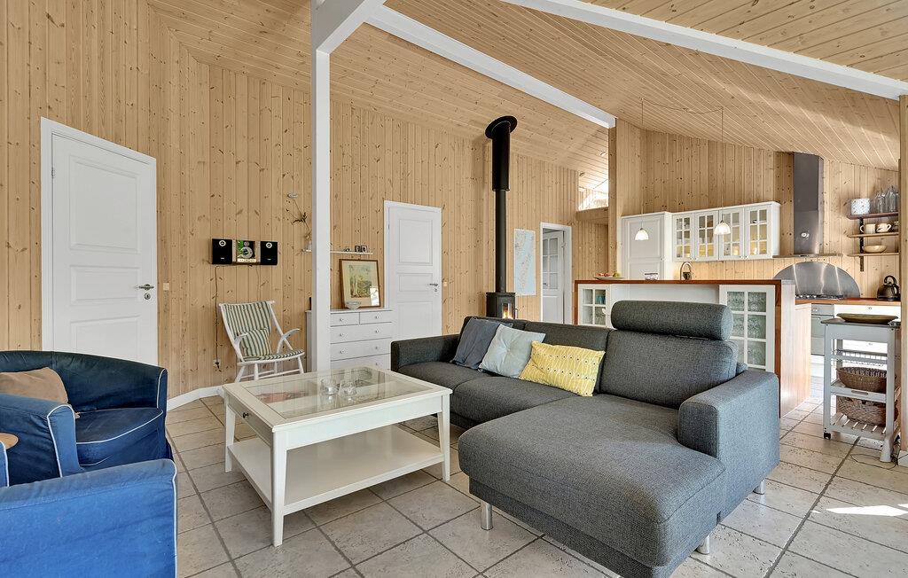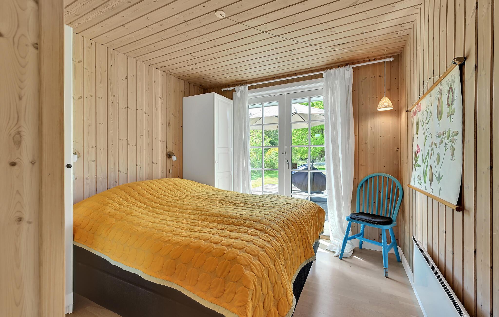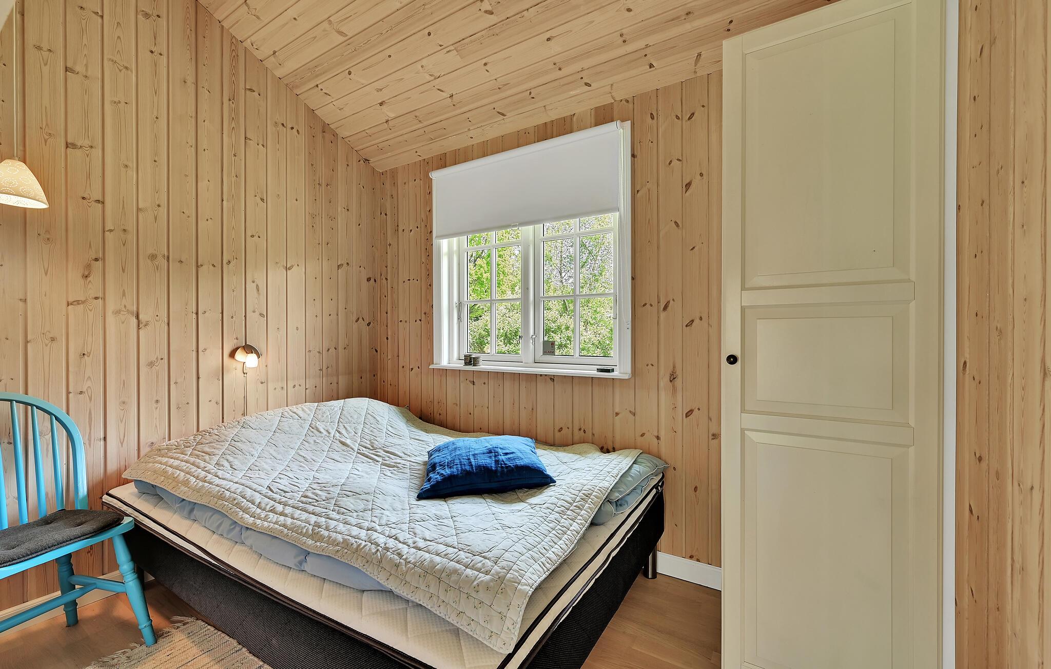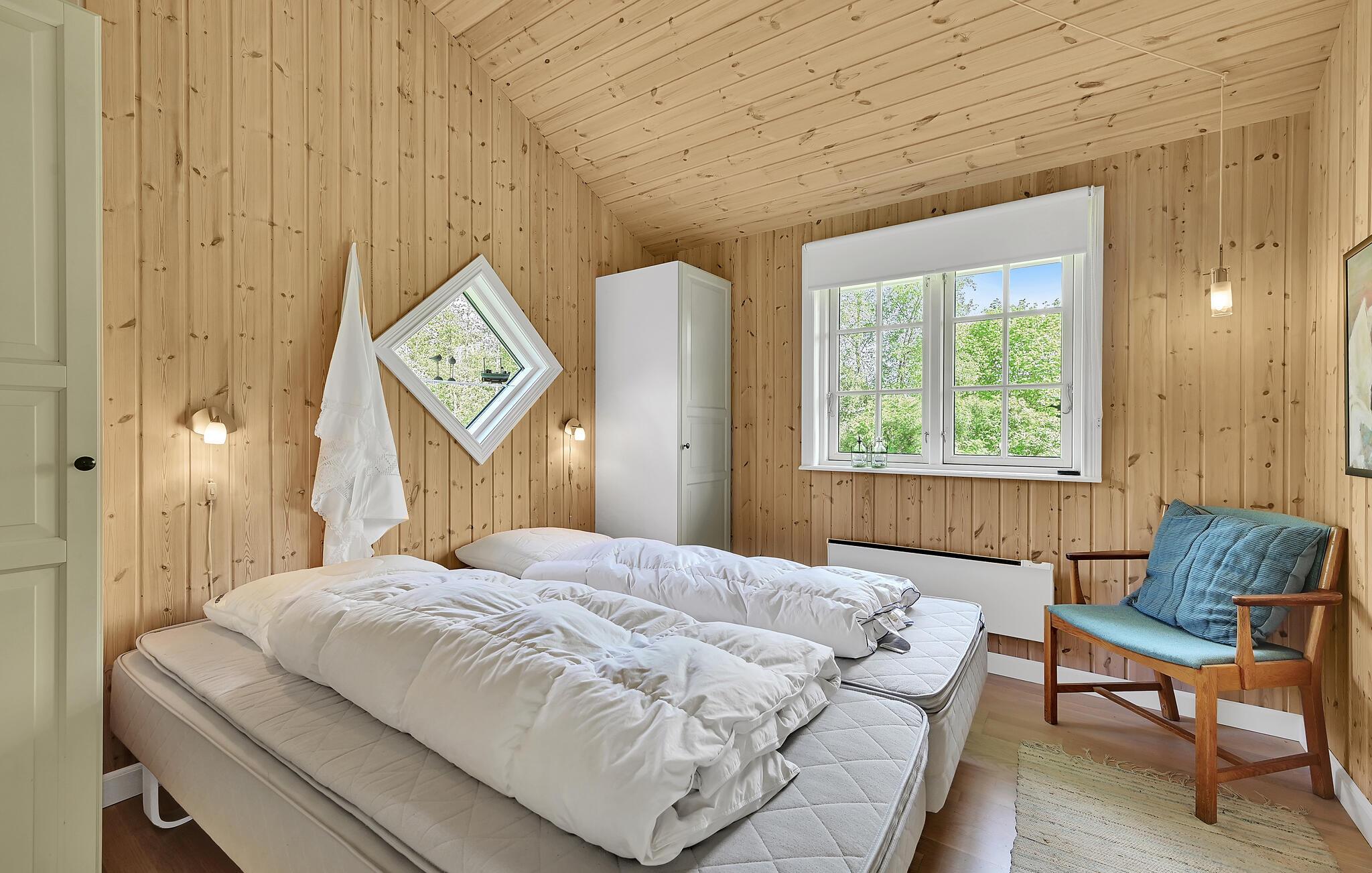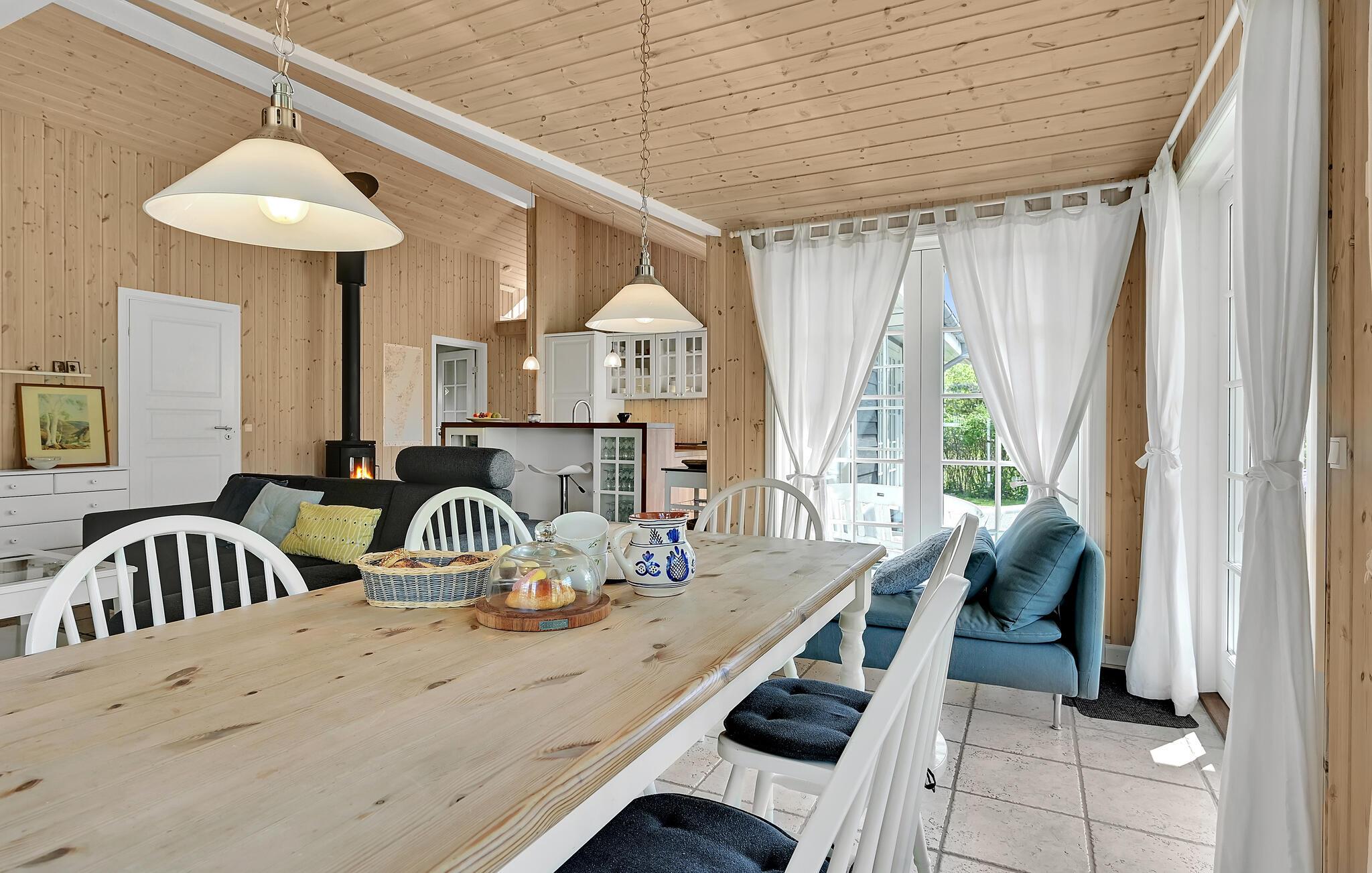 Lyst træhus nær vandet i Spodsbjerg med sauna, brændeovn og moderne faciliteter for en dejlig ferie.