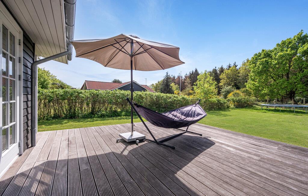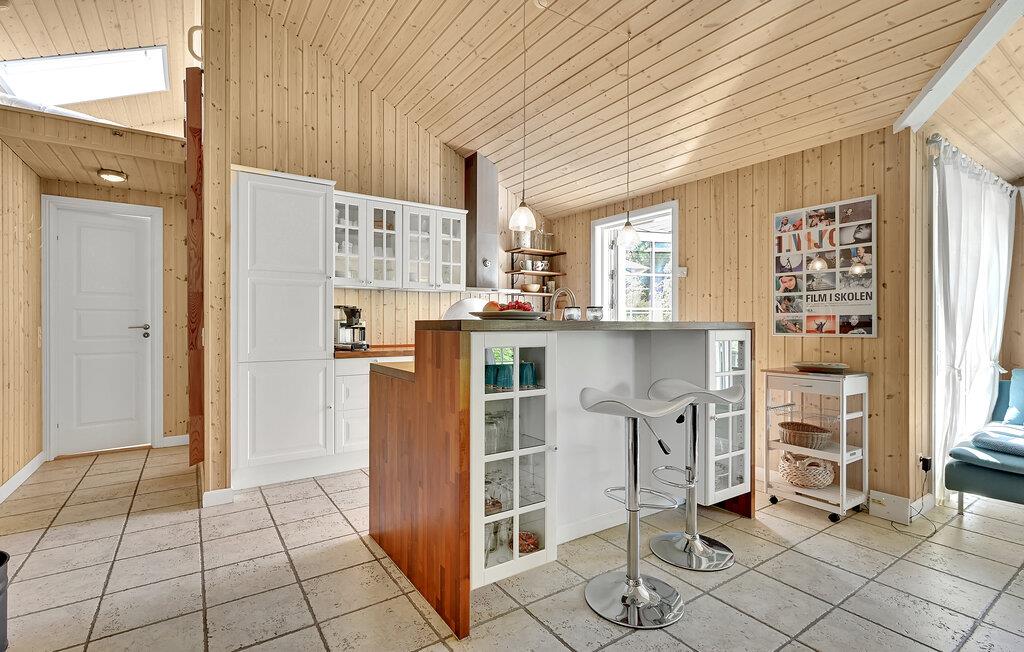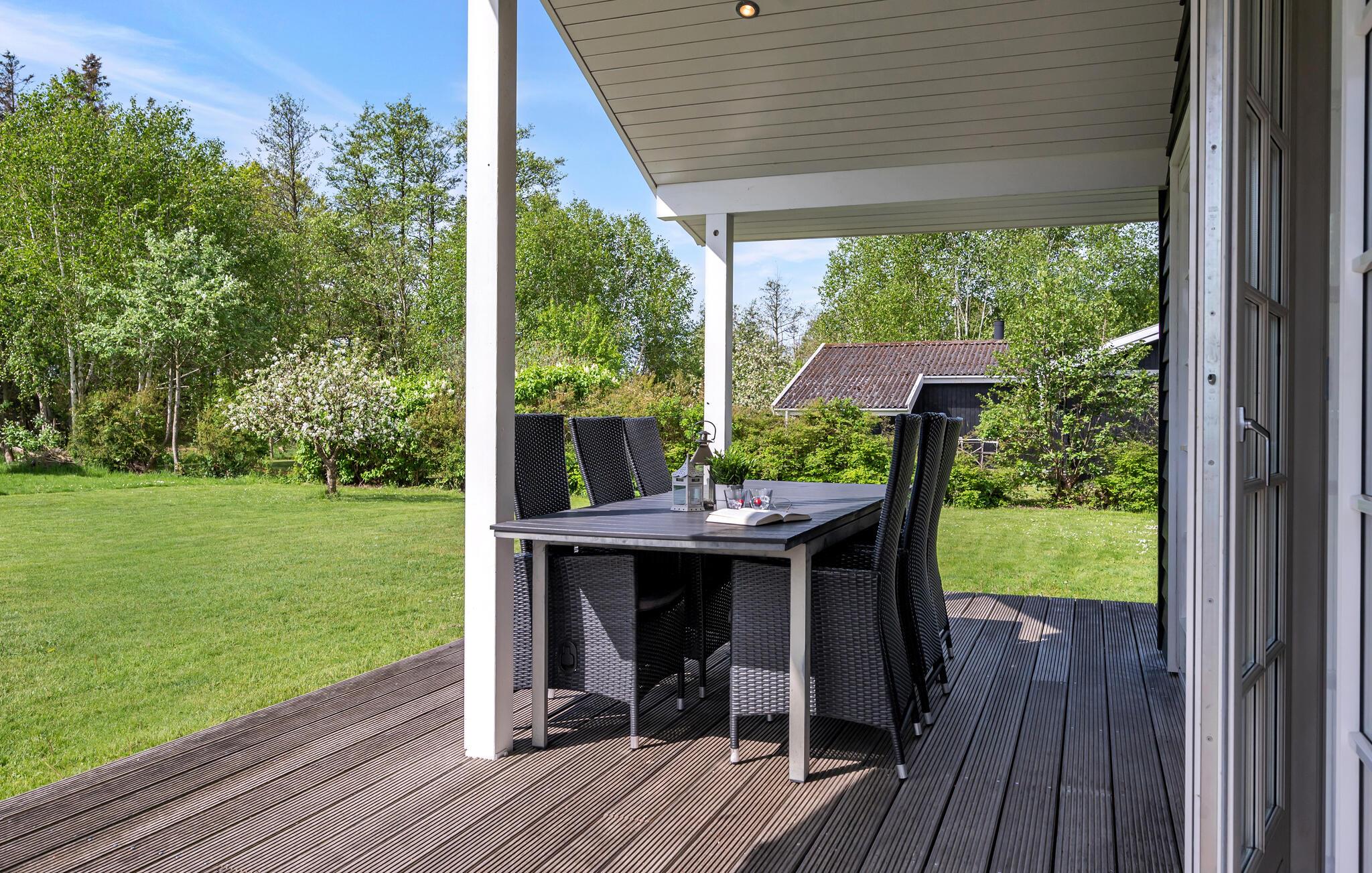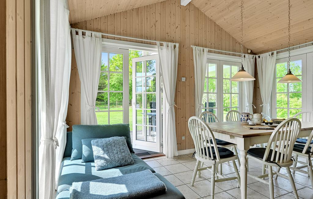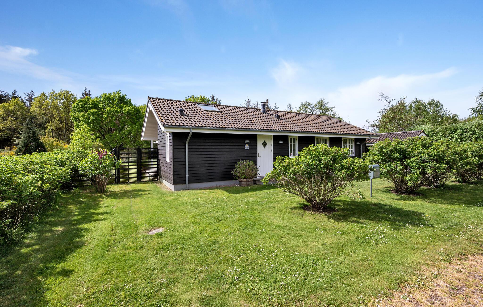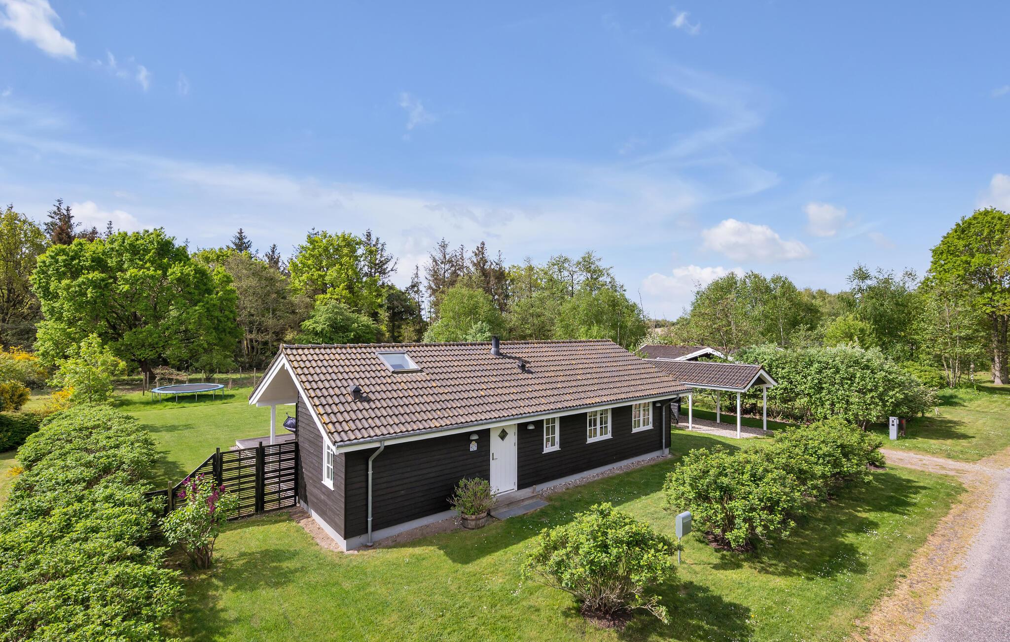 Lyst træhus nær vandet i Spodsbjerg med sauna, brændeovn og moderne faciliteter for en dejlig ferie.