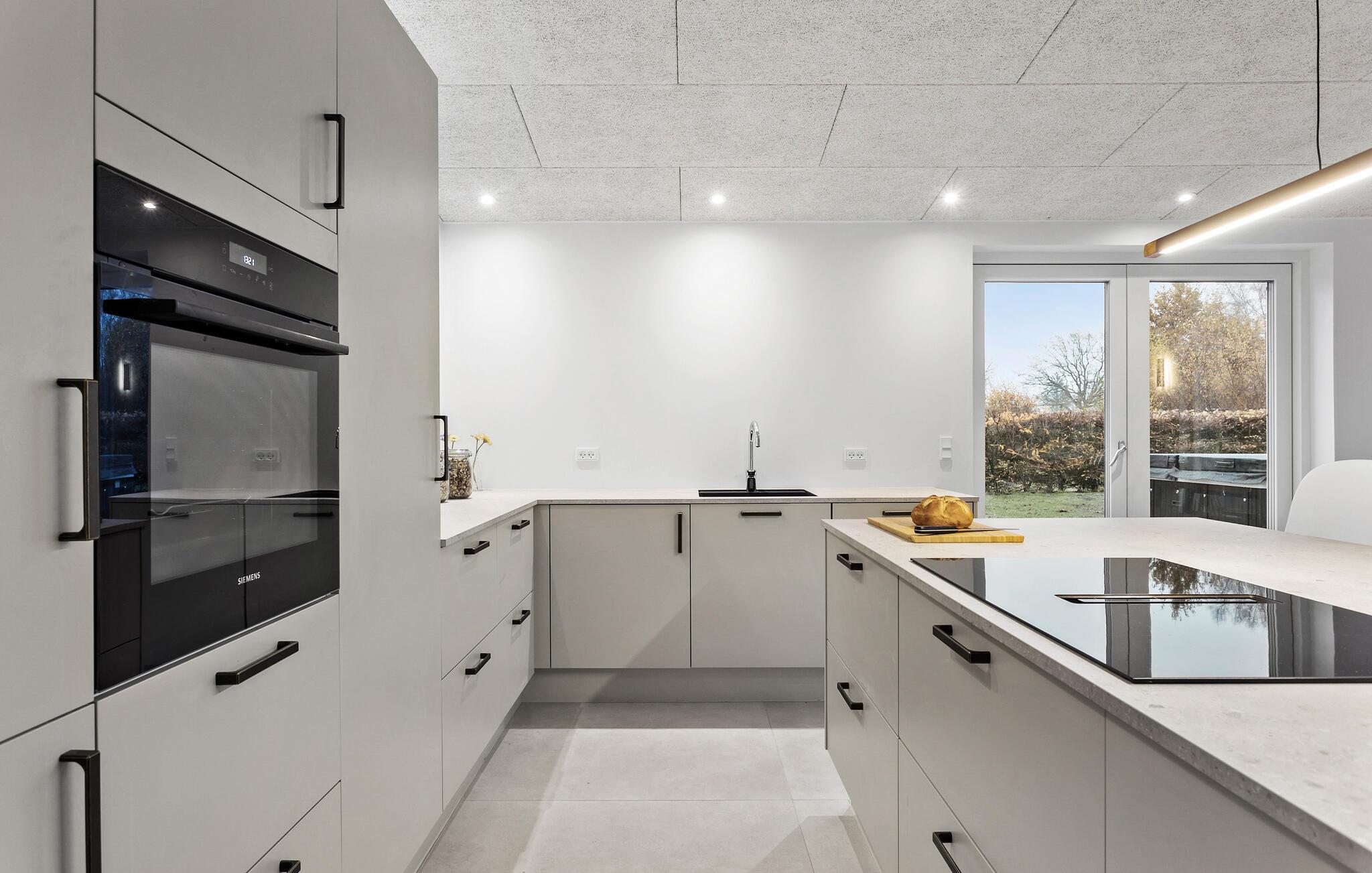 Moderne sommerhus i Spodsbjerg med stor terrasse og spabad for afslapning tæt på havet.