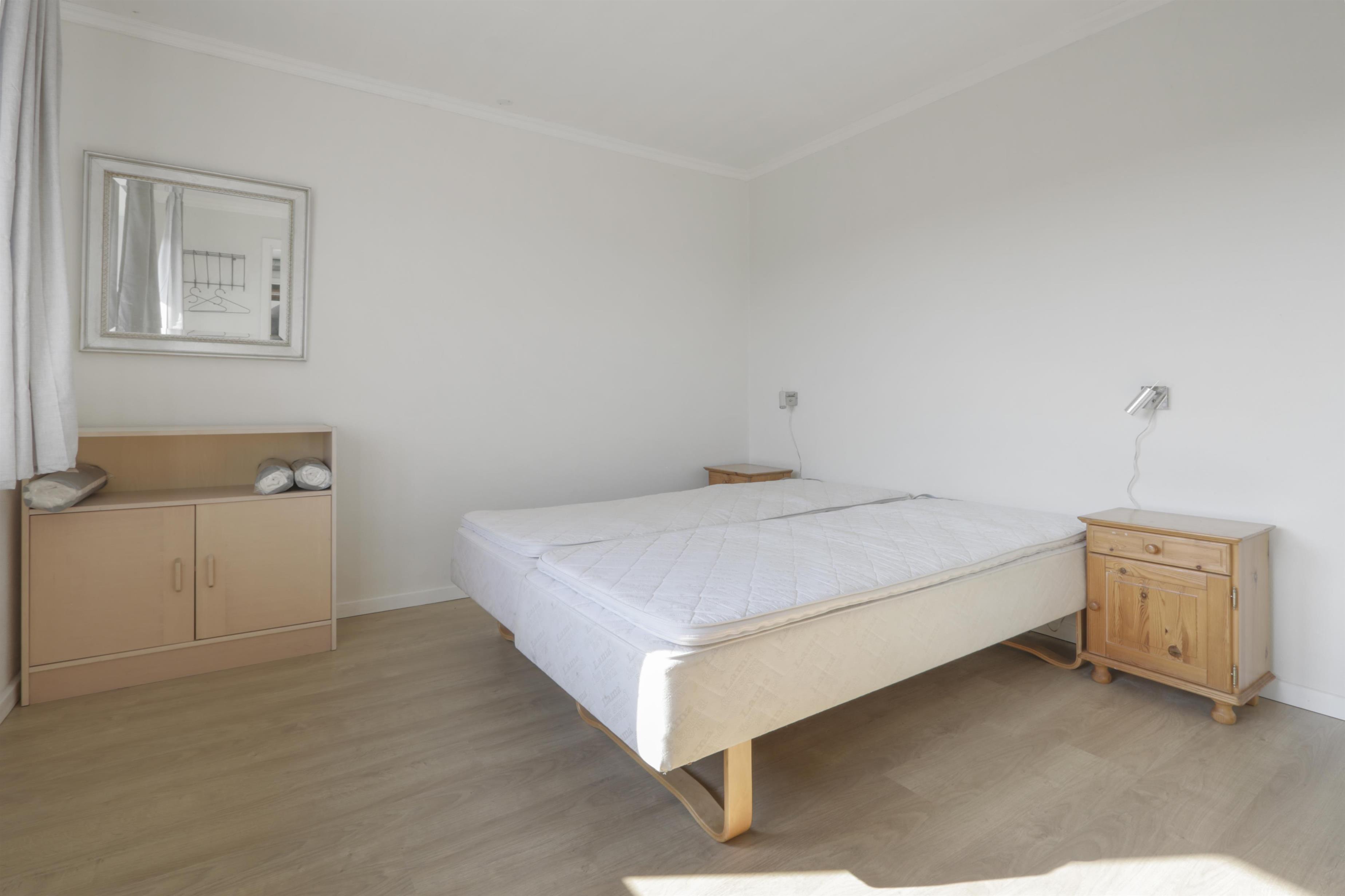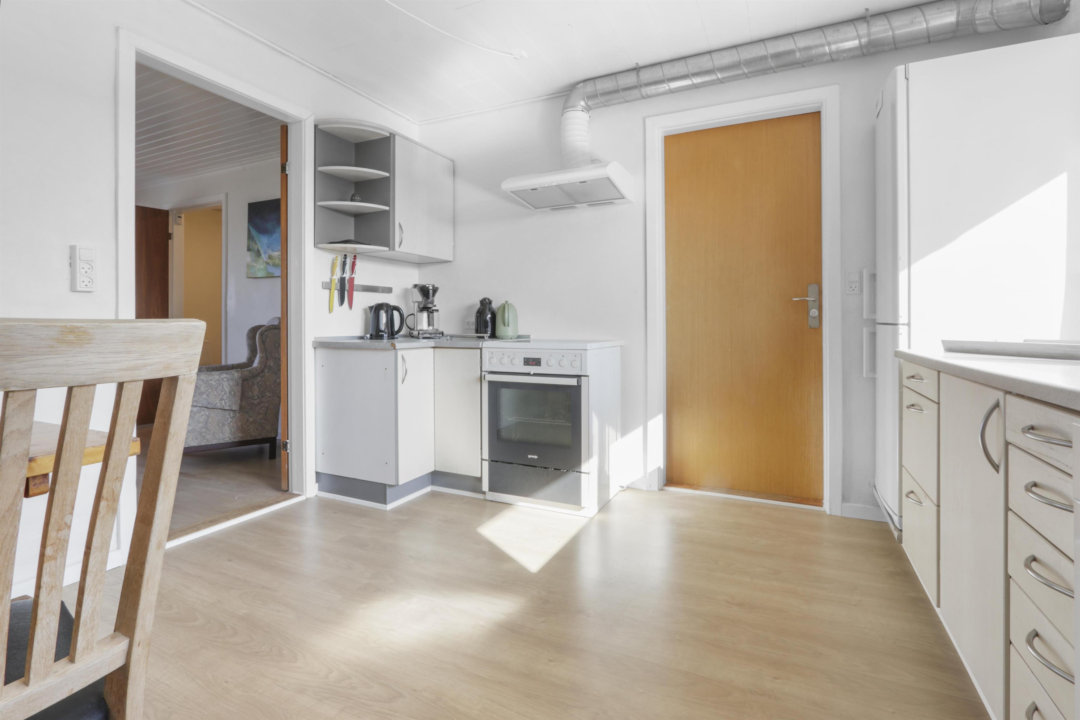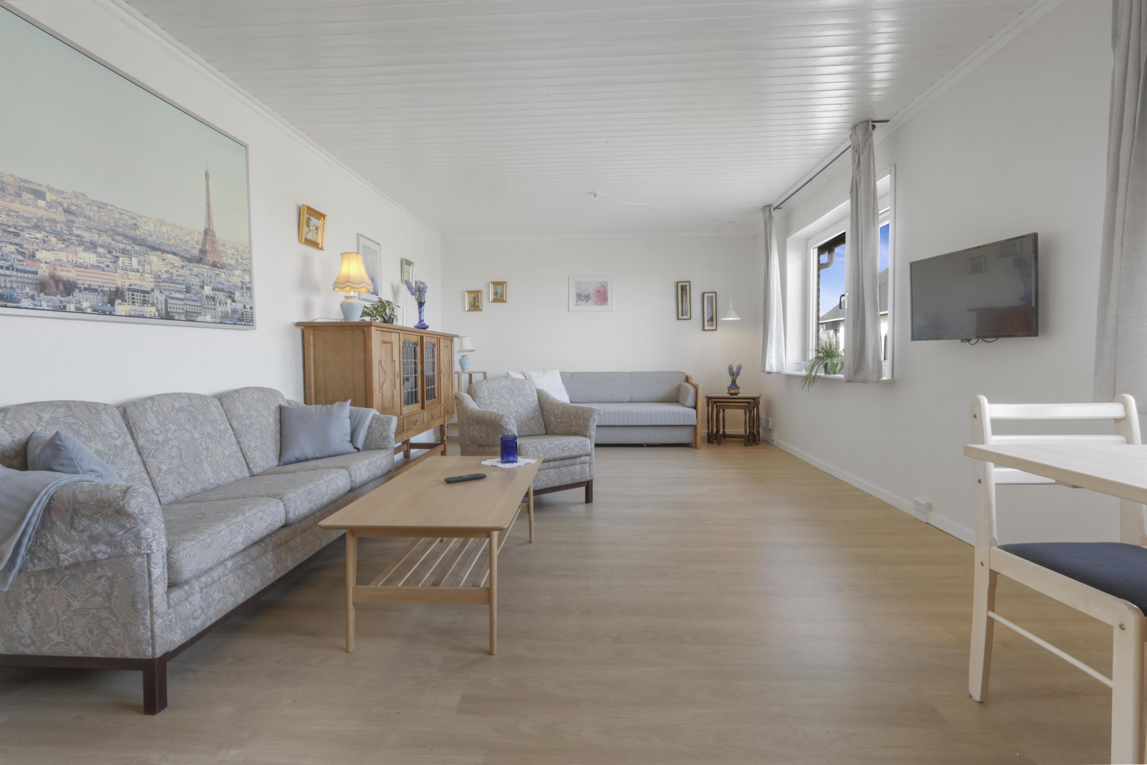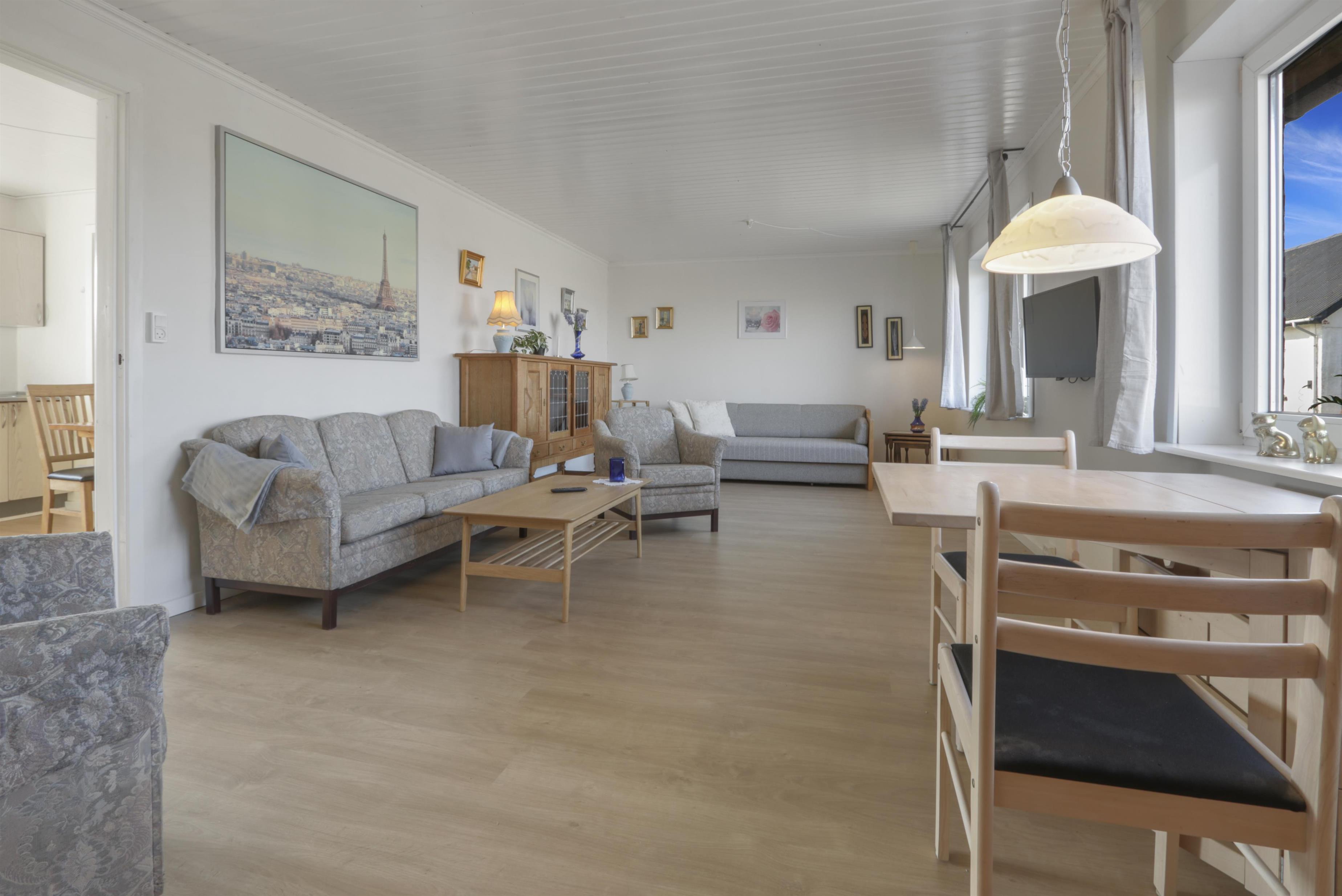 Lejligheden er enkelt og praktisk indrettet. Køkken med spiseplads, glaskeramisk komfur, emhætte, opvaskemaskine og køleskab med fryseboks. Fra køkkenet er der adgang til et stort soveværelse (1DS). Opholdsstue med TV med tyske og danske kanaler og sovesofa (2 personer). Renoveret badeværelse med toilet, håndvask, bruser, vaskemaskine og klinkegulv. Hele lejligheden opvarmes af et nyt og bæredygtigt luf til vand anlæg.