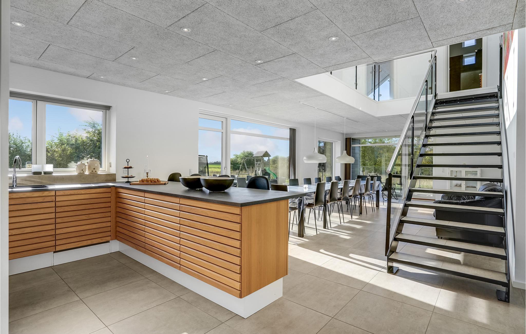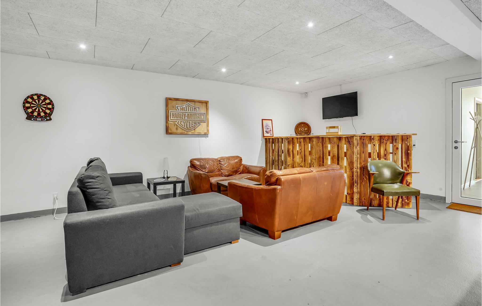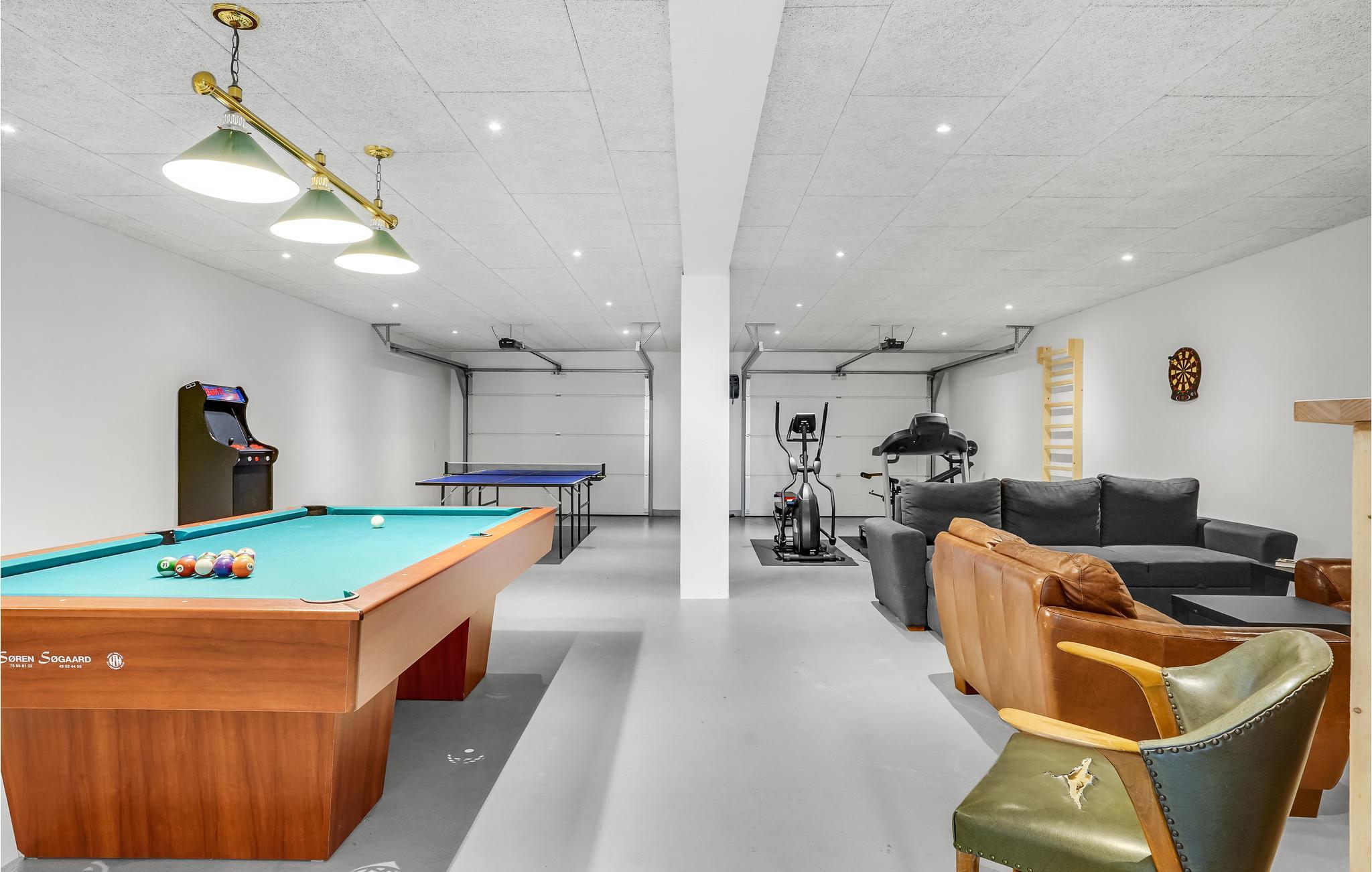 Huset er lyst og komfortabelt indrettet og skaber perfekte rammer for et ophold, I vil huske med glæde. Der er gulvvarme i hele huset, så det er behageligt hele året rundt. Huset har 5 værelser med dobbeltsenge, og værelse nr. 6, som ligger i kælderen, har 2 dobbeltkøjer og 2 ekstra madrasser. I aktivitetsrummet i kælderen kan I dyste i billiard, dart og bordtennis, og til jeres børn er der diverse legeredskaber, de kan underholde sig med. Her finder I også en attraktiv bar med fjernsyn, hvor I kan hygge jer. I kælderen finder I også træningsfaciliteter og arkademaskine, så her er underholdning til enhver smag.