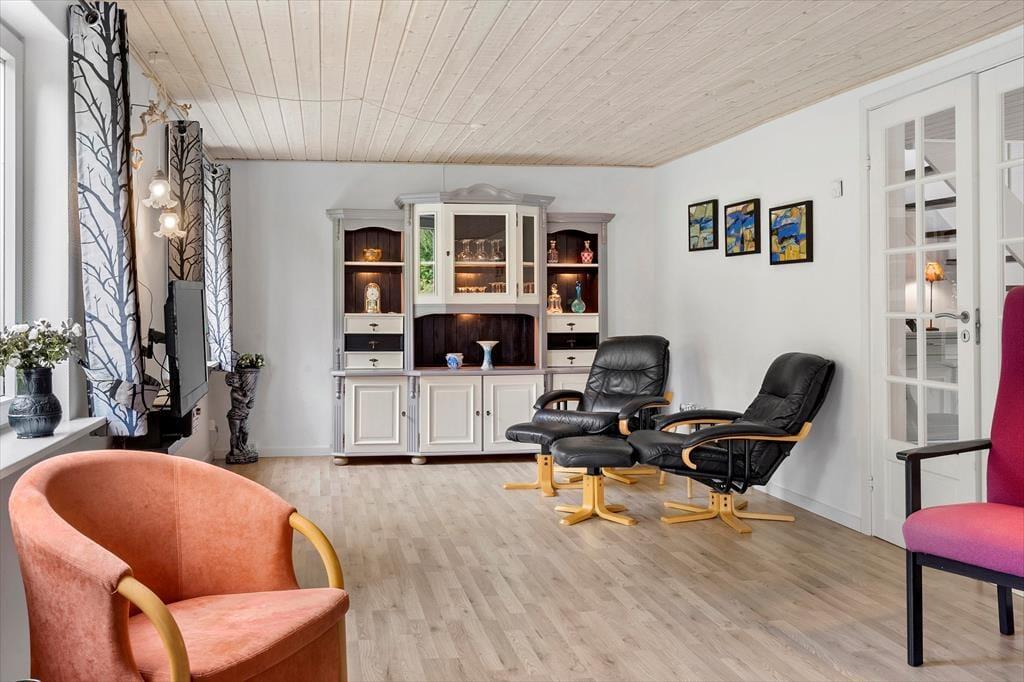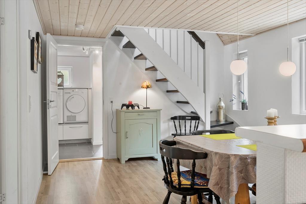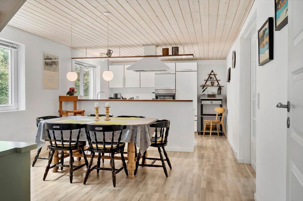 Når I træder indenfor i dette skønne og totalt renoverede feriehus, vil jeres øjne straks vandre over alle de smukke detaljer der giver huset en fantastisk stemning man kun kan blive glad over. Det store køkkenalrum giver jer alle muligheder for at nyde hinandens selskab på tværs af diverse aktiviteter, så tænd op under gryderne, imens andre spiller kort om spisebordet. Når I trænger til en rolig stund for hele familien så smid jer i den hyggelige stue og nyd en god film i fjernsynet og lad batterierne op til en ny dag med at udforske det dejlige område.