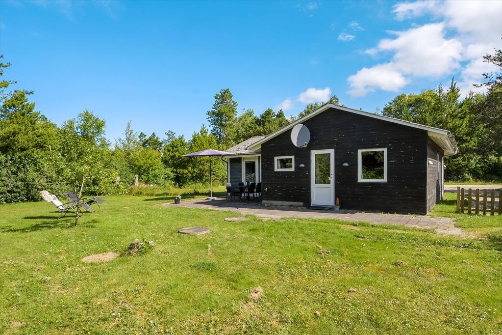 Sommerhusets terrasse er sydvendt, så den vender ud mod den ugenerede baghave og er samtidig godt orienteret i forhold til solen. Foretrækker I skygge, kan I slå parasollen op, inden I finder kølige drikke frem og gør klar til sommerfrokosten.