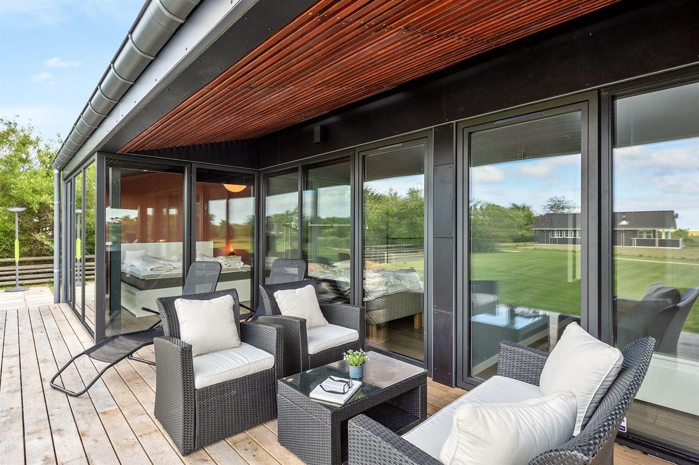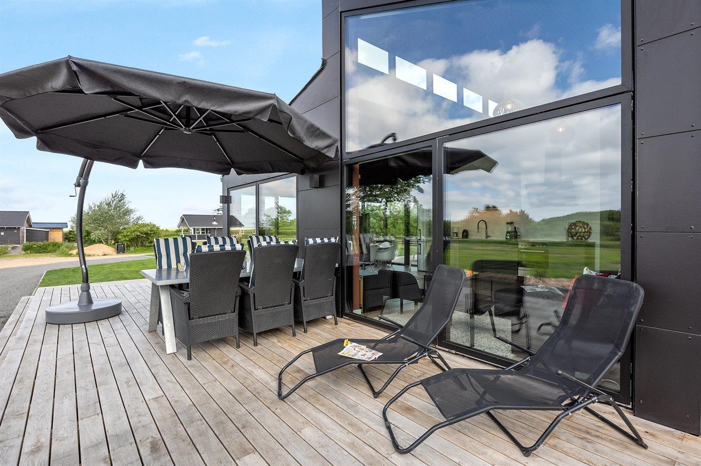 Ferieboligen er beliggende på en 1202 m² stor naturgrund. Der er 25000 m til havet. Der er 250 m til fjorden. Nærmeste forretning er beliggende i en afstand af 900 m. Der er en golfbane i en afstand af 7000 m. Til ferieboligen hører 80 m² terrasseareal. Desuden er der 24 m² overdækket terrasse. Trampolin. Parkering ved ferieboligen.