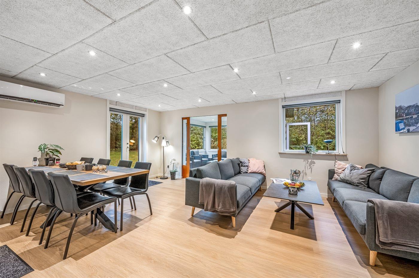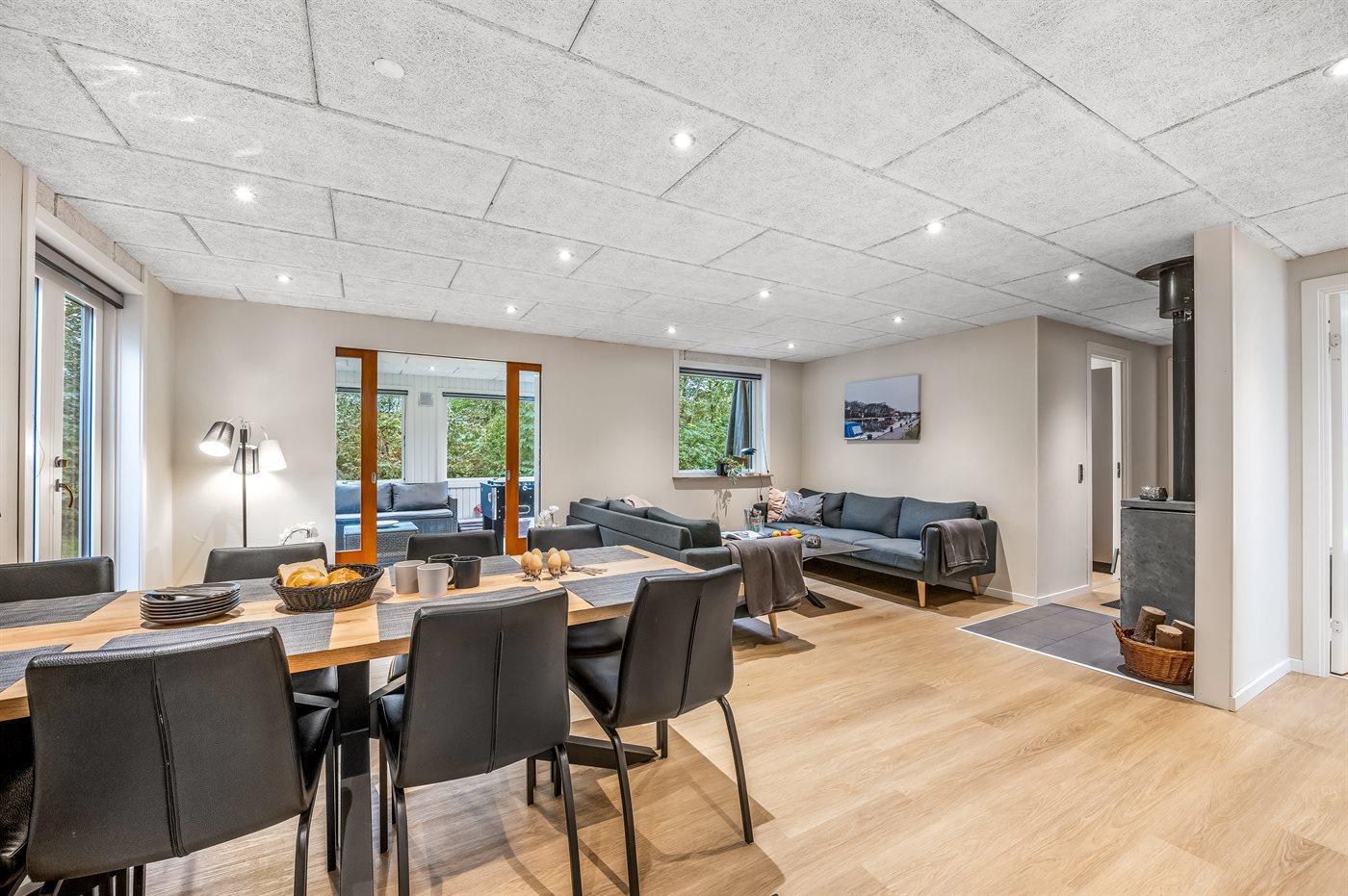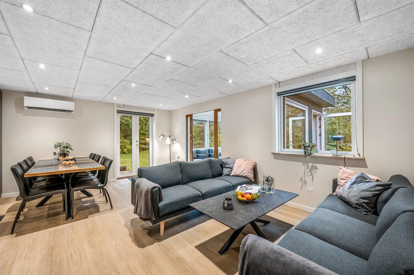 Feriehuset blev totalrenoveret i 2023 og fremstår moderne med kvalitetsmaterialer. Indretningen rummer fire gode værelser samt et lyst og åbent køkken-alrum i forbindelse med stuen. Fra stuen er der adgang til en hyggelig udestue via en stor skydedør, som også leder videre ud til haven.